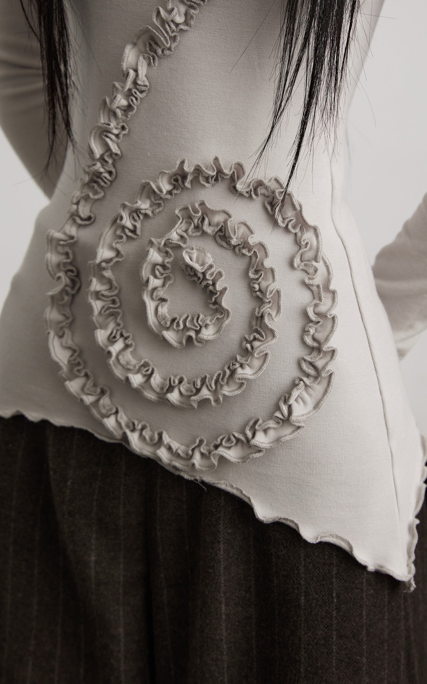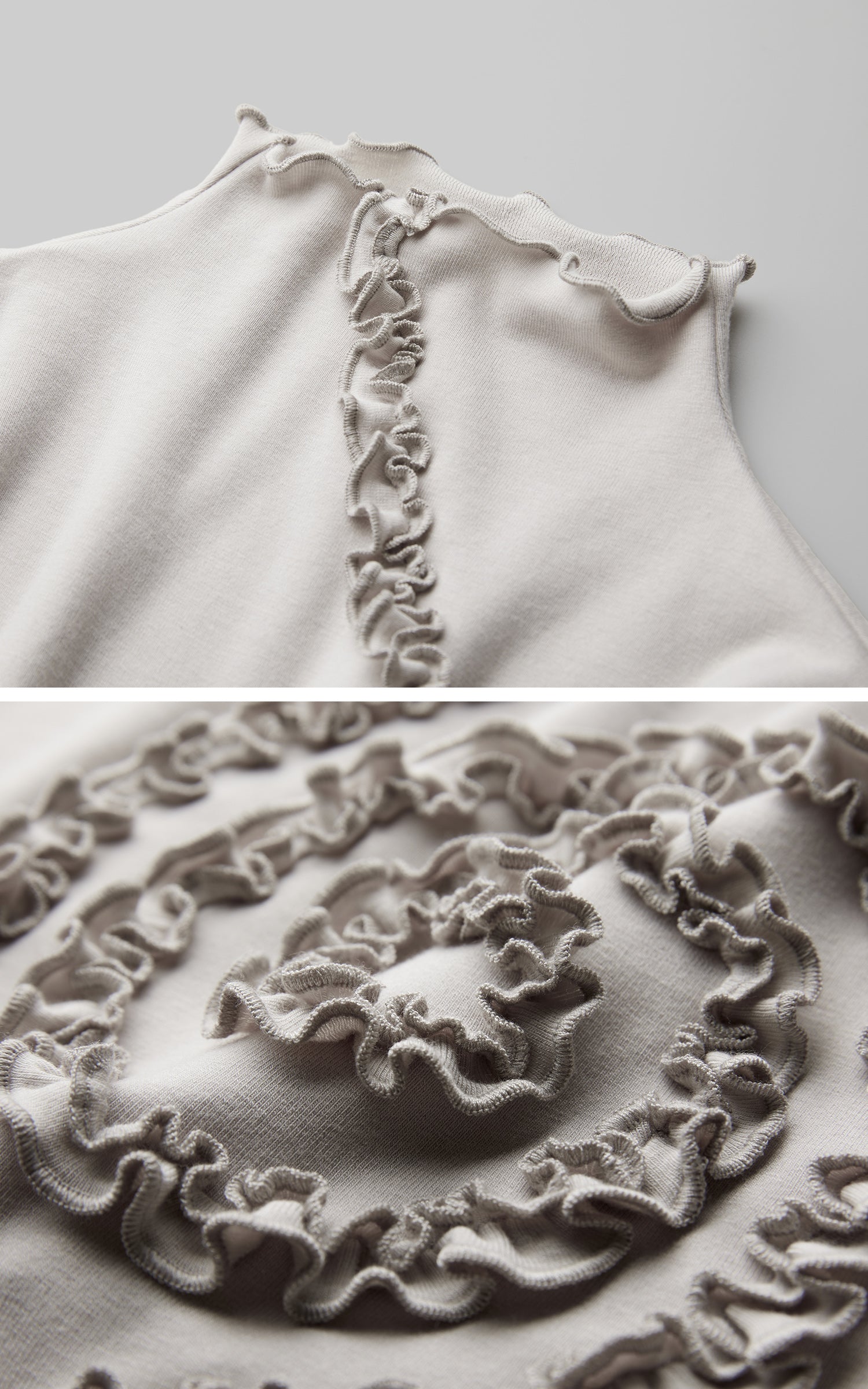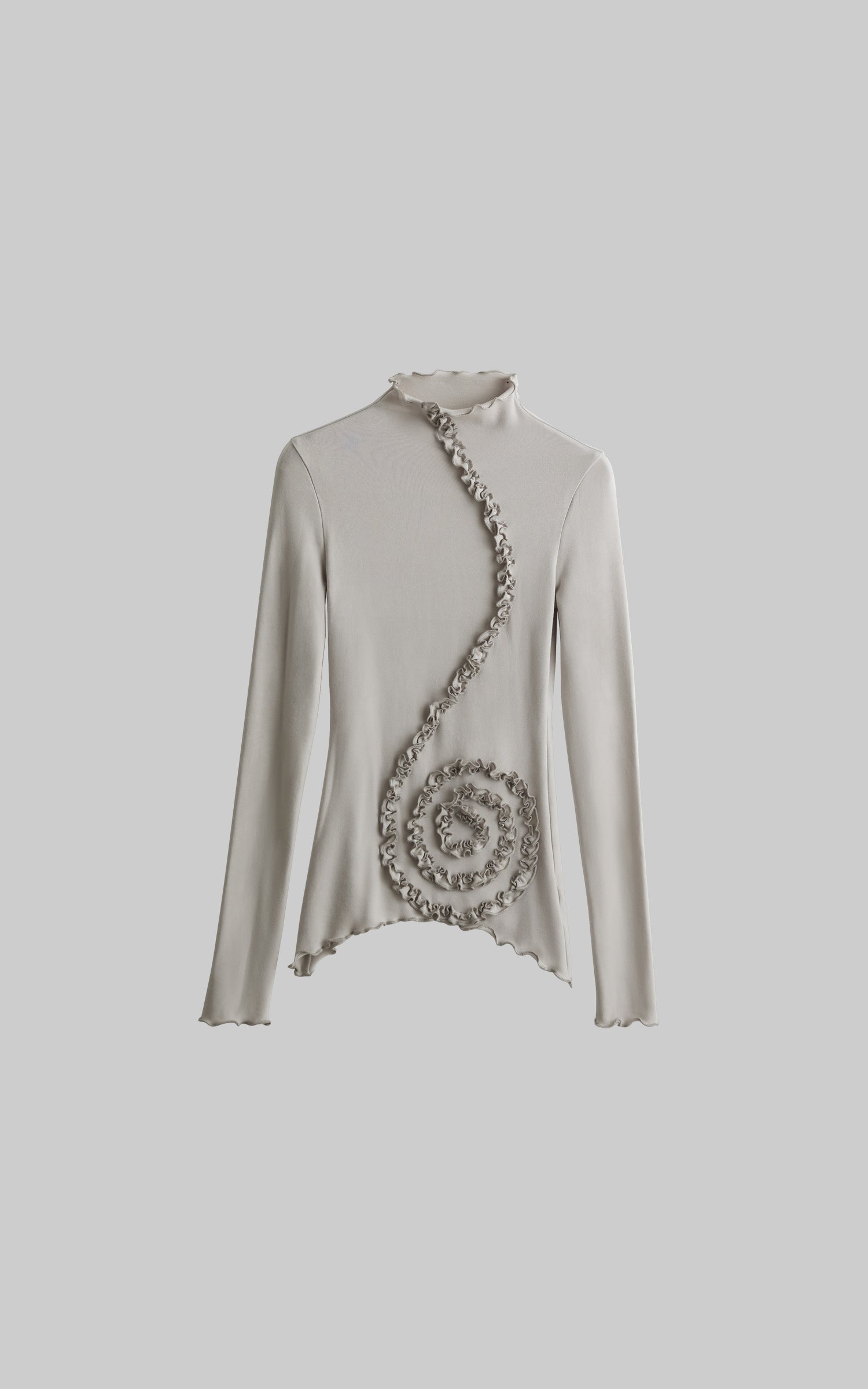 Eine figurbetonte Silhouette folgt dem Körper mit leiser Präzision, während eine unregelmäßige Raffung diagonal über die Oberfläche verläuft und ein zurückhaltendes Gefühl von Bewegung erzeugt. Der leichte Stoff liegt eng an der Haut an und ist mit sanft gerollten Kanten versehen, die starre Strukturen auflösen. Subtil und introspektiv, funktioniert das Stück allein oder als geschichtete Grundlage in dunklen, skulpturalen Looks.