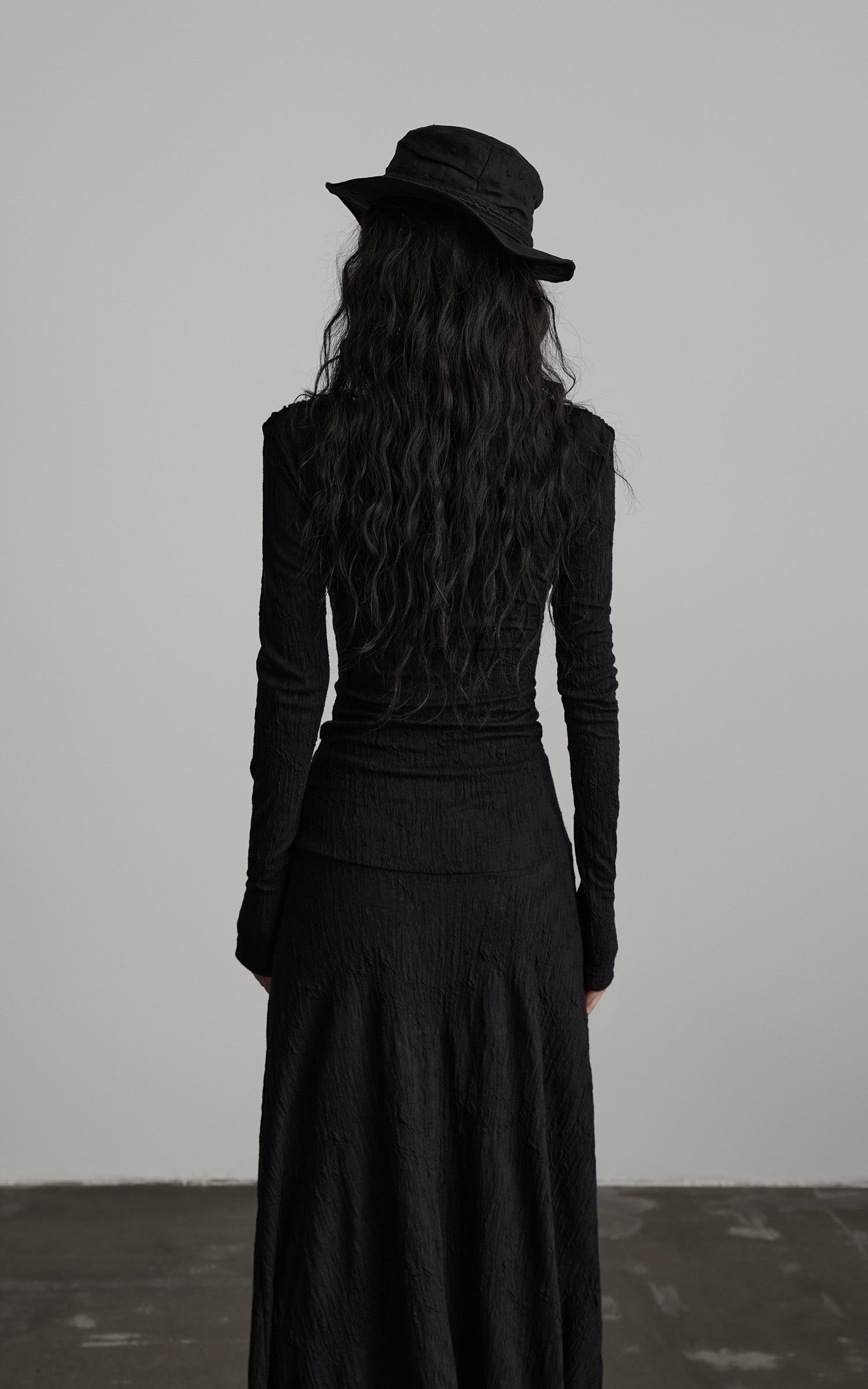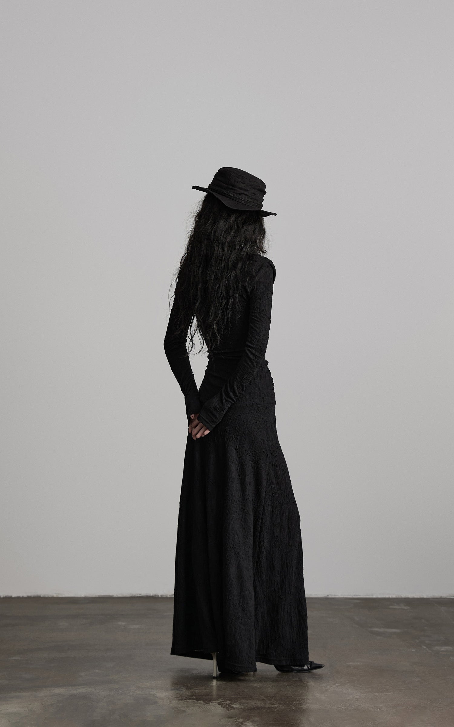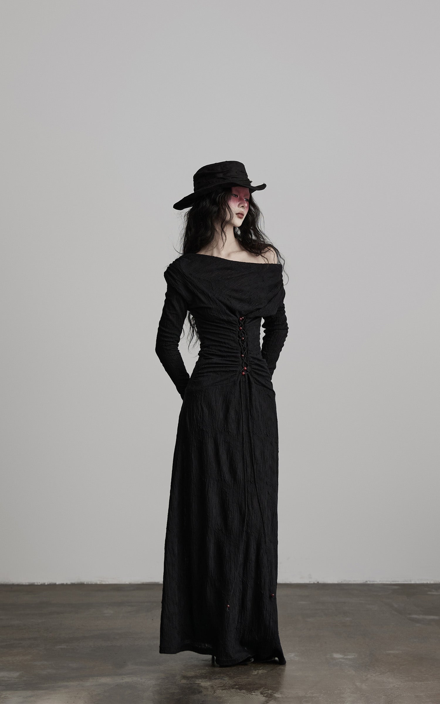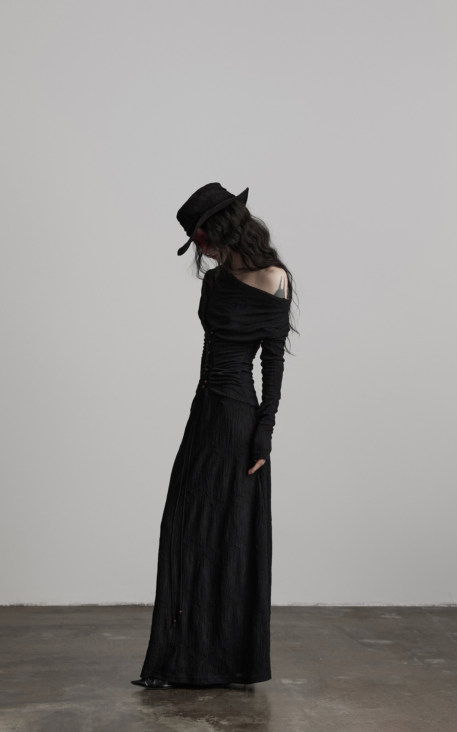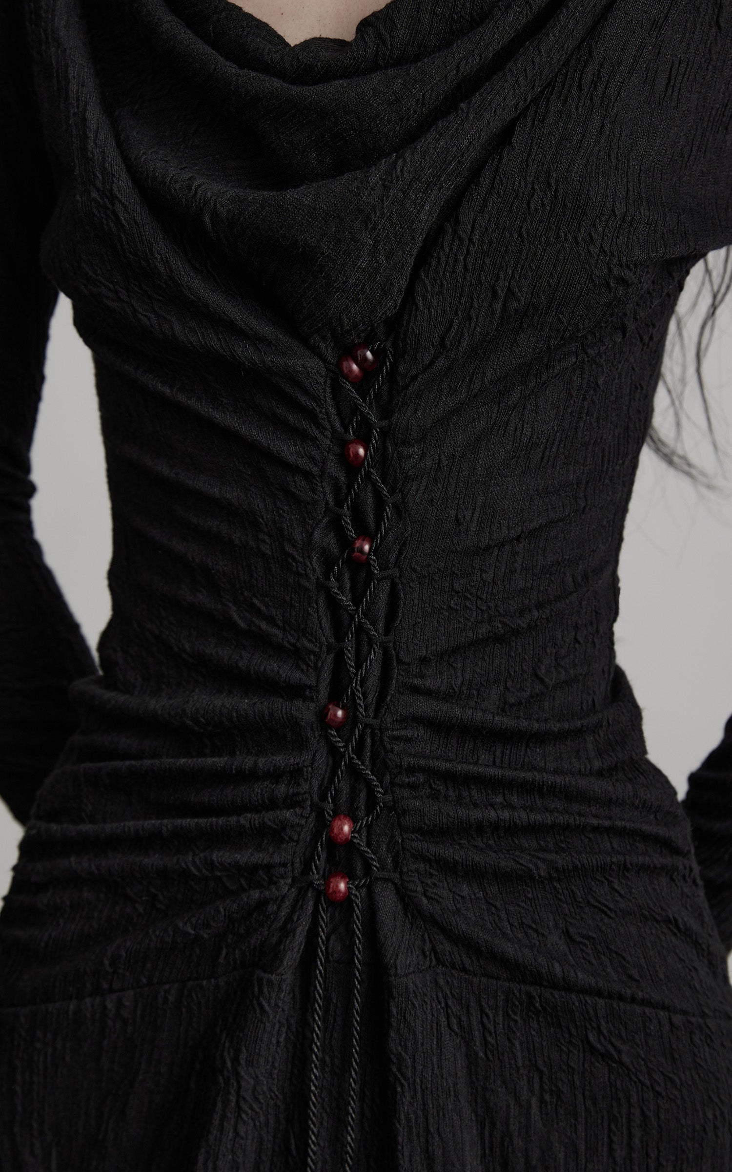 Eine lange Silhouette aus strukturiertem schwarzem Stoff, geformt durch kontrolliertes Rüschen und einen fließend drapierten Ausschnitt. Die vorderseitige, korsett-inspirierte Schnürung zieht die Form nach innen, markiert mit kleinen, karmesinroten Perlen, die die Dunkelheit wie stille Glutpunkte durchbrechen. Die Ärmel erstrecken sich mit einer verlängerten, fast zeremoniellen Linie und treffen auf einen Rock, der mit klösterlicher Zurückhaltung gerade bis zum Boden fällt. Ein Stück, das eine leise, schattige Präsenz schafft—strukturiert, weich und leicht wild in der Bewegung.