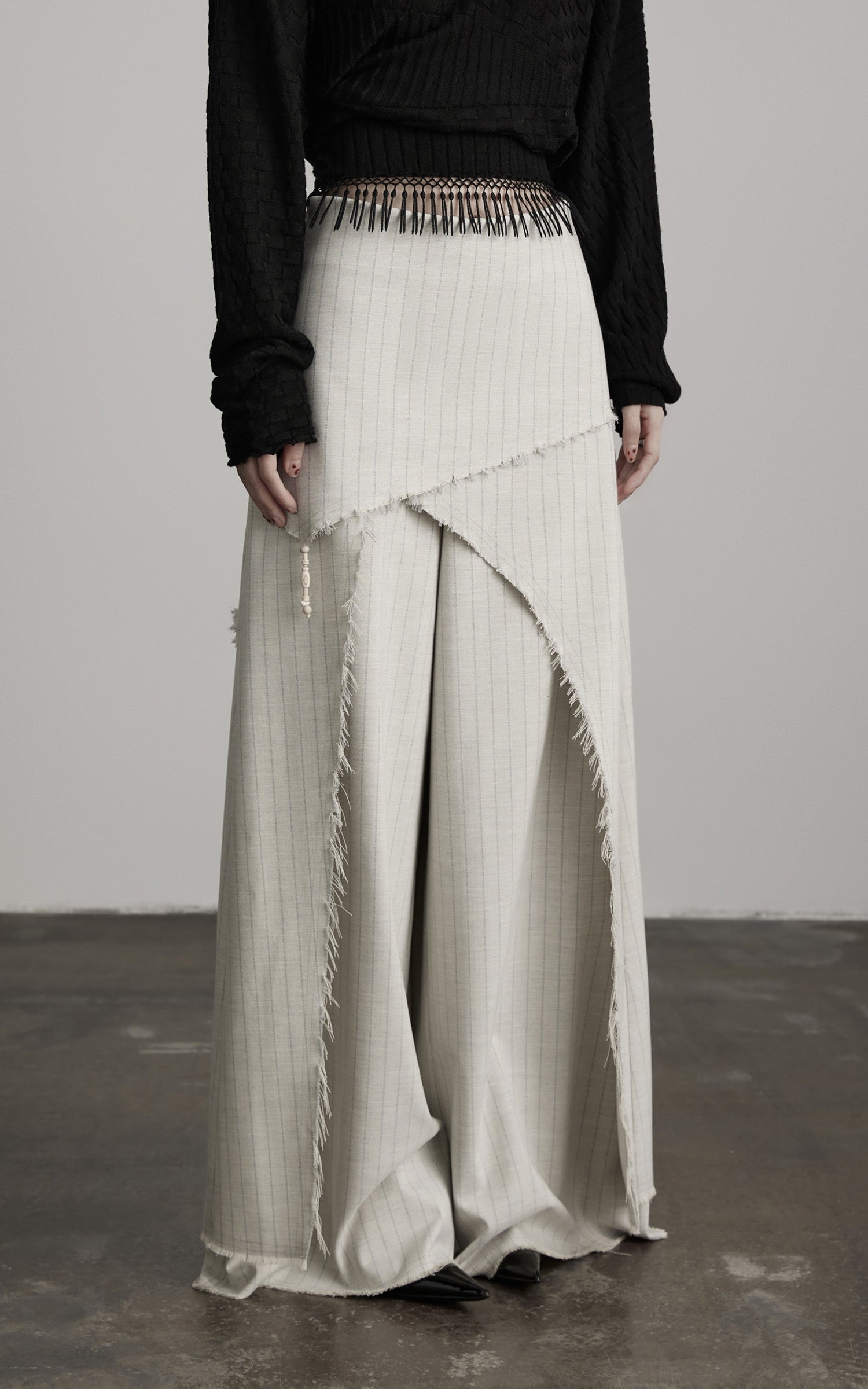 Une jupe-pantalon hybride à jambes larges déconstruite, construite avec des couches asymétriques et des contours coupés à cru. Le tissu à fines rayures douces drape avec un poids atténué, permettant à chaque panneau de se balancer avec une présence architecturale discrète. Les bords effilochés, les courbes fendues et une subtile déformation de la structure créent une silhouette qui semble à la fois sans contrainte et intentionnellement déformée. Conçu pour un mouvement fluide et un style atmosphérique, il fusionne la discipline de la couture avec la liberté des formes démantelées.