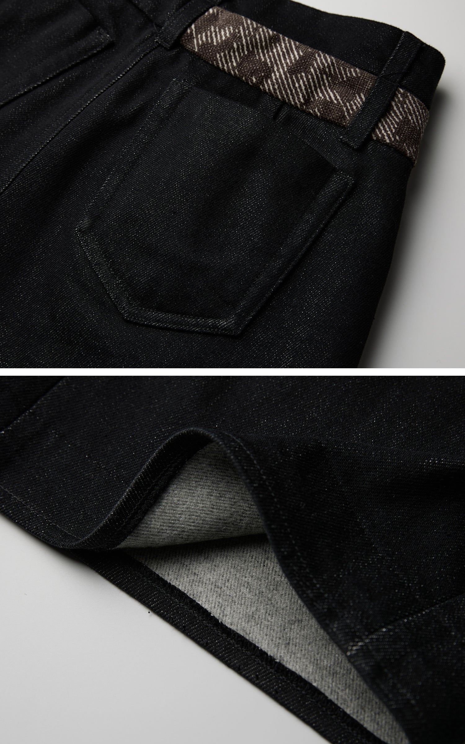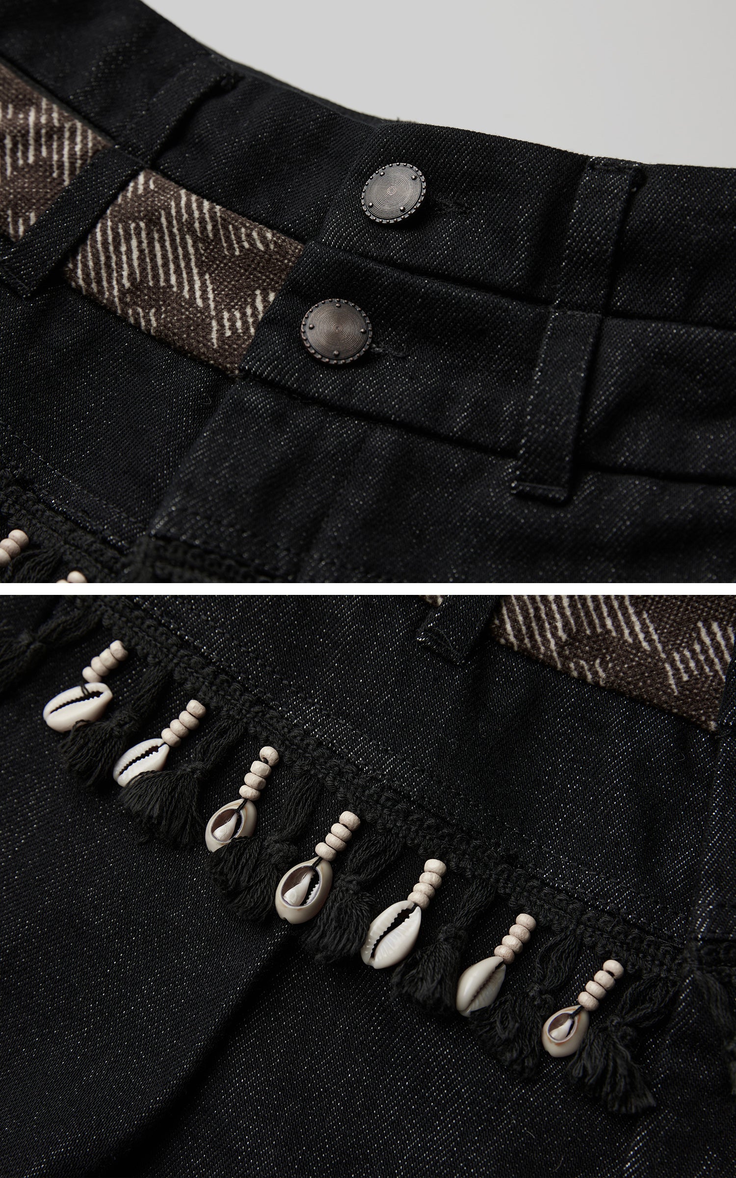 Pantalon large coupé dans un denim dense, façonné par une construction de ceinture superposée et accentué par des détails en bordure de coquillage le long de la ligne de la hanche, créant une silhouette ancrée avec un poids contrôlé et un mouvement subtil. Le tissu maintient la structure tout en permettant un drapé naturel, équilibrant l'ornementation brute avec retenue et présentant une présence délibérée et discrète plutôt qu'une décoration ostentatoire.