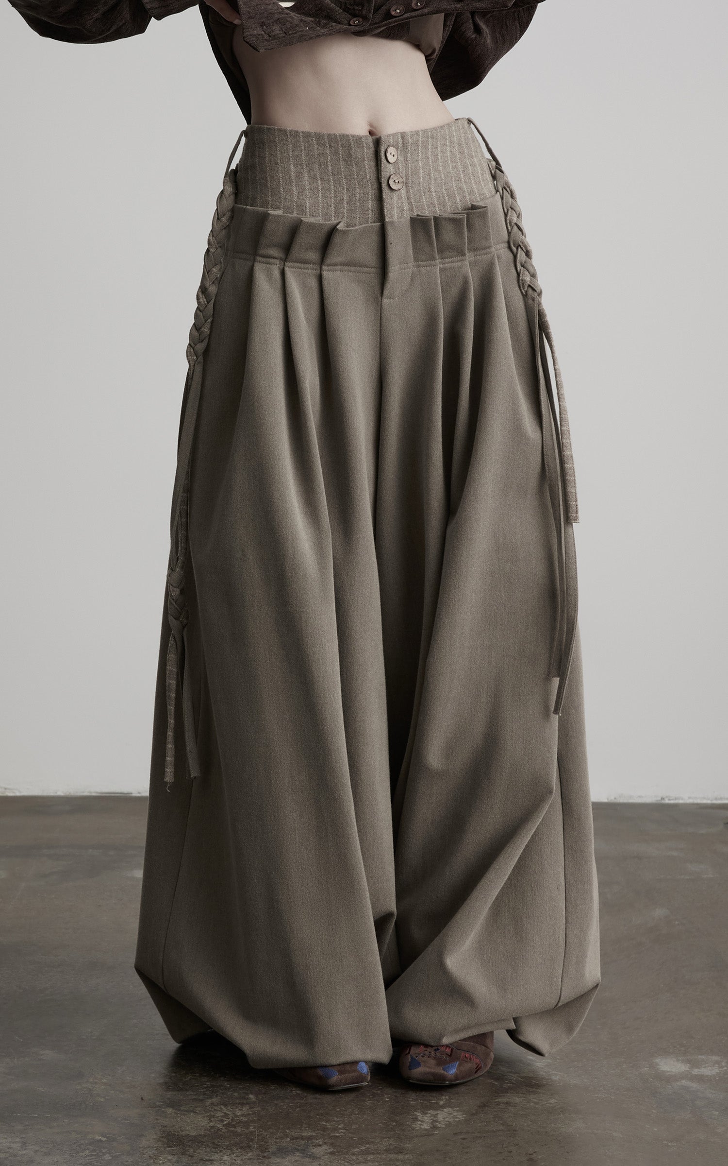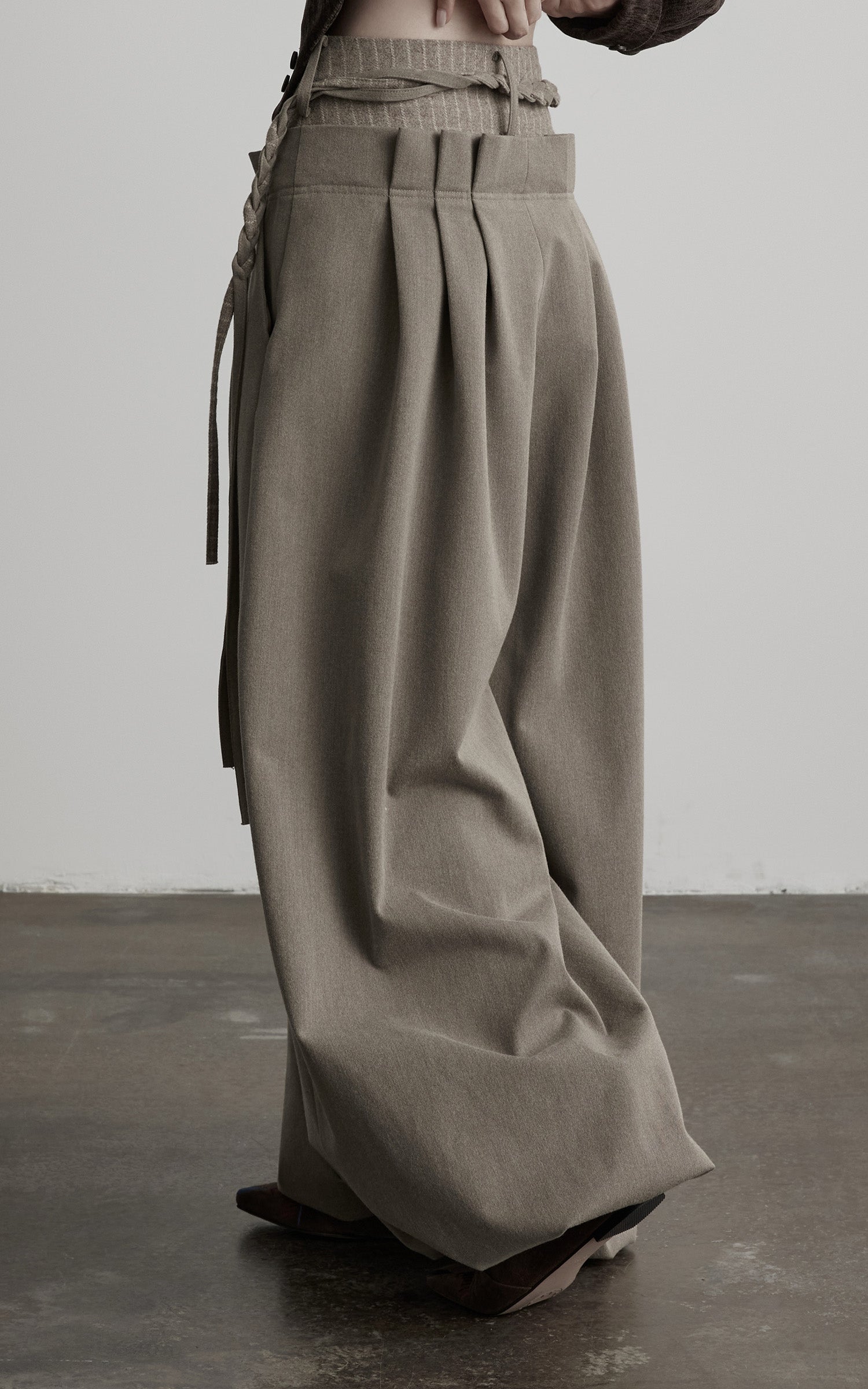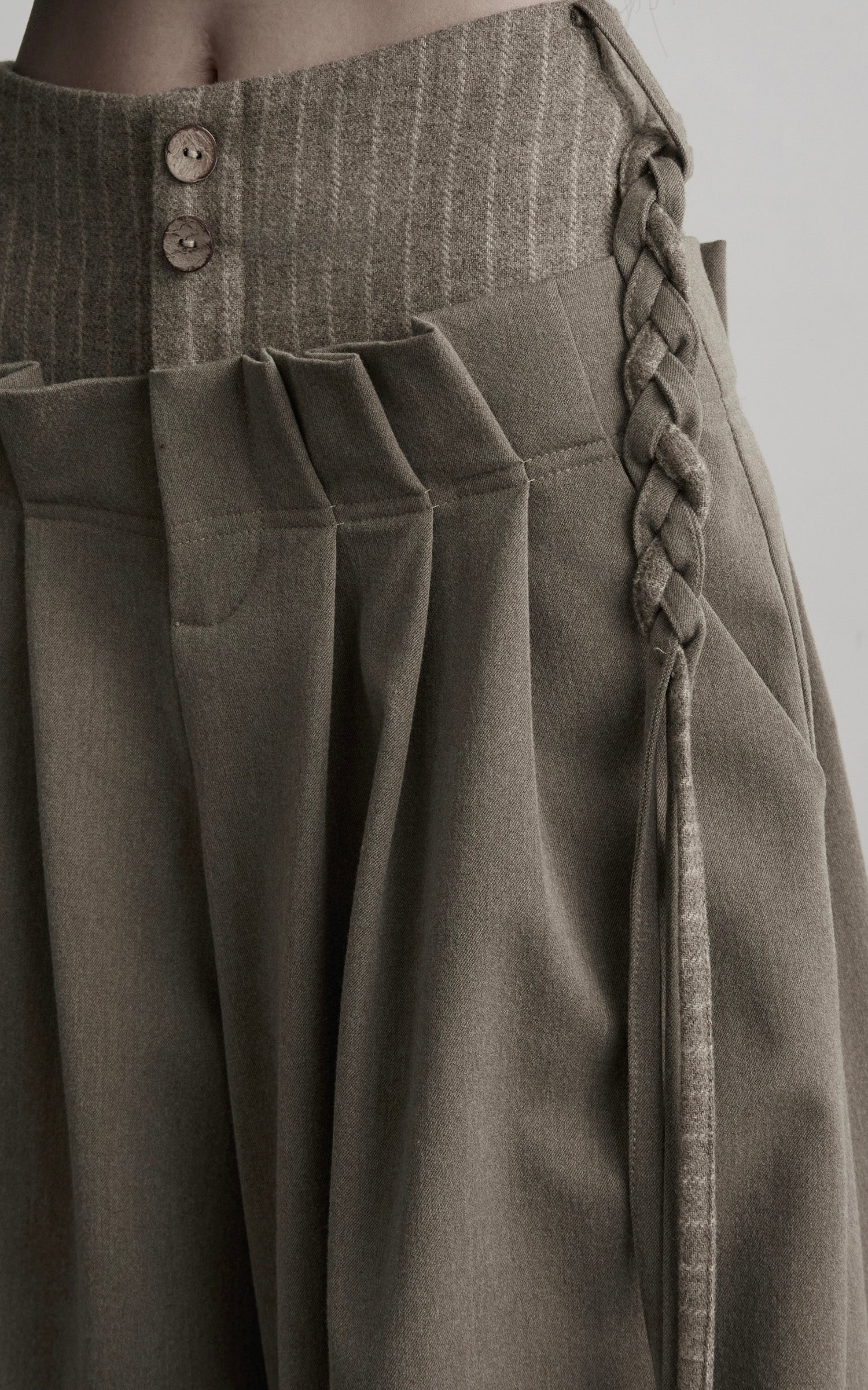 これらのハイウエストパンツは、たっぷりとしたプリーツとワイドレッグのシルエットで形作られ、地に足のついた伸びやかなプロポーションを生み出します。ウエストバンドは、コントラストの効いたストライプのパネルとボタン留めで仕上げられ、構造を精密に定義しています。編み込まれたサイドタイは、控えめな形に自然な動きを加えながら、ヒップに沿って落ちます。生地は柔らかい重みを持ち、動きに合わせてボリュームが優しく変化し、ギャザーの入った裾が輪郭を柔らかくし、制御と流動性を調和させた構築的で彫刻的なデザインを実現しています。