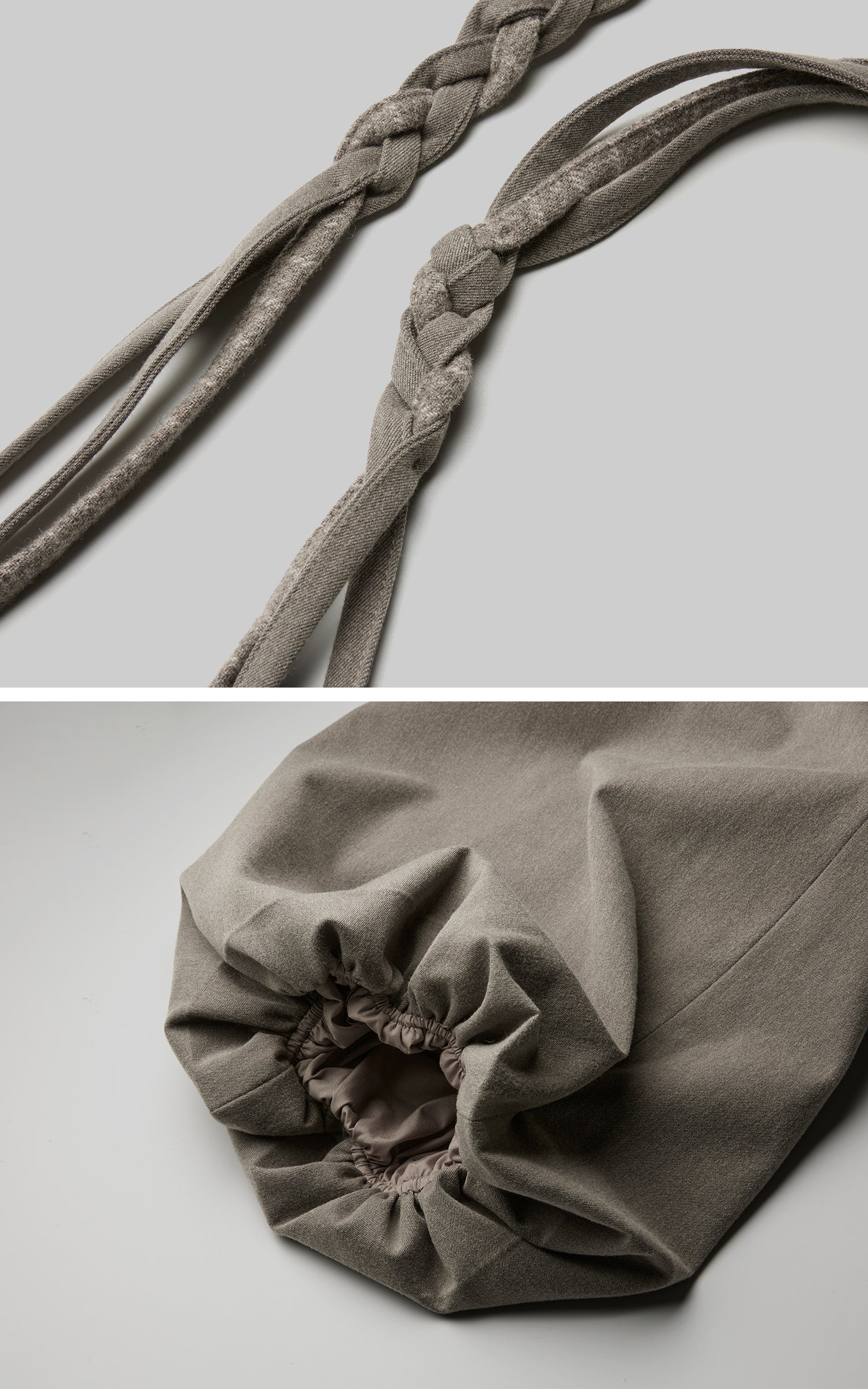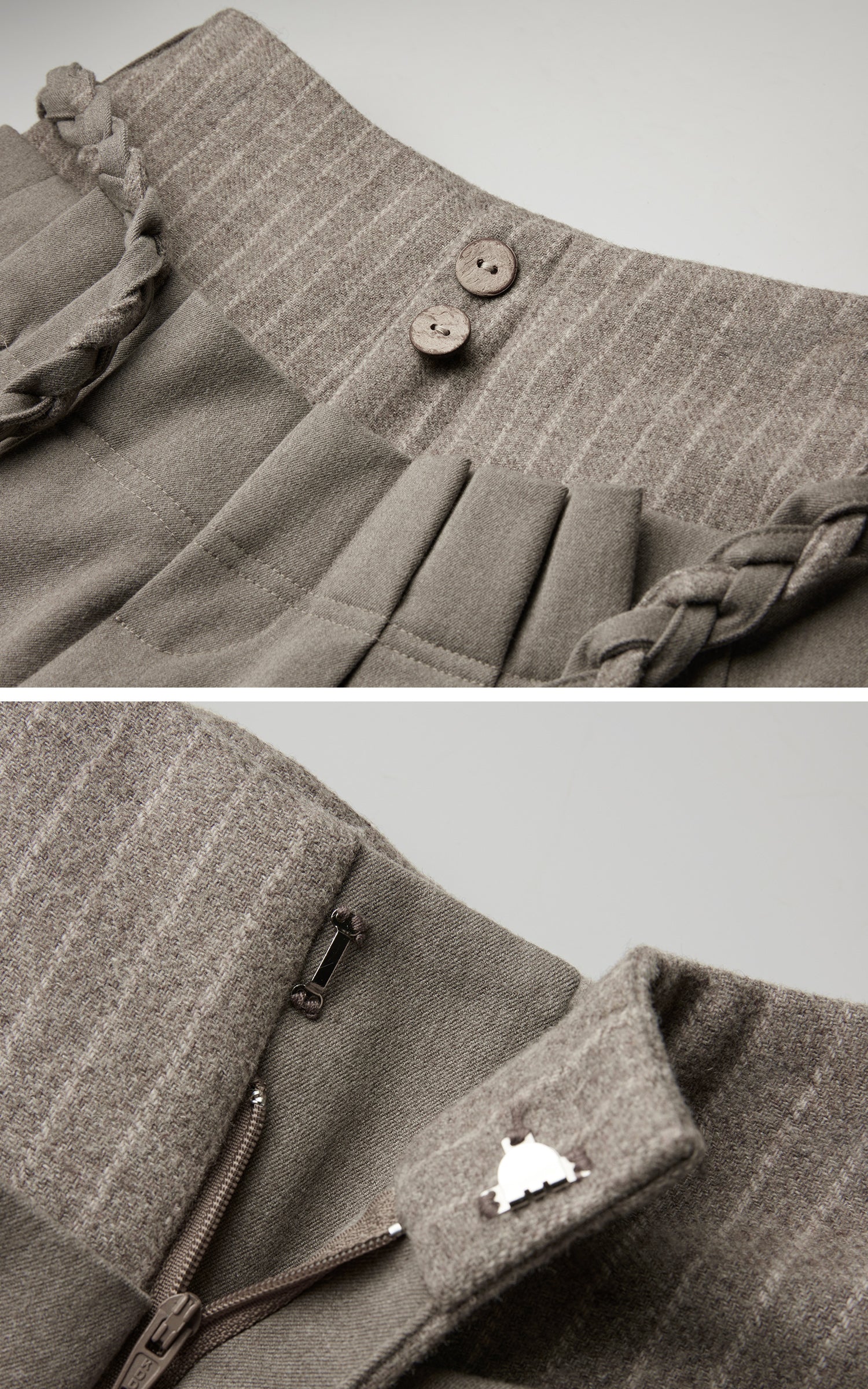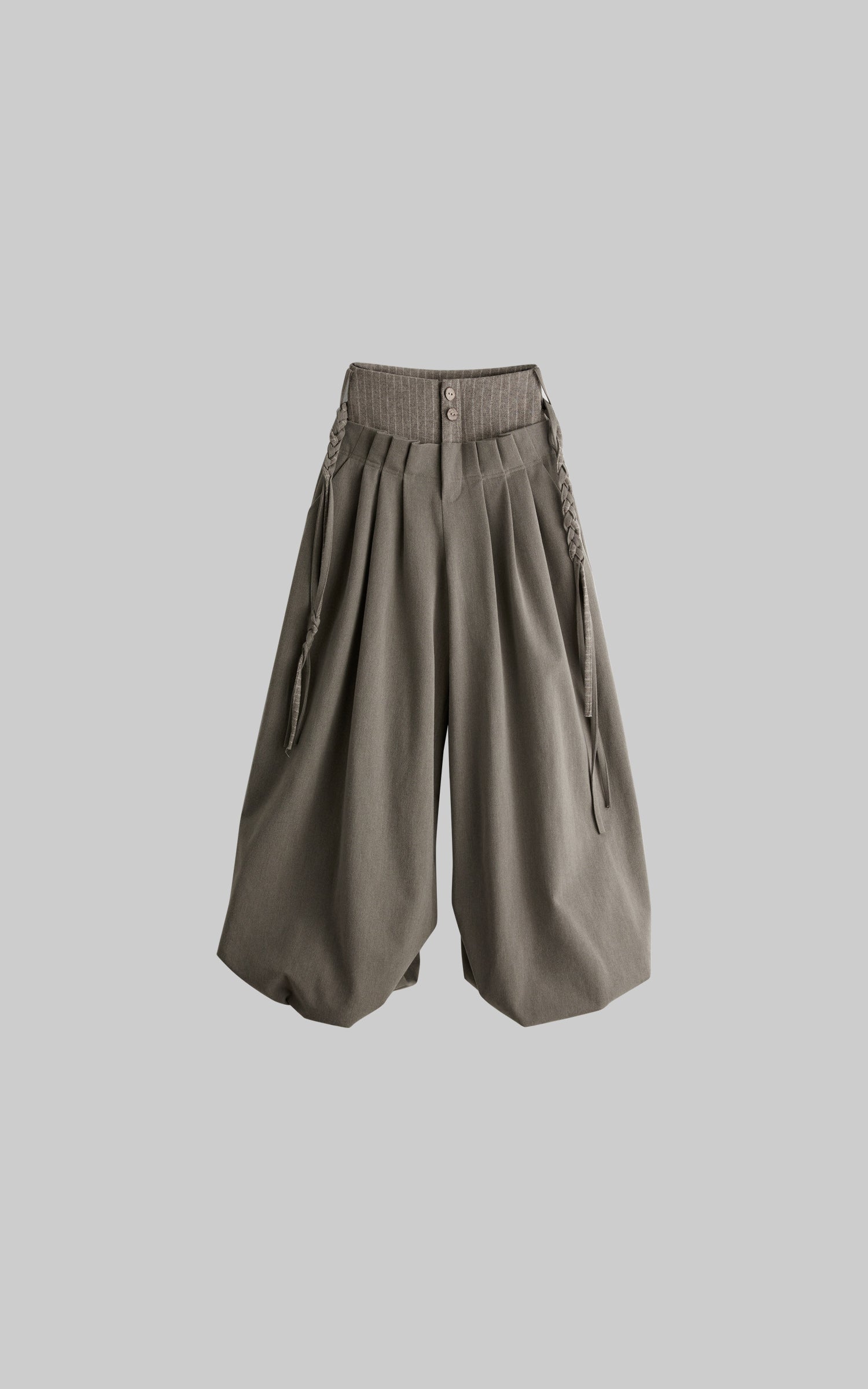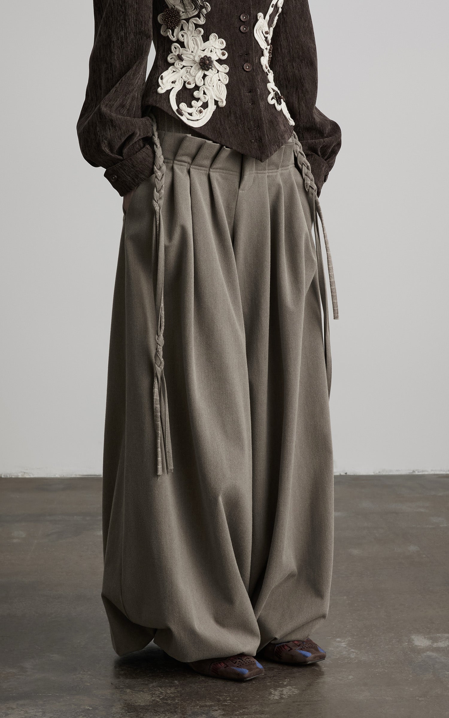 これらのハイウエストパンツは、たっぷりとしたプリーツとワイドレッグのシルエットで形作られ、地に足のついた伸びやかなプロポーションを生み出します。ウエストバンドは、コントラストの効いたストライプのパネルとボタン留めで仕上げられ、構造を精密に定義しています。編み込まれたサイドタイは、控えめな形に自然な動きを加えながら、ヒップに沿って落ちます。生地は柔らかい重みを持ち、動きに合わせてボリュームが優しく変化し、ギャザーの入った裾が輪郭を柔らかくし、制御と流動性を調和させた構築的で彫刻的なデザインを実現しています。