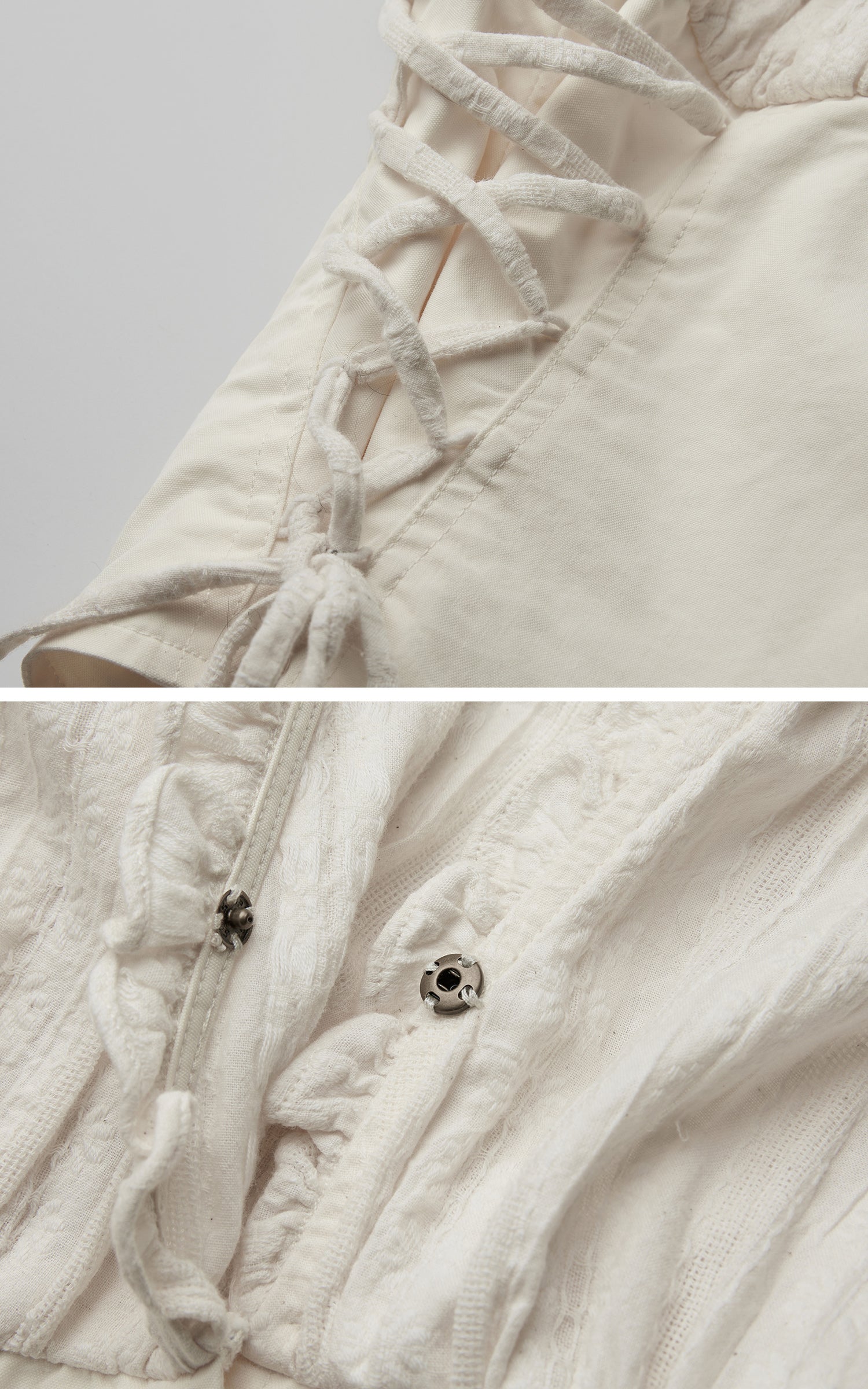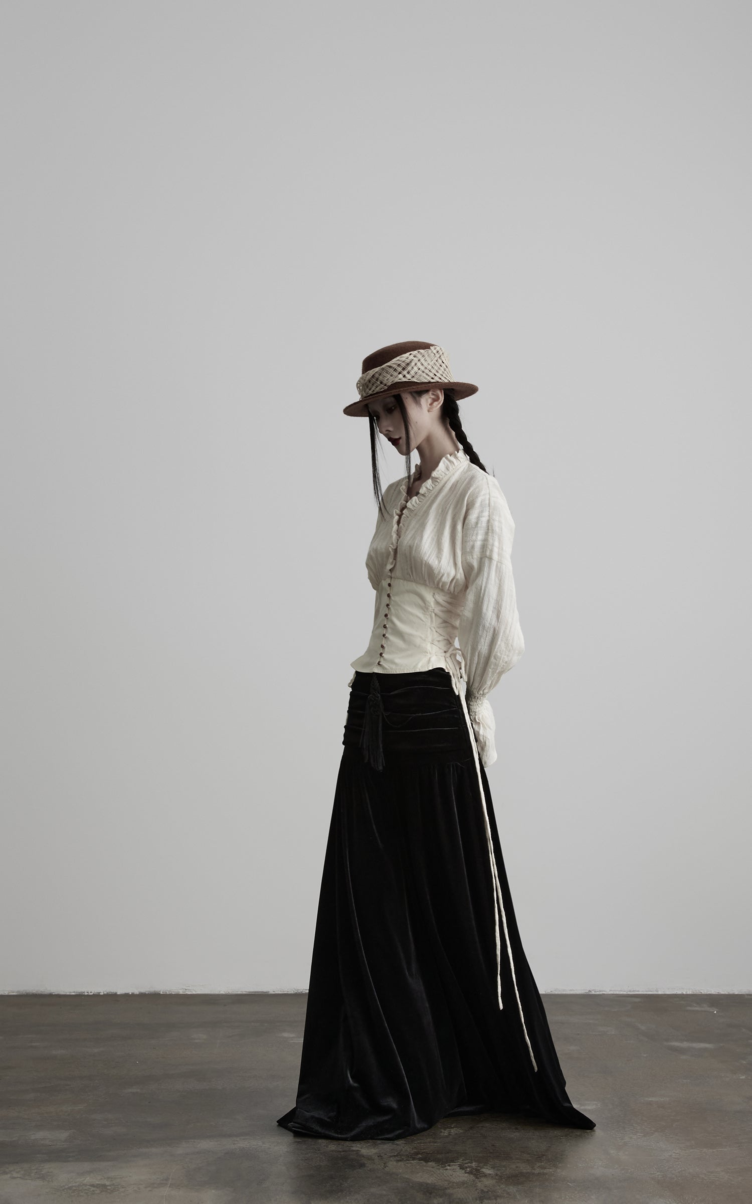 クラシックなシャツのフレームワークから始まり、シルエットはウエストで鋭く絞られ、コルセットのような構造を形成し、静かな緊張感で体を再形成します。上部は軽量でテクスチャーのある生地で仕上げられ、柔らかなギャザーが呼吸や動きに合わせて微妙に動き、硬直したboundaries.A しっかりとしたウエストパネルは、前面のボタンと調整可能なサイドのレースアップで固定され、抑制と柔らかさを一つの形でバランスさせます。フレアカフスが袖を流れるようなジェスチャーに延ばし、影と動きを増幅します。控えめでありながら意図的なこの作品は、彫刻的な衣服として単独で立つか、制御された強度でレイヤードコンポジションをアンカーします。