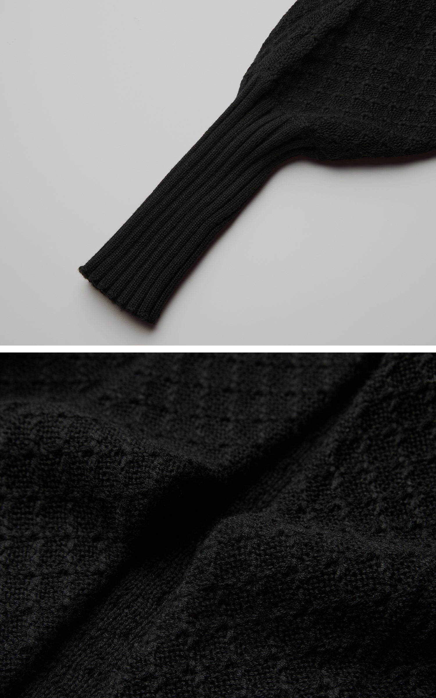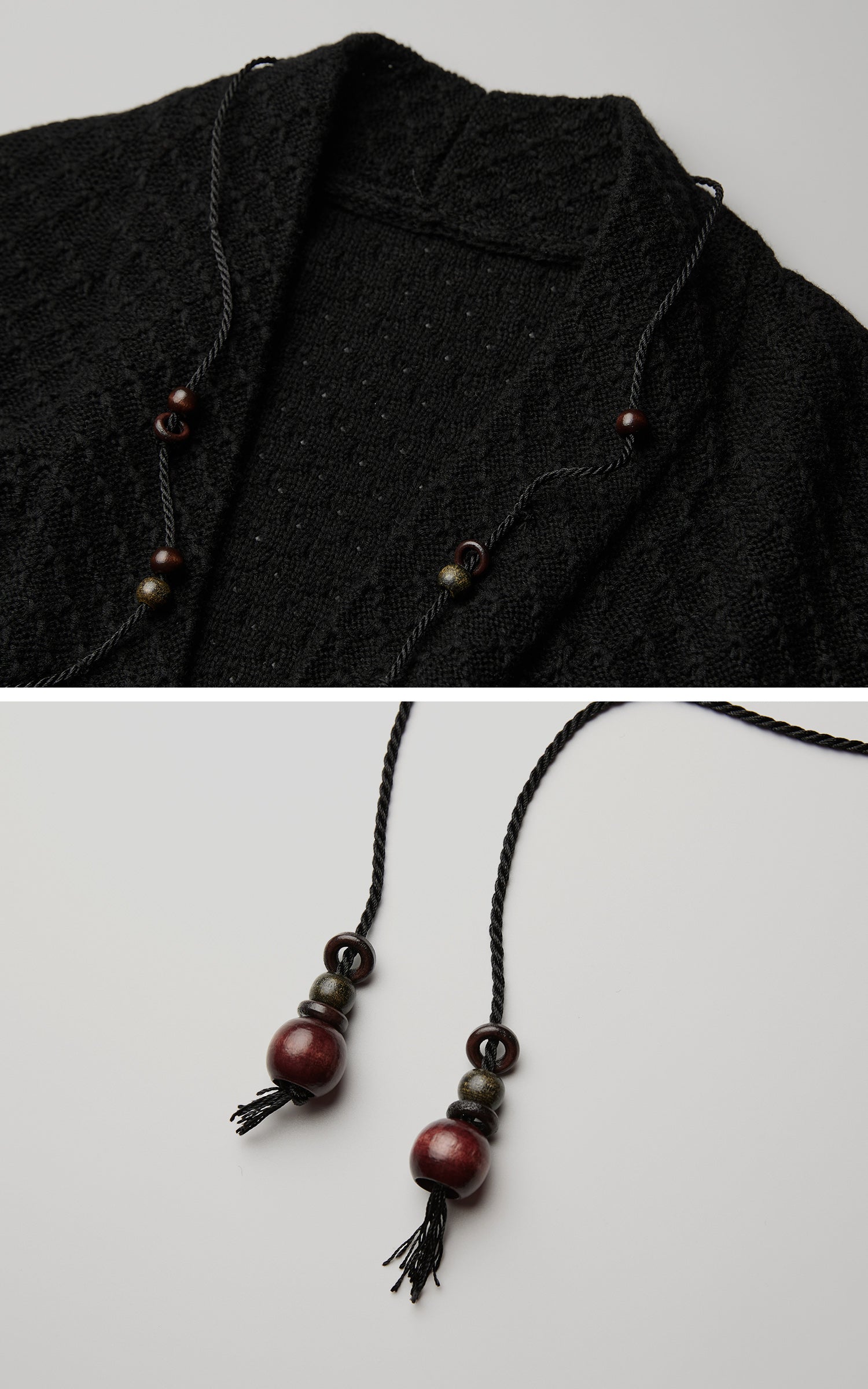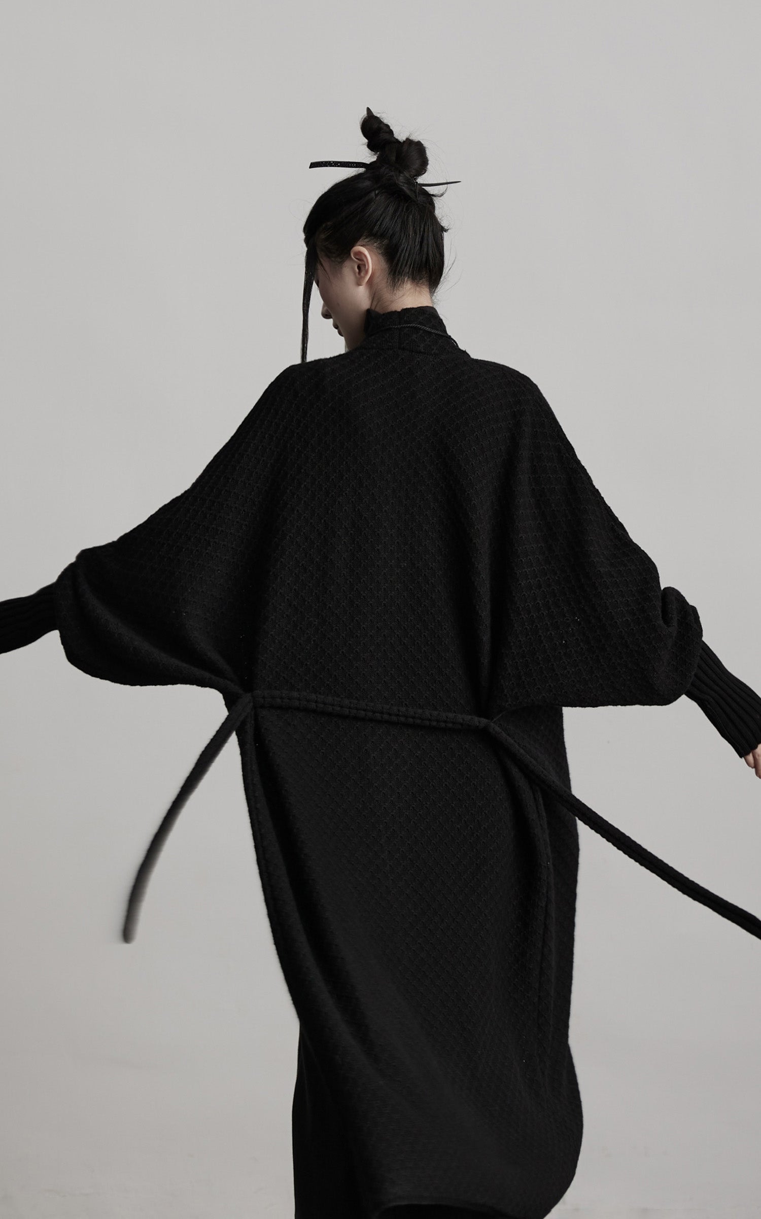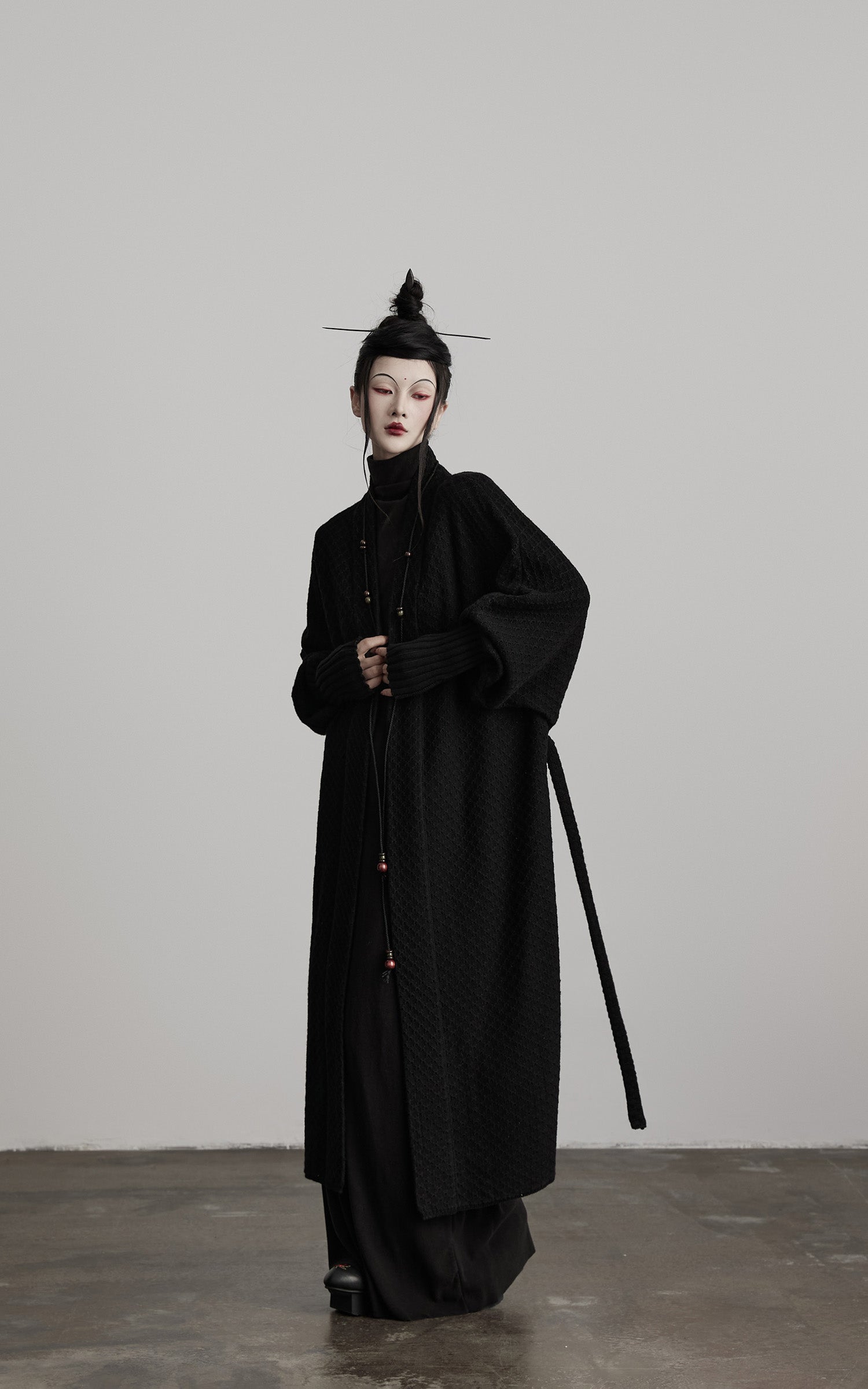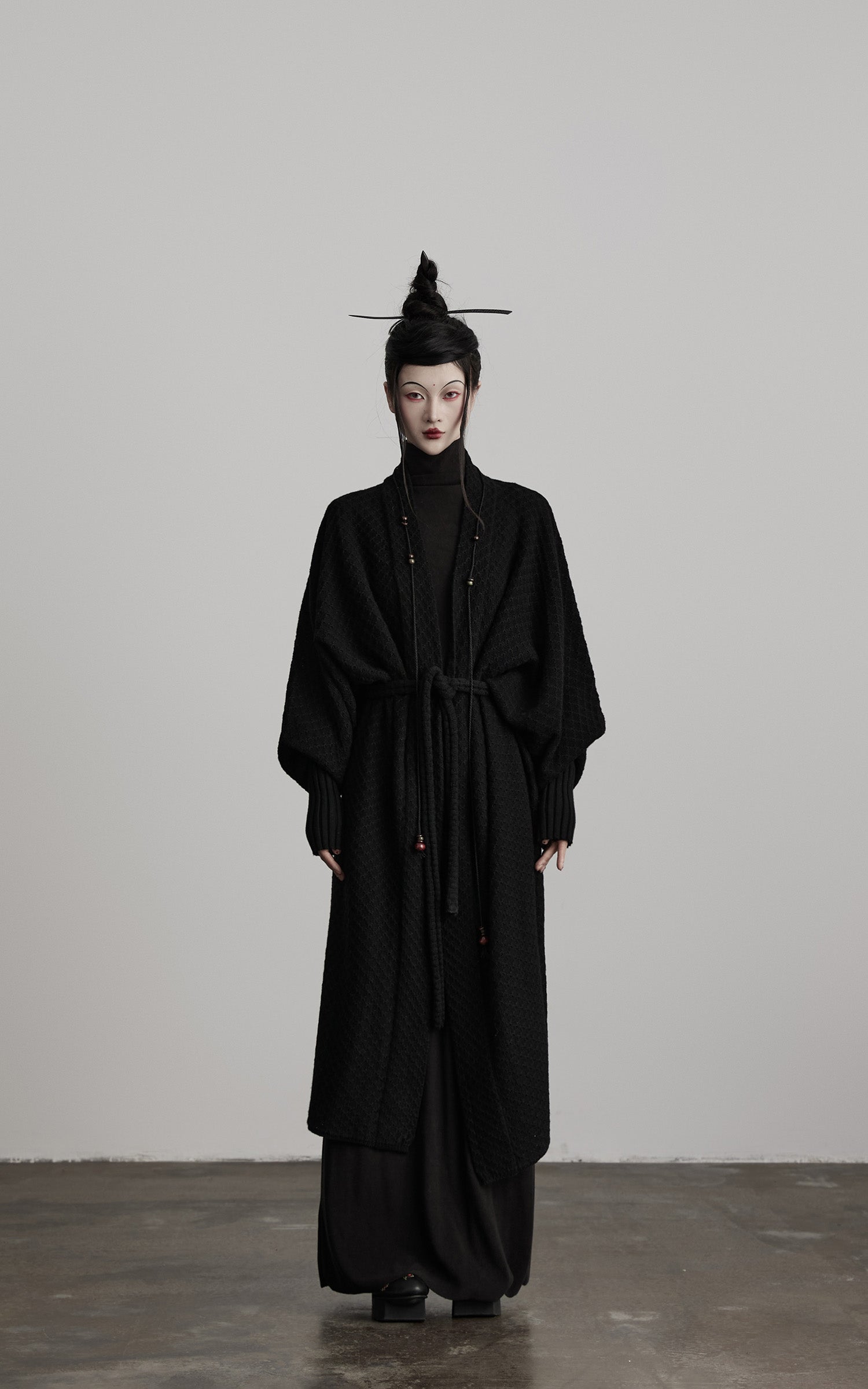 静かで一枚岩の存在感を持つ、長いニットカーディガン。そのテクスチャーのある表面と長く垂れるドレープは、重さを感じさせない鎧のような印象を与え、柔らかい構造は動きに合わせて優しく崩れます。リブ編みのカフスがシルエットに緊張感を加え、垂れ下がるビーズのコードが微妙な儀式的なディテールを導入します。レイヤード表現のためにデザインされ、抑制と拡張の間を行き来し、体を影と深みで包み込む形を形成します。