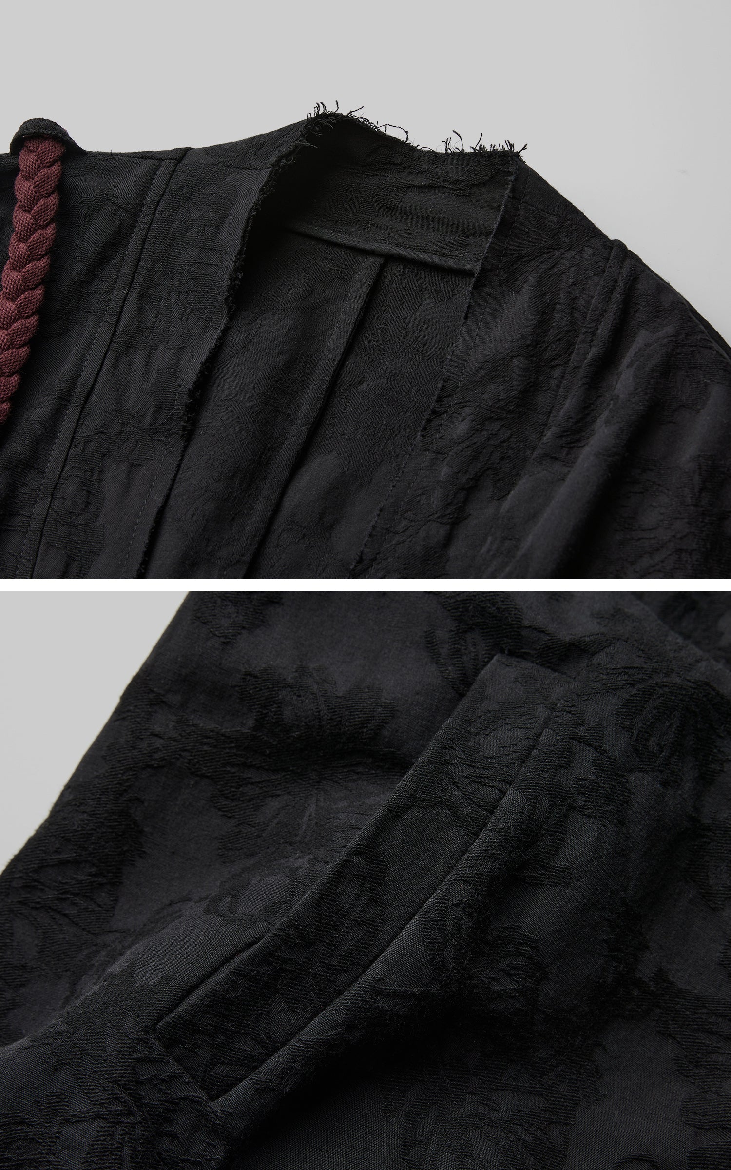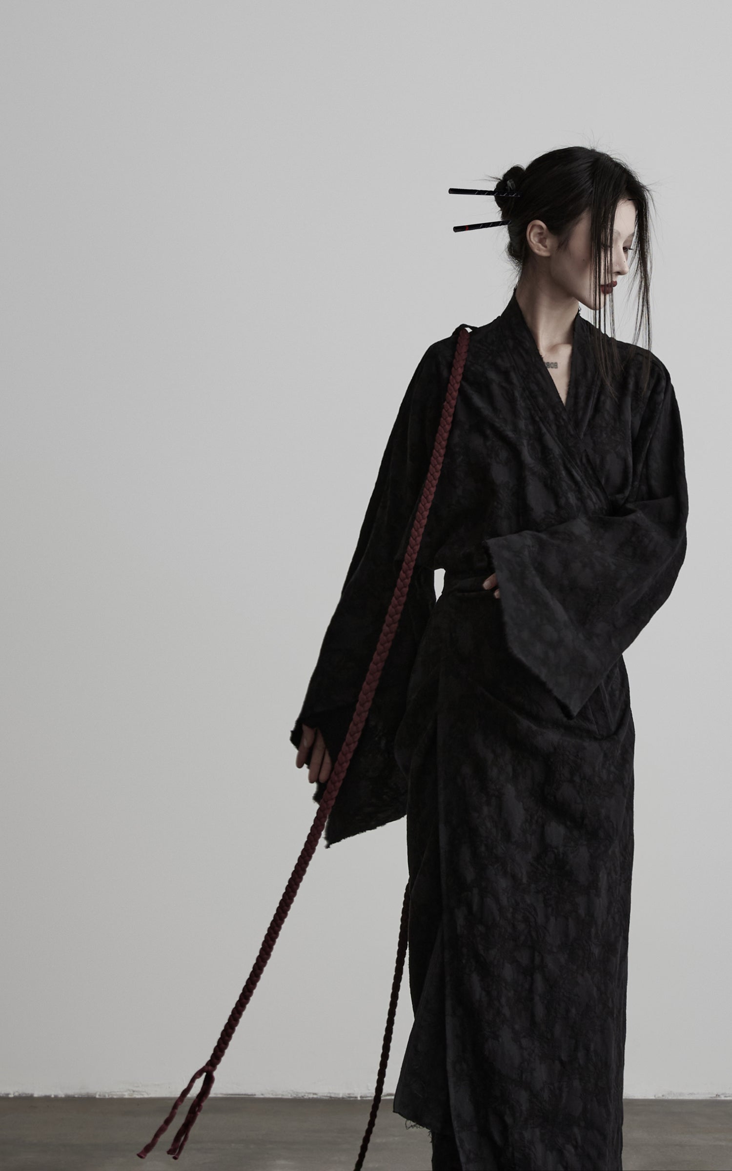 Wide sleeves amplify movement with each gesture, while the adjustable waist tie extends into irregular trailing lines, balancing function and ornament. The overall presence feels isolated, calm, and deliberate—equally striking worn alone or layered, existing as a silent yet sharp statement within the look.