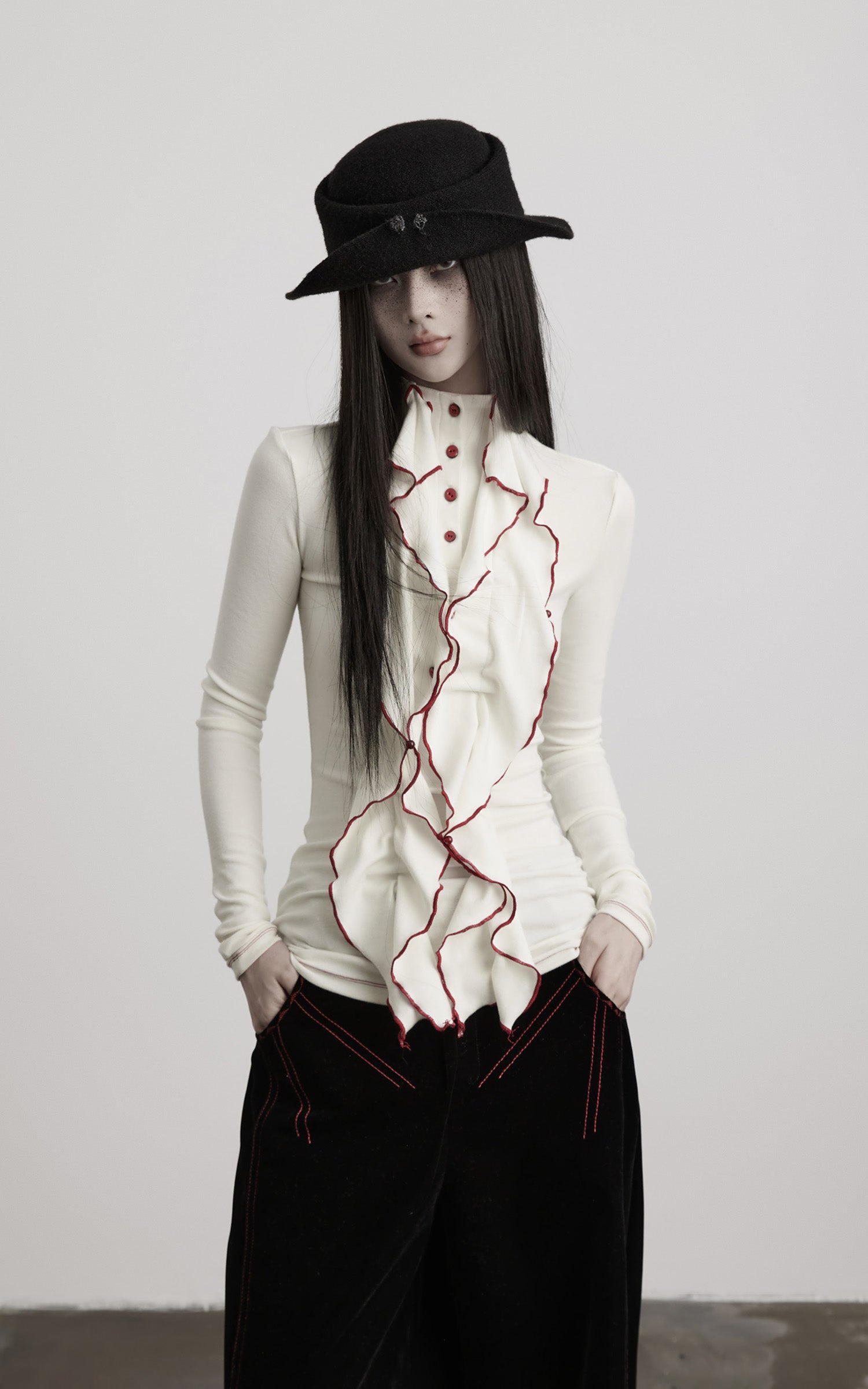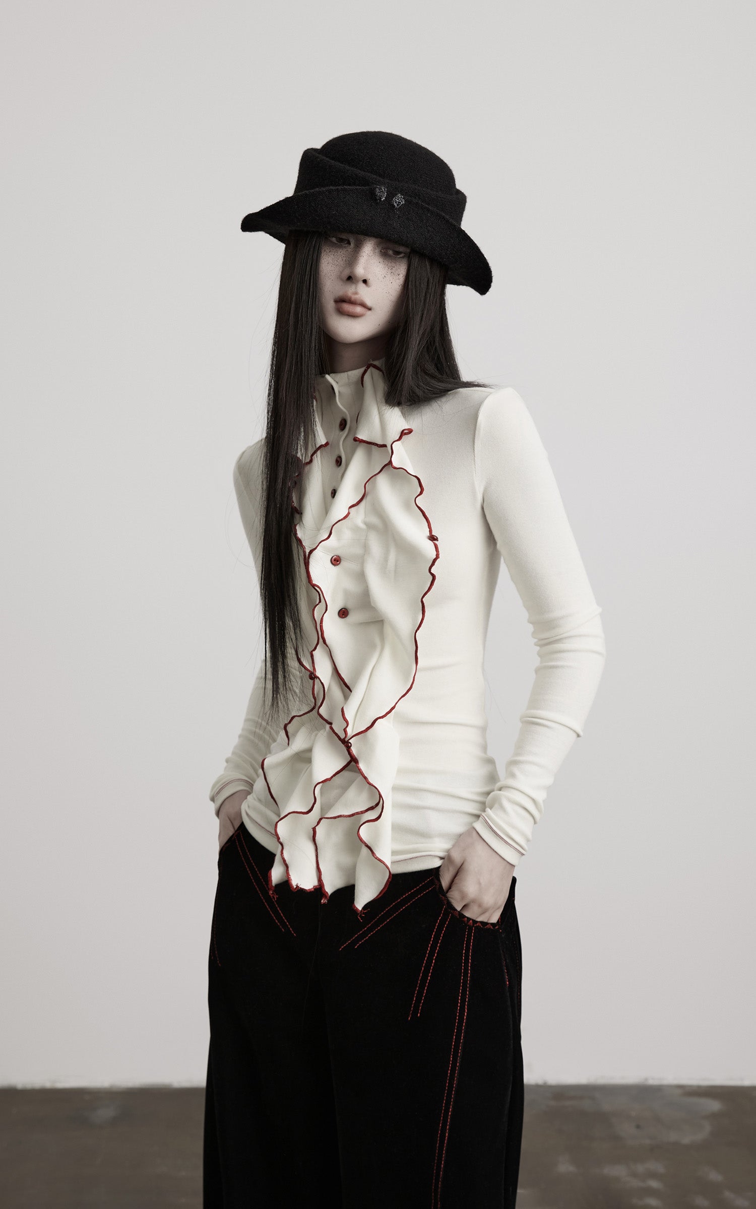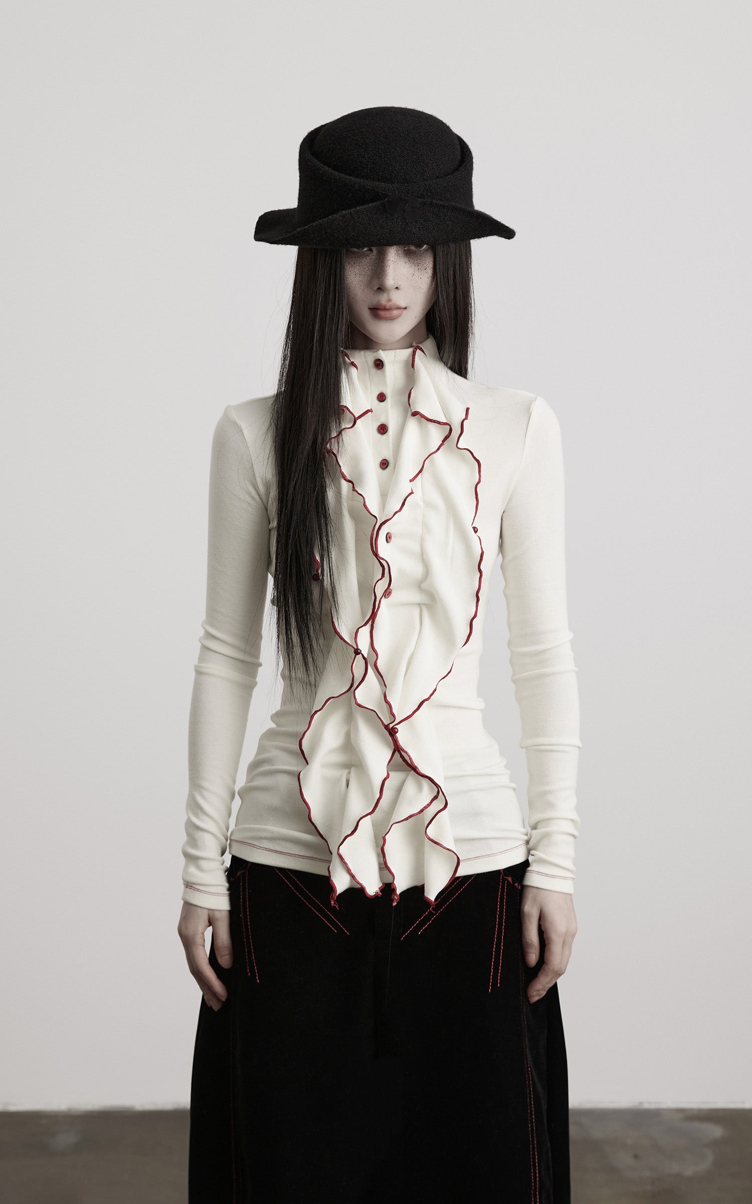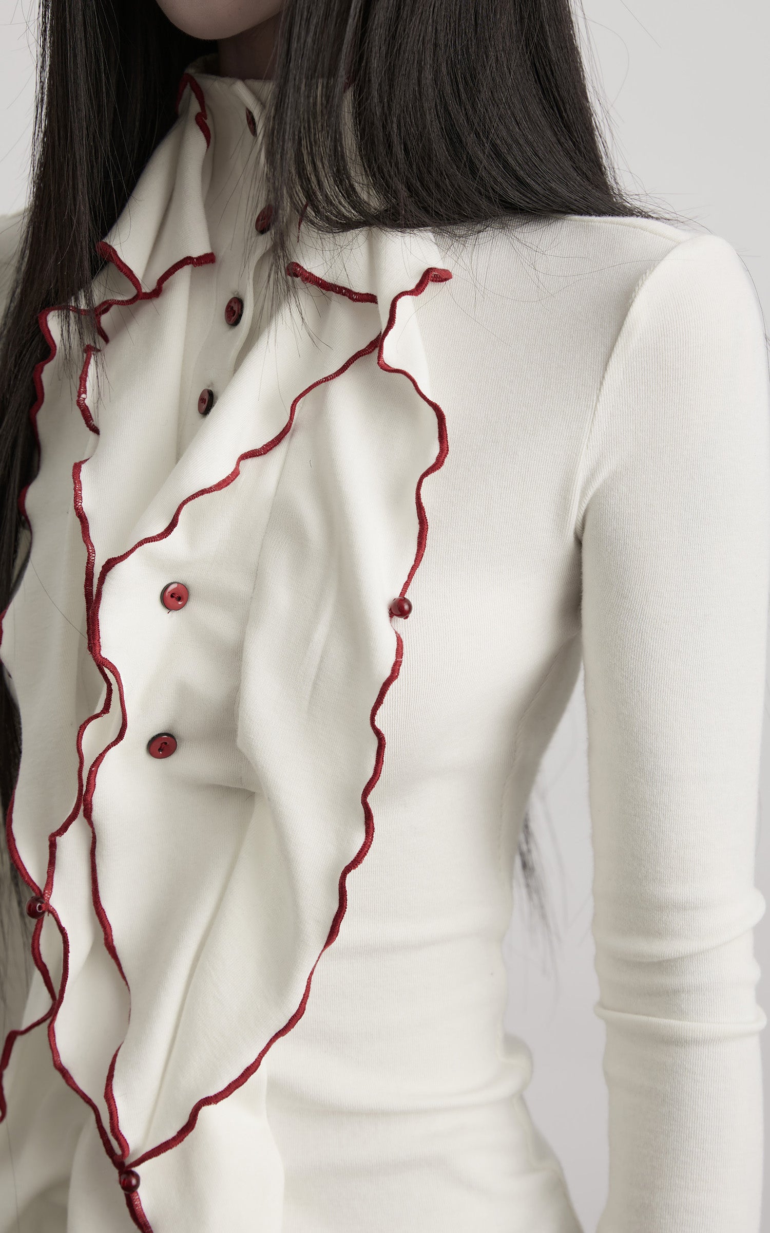 An asymmetrical ruffled panel descends from the collar, tracing an unsettled vertical line across the body. The fitted silhouette contours the torso with precision, extending proportion while retaining tension. A structured high neck and buttoned front establish restraint, disrupted by exposed contrast stitching along the edges. Soft yet resilient, the fabric moves fluidly with the body—designed to stand alone or serve as a sharp inner layer within a composed, architectural look.