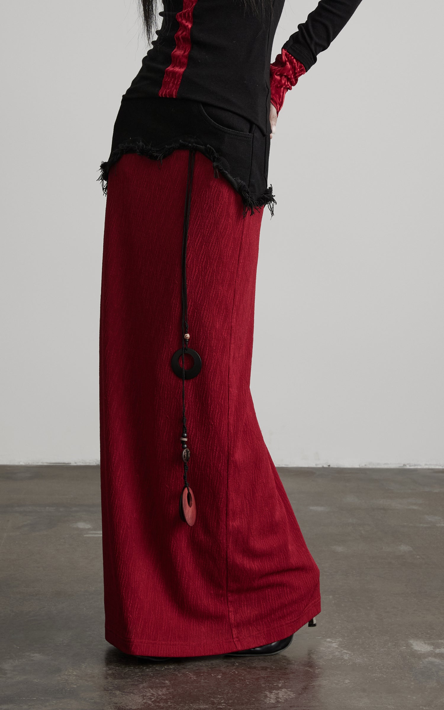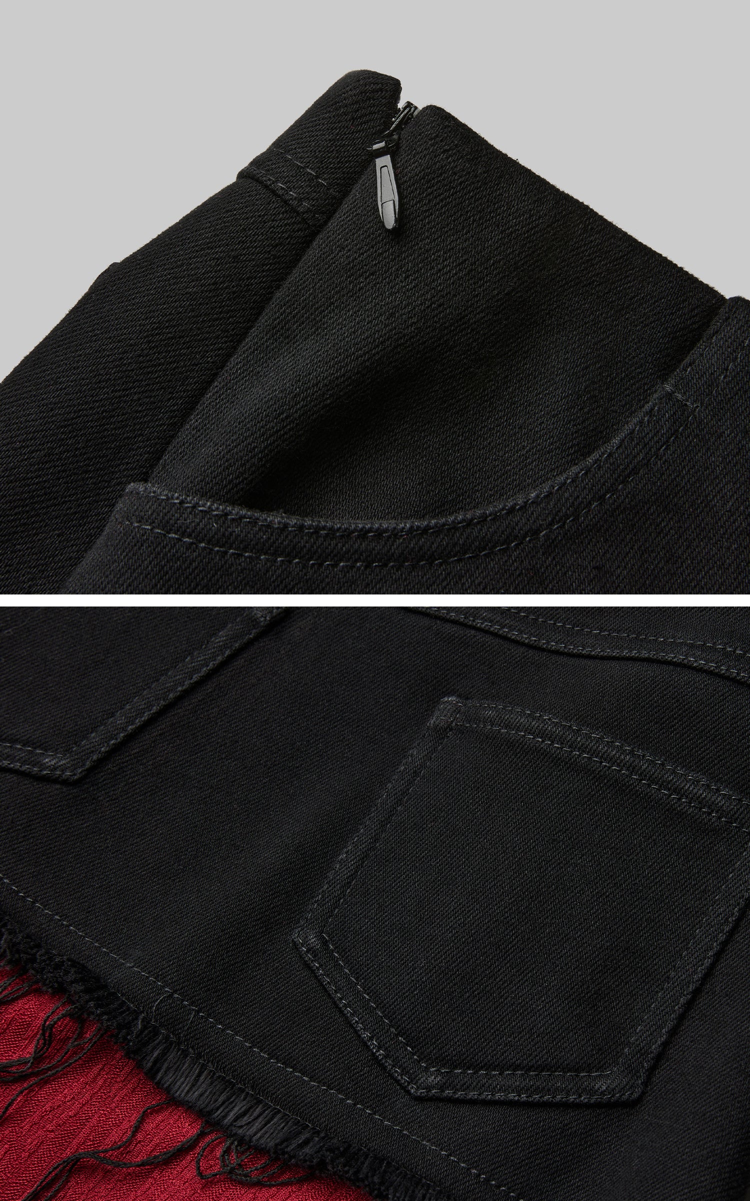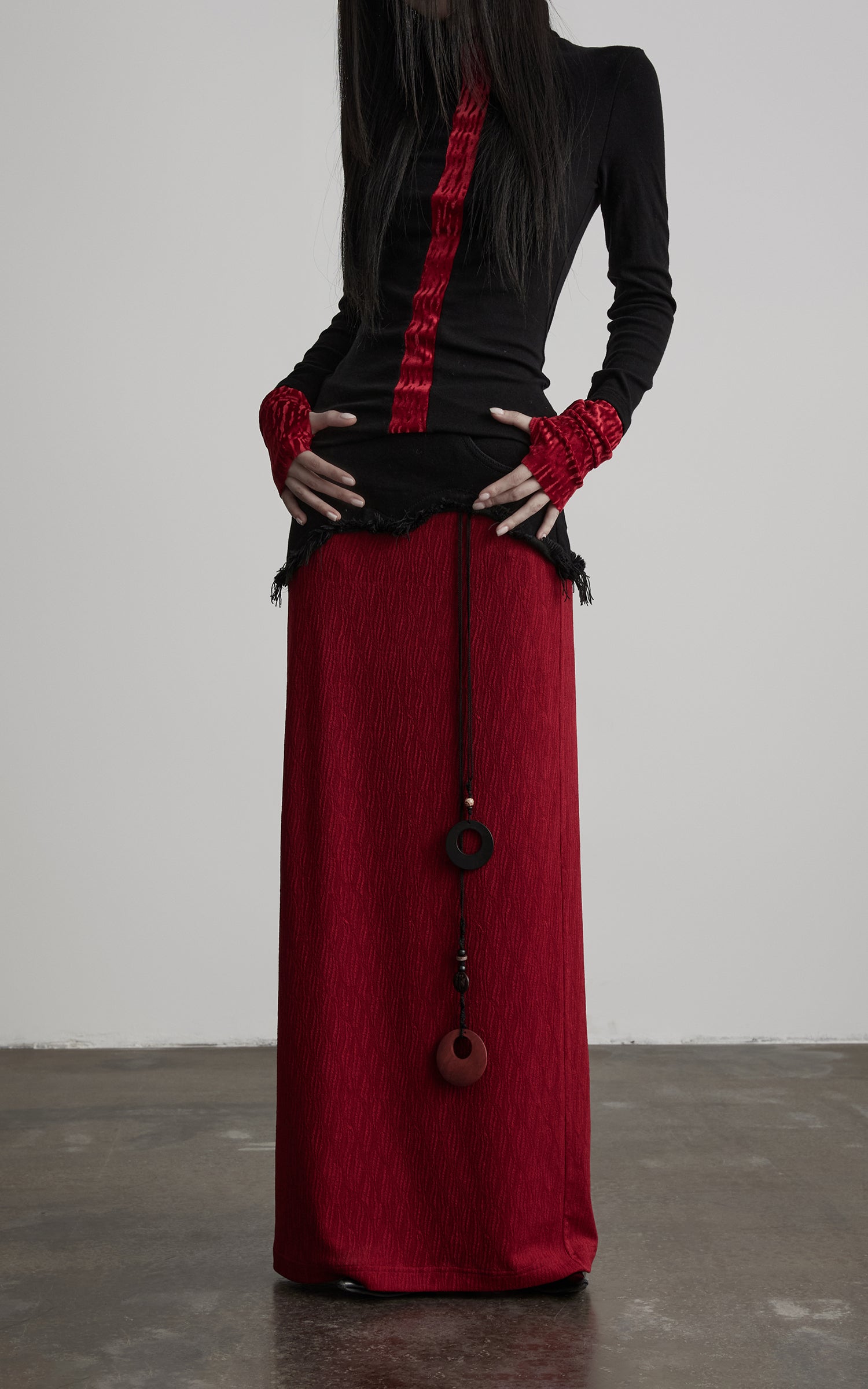 This maxi skirt is defined by an asymmetric construction and elongated silhouette, featuring textured fabric panels that create subtle depth and movement, while raw-edge transitions at the waist introduce a sense of deliberate disruption, finished with hanging fringe and ring accents that sway with motion, forming a restrained yet expressive piece rooted in avant-garde tailoring.