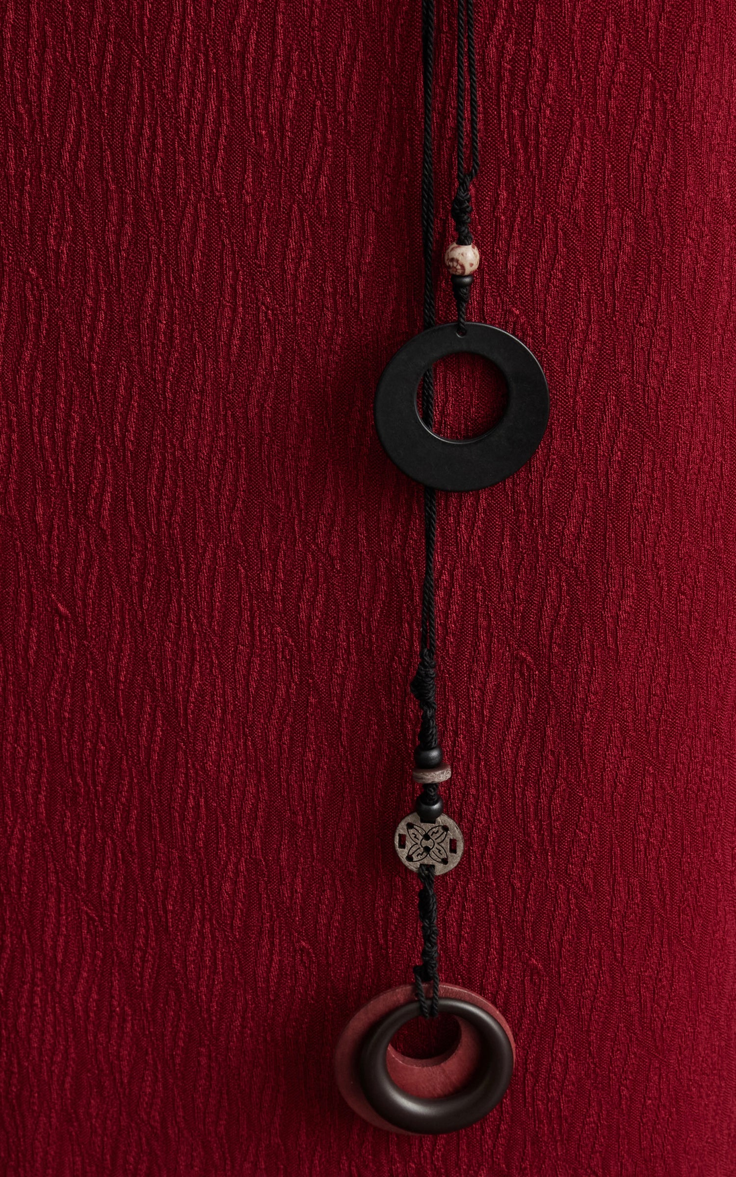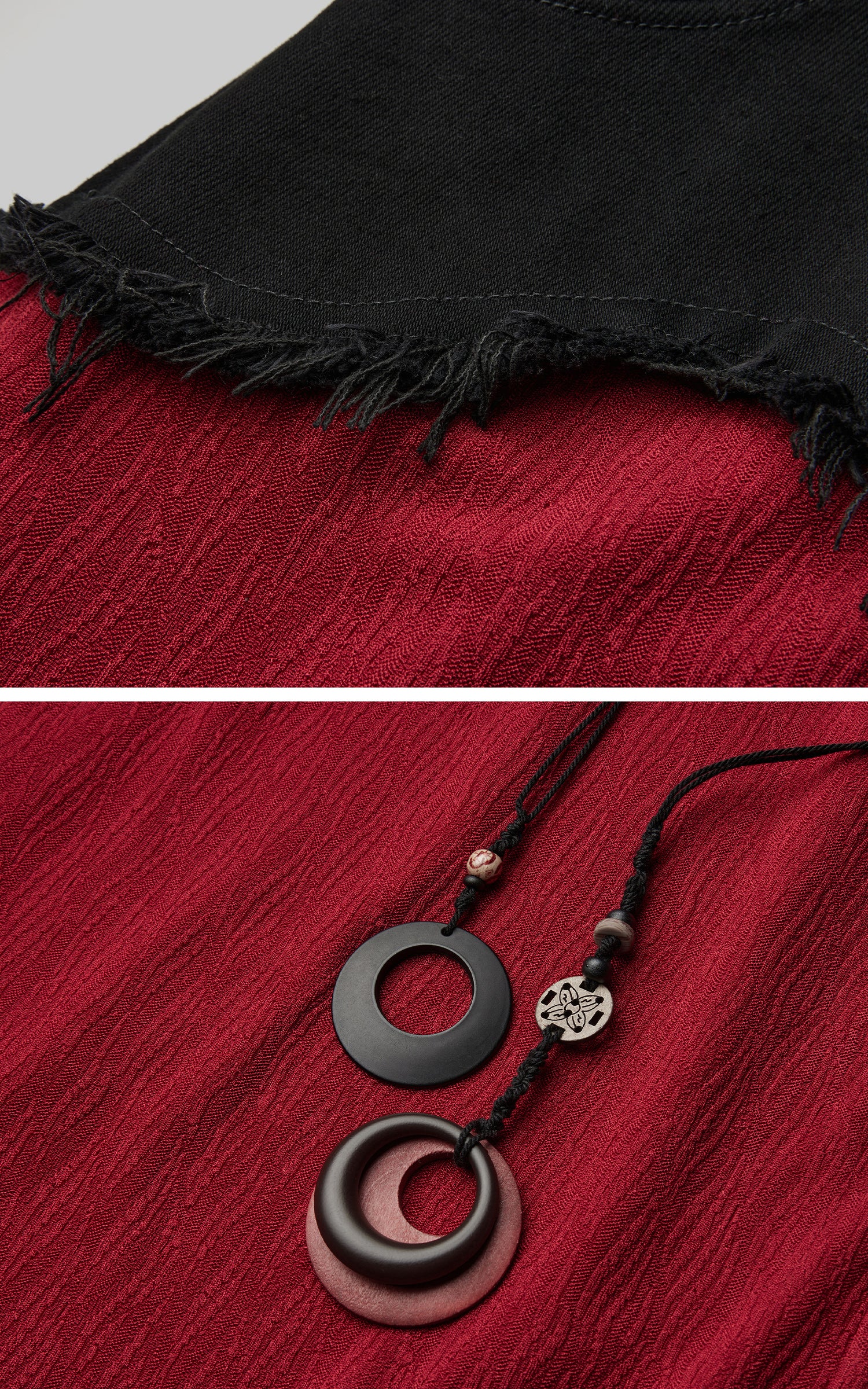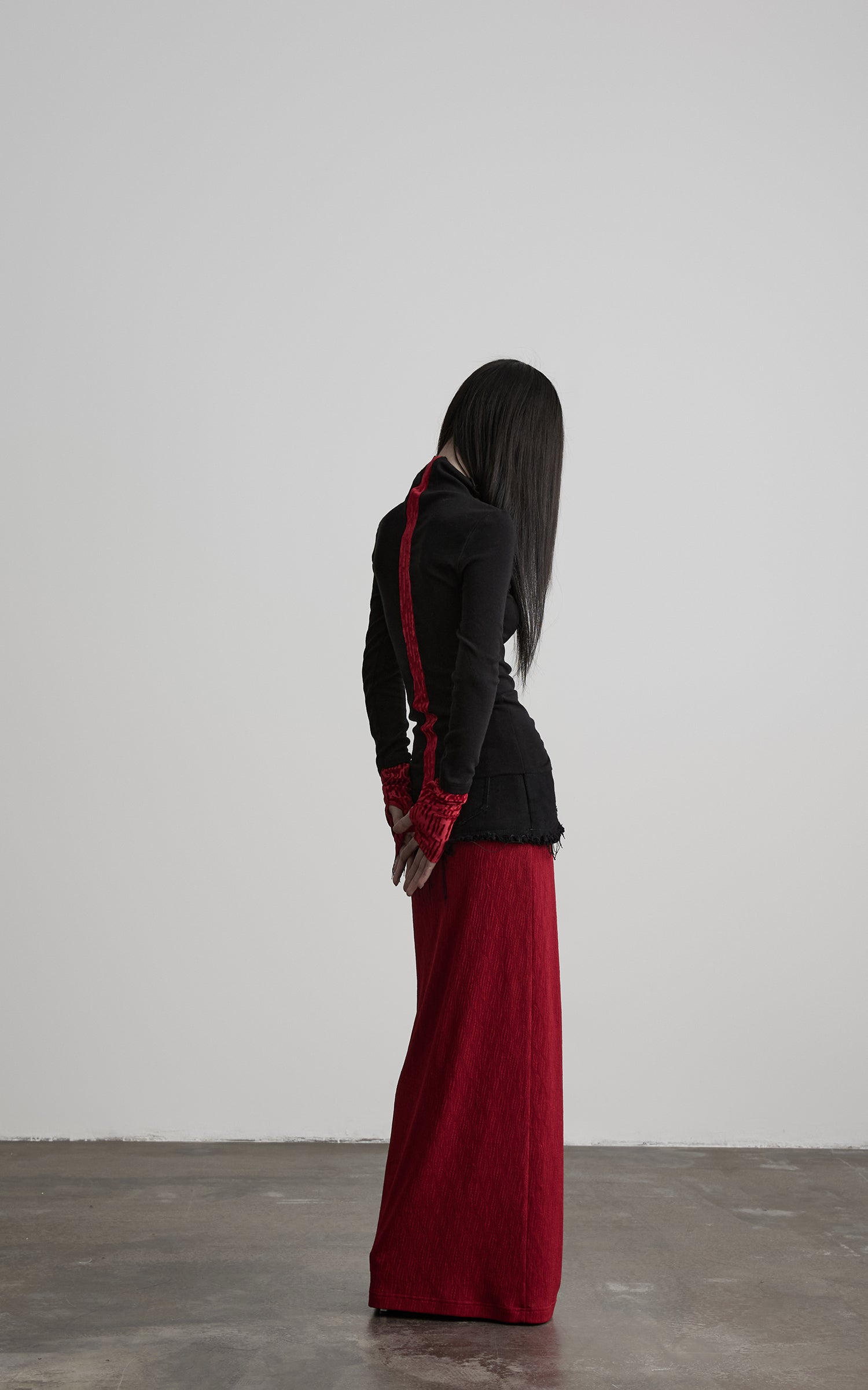 This maxi skirt is defined by an asymmetric construction and elongated silhouette, featuring textured fabric panels that create subtle depth and movement, while raw-edge transitions at the waist introduce a sense of deliberate disruption, finished with hanging fringe and ring accents that sway with motion, forming a restrained yet expressive piece rooted in avant-garde tailoring.