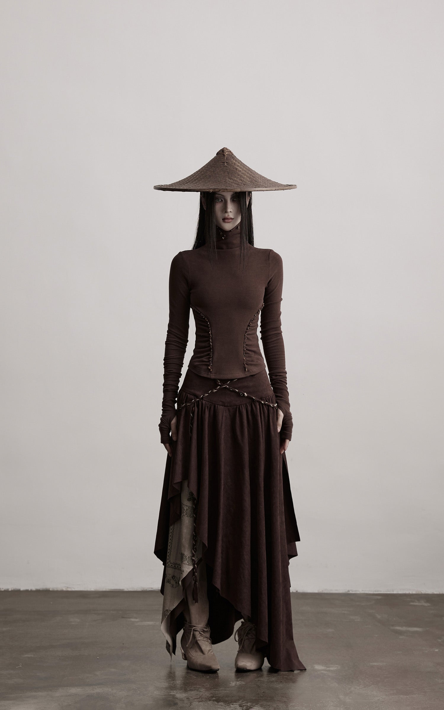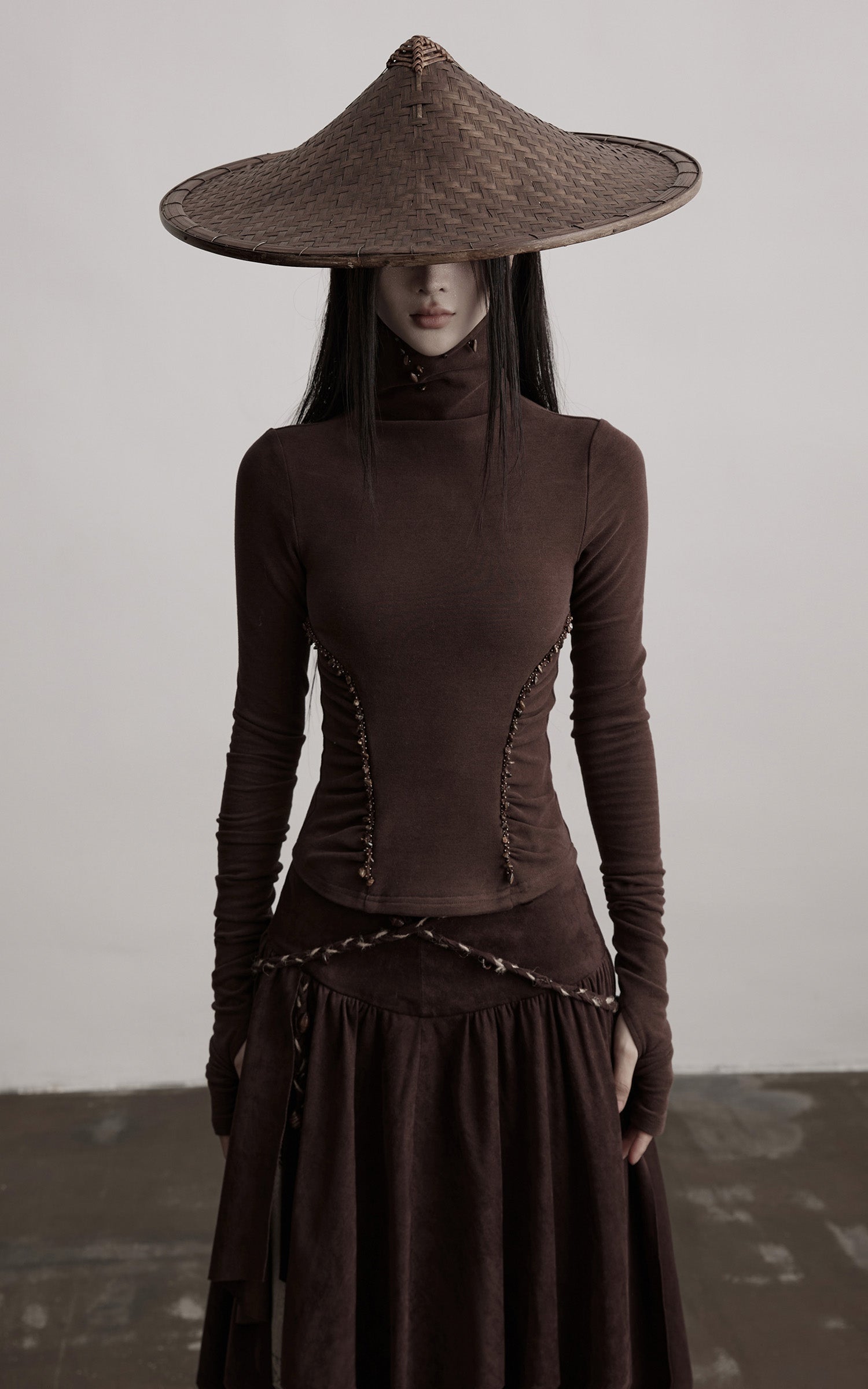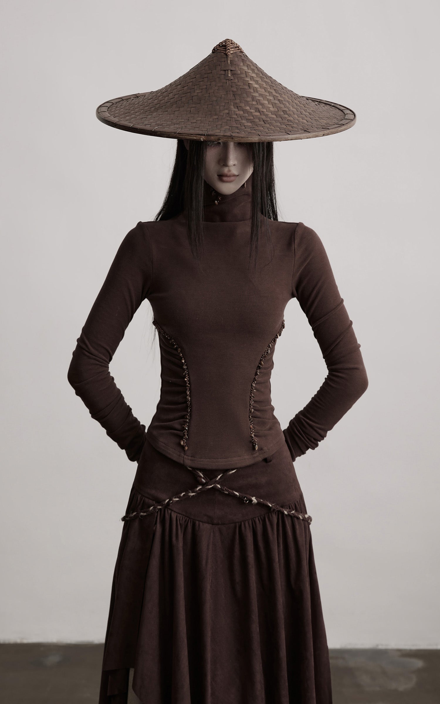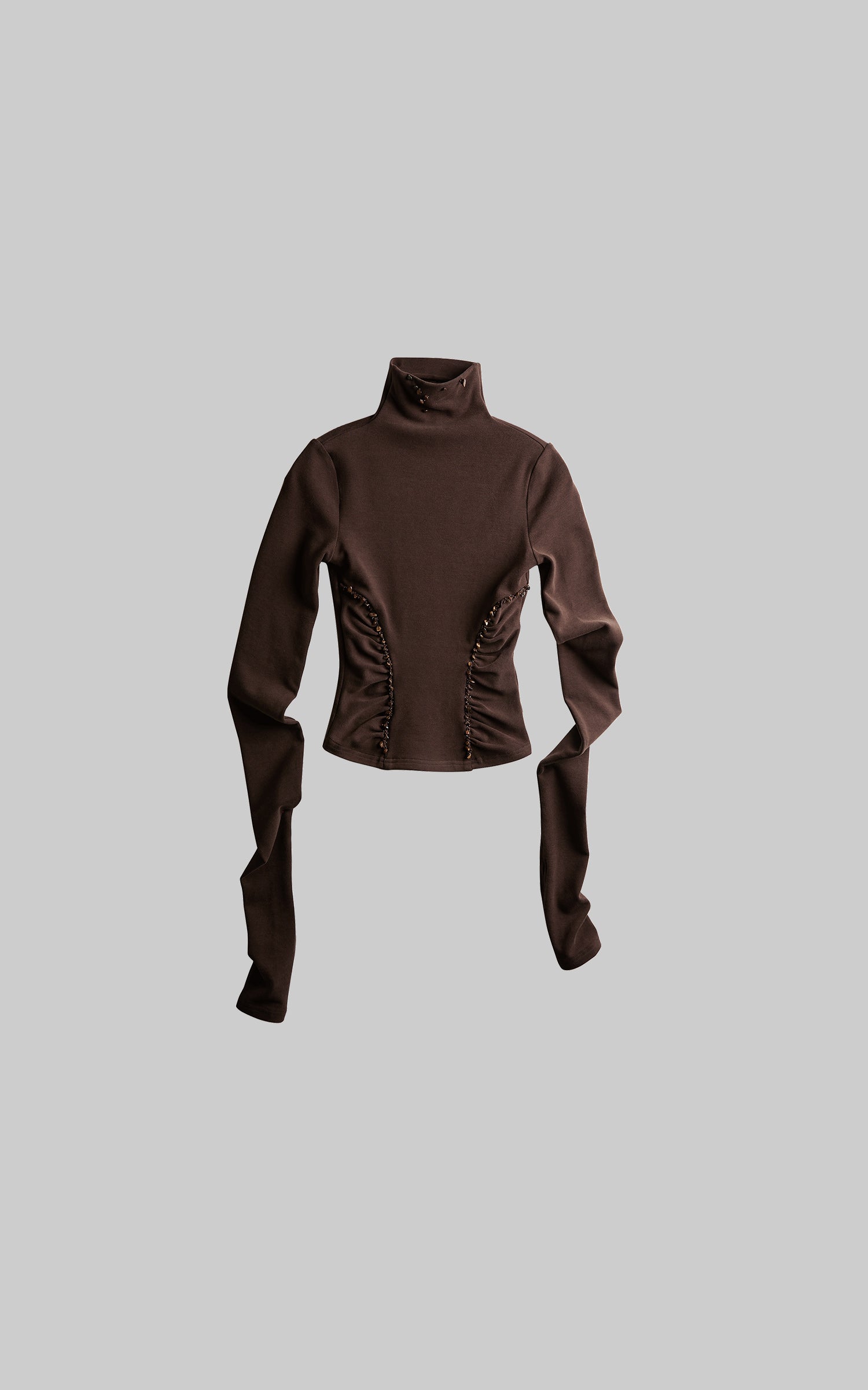 A sculpted long-sleeve top built with a quiet, disciplined tension. The high neck folds with subtle rigidity, scattered with raw mineral beads that echo organic armor. Curved contour seams trace the torso, gathered into precise ruched lines and threaded with irregular stones that shift with movement. The soft, dense knit wraps close to the body, extending into elongated sleeves that amplify the silhouette’s severity. A grounded, earthen piece made to layer within dark, monastic, or deconstructed ensembles.