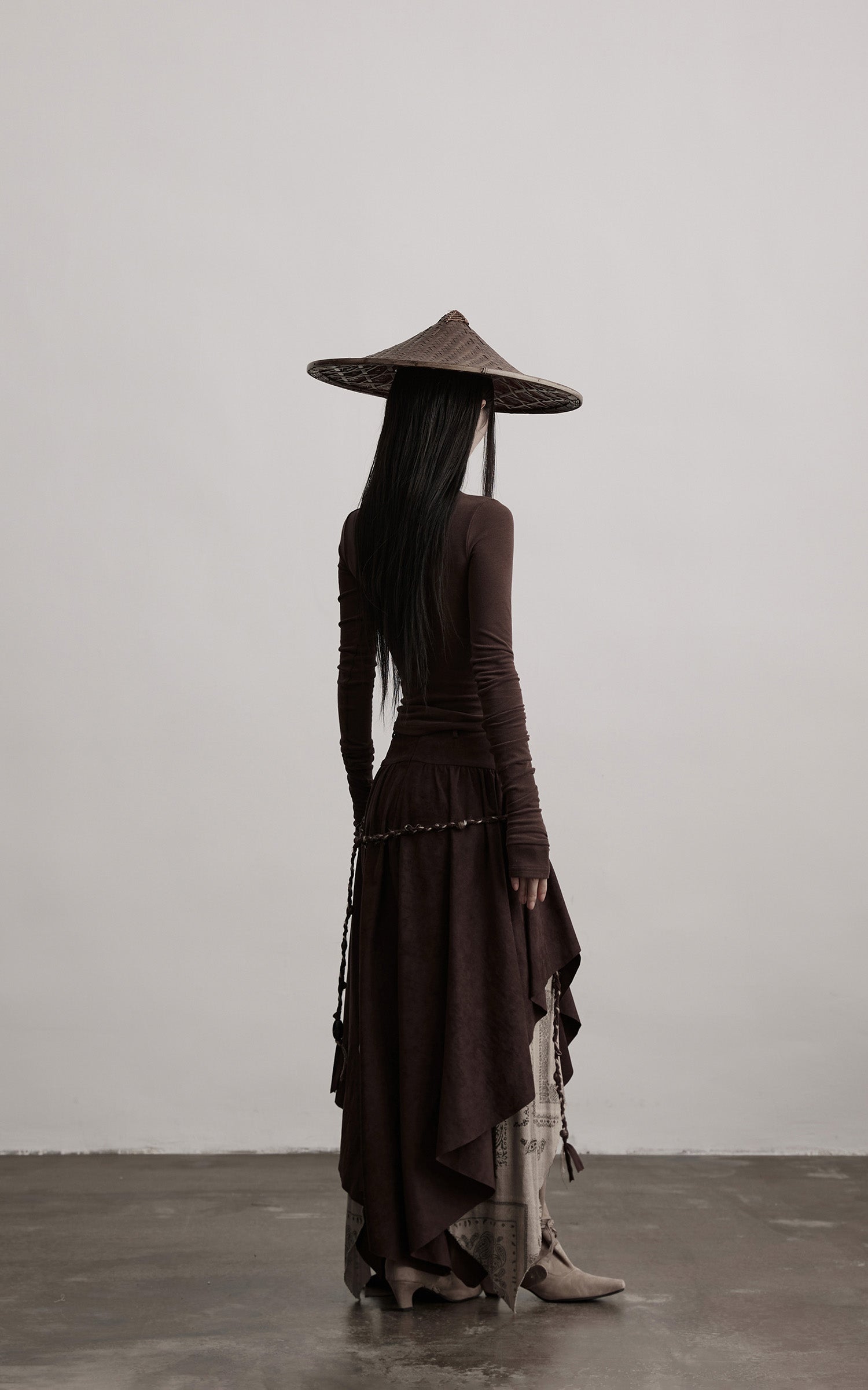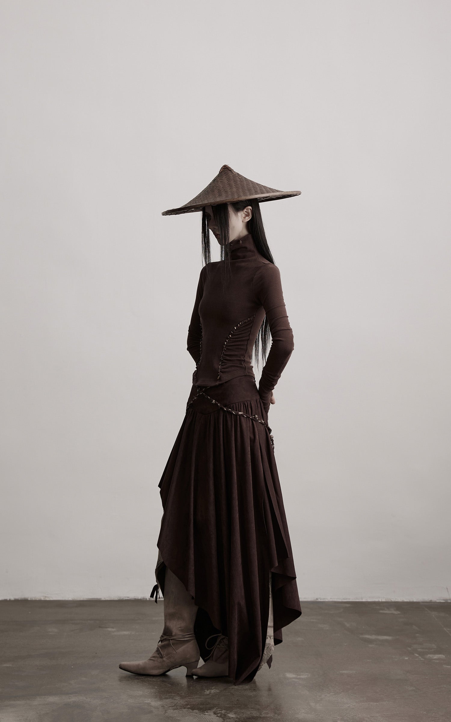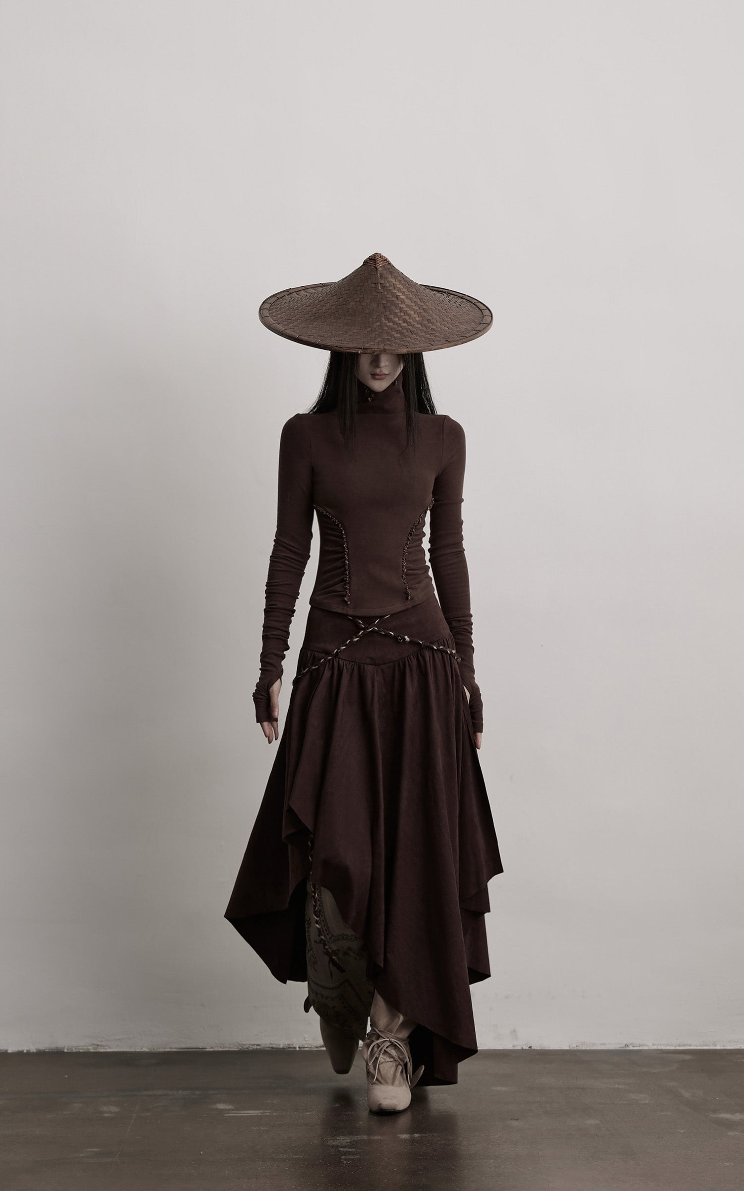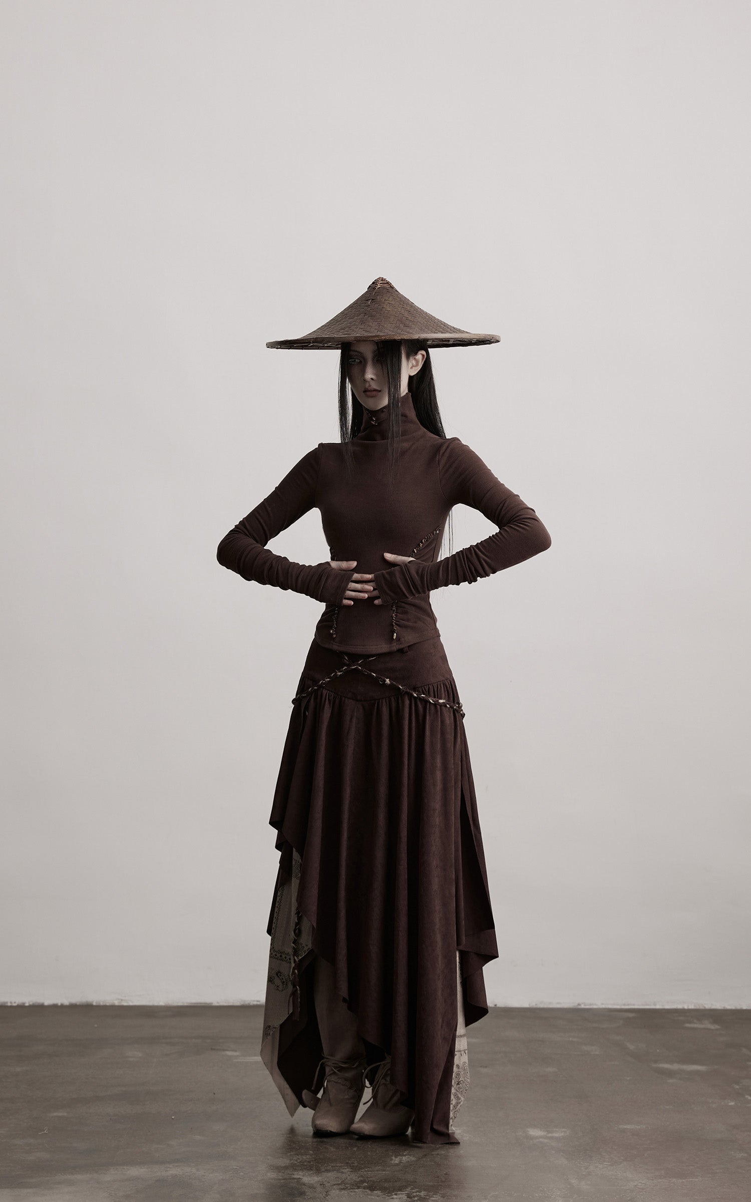 A sculpted long-sleeve top built with a quiet, disciplined tension. The high neck folds with subtle rigidity, scattered with raw mineral beads that echo organic armor. Curved contour seams trace the torso, gathered into precise ruched lines and threaded with irregular stones that shift with movement. The soft, dense knit wraps close to the body, extending into elongated sleeves that amplify the silhouette’s severity. A grounded, earthen piece made to layer within dark, monastic, or deconstructed ensembles.