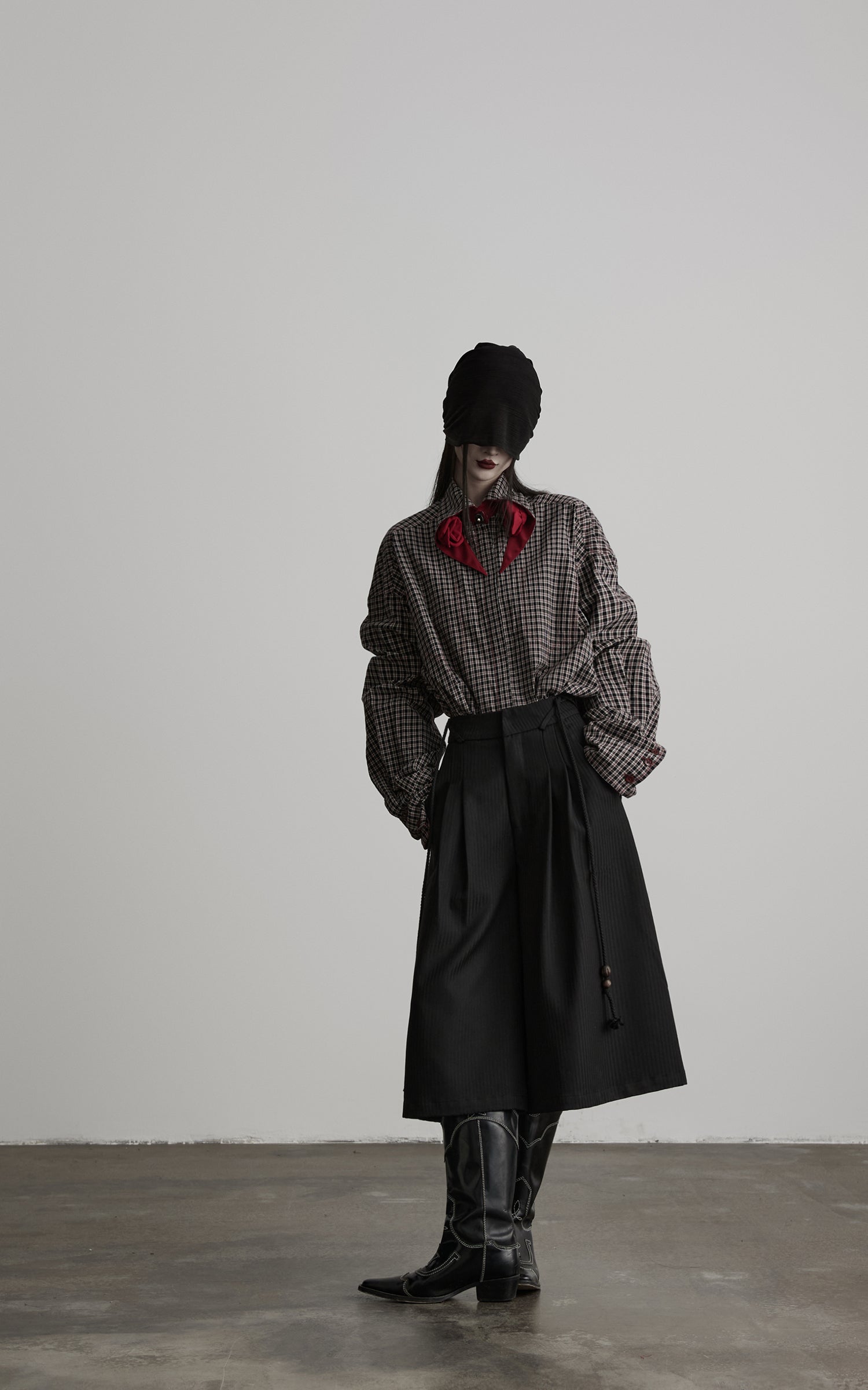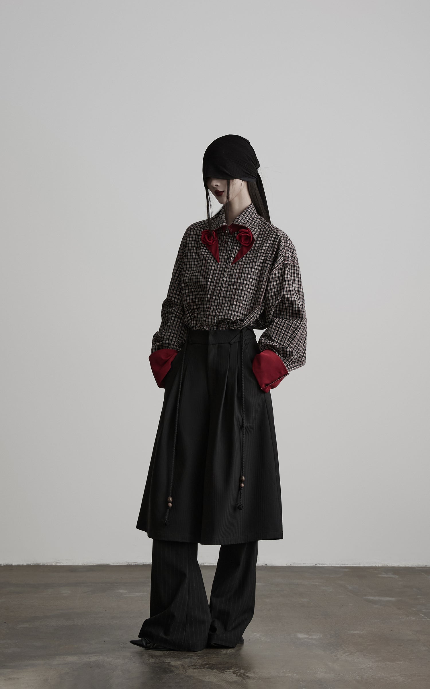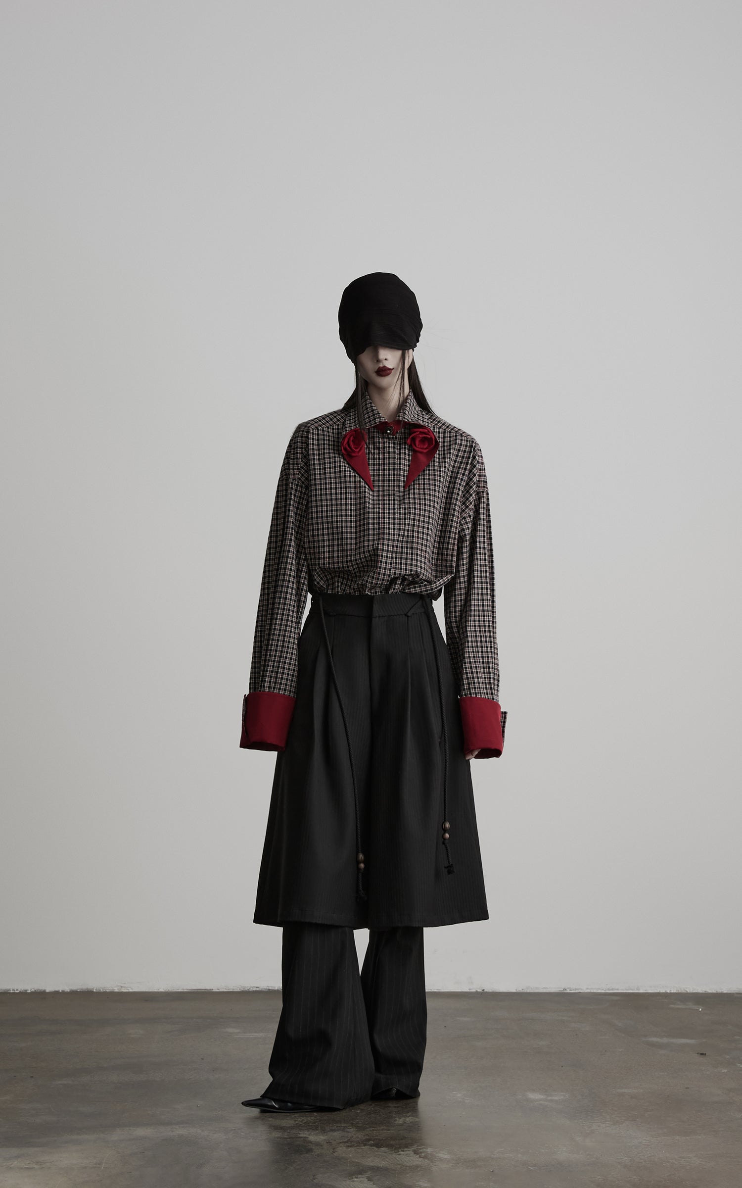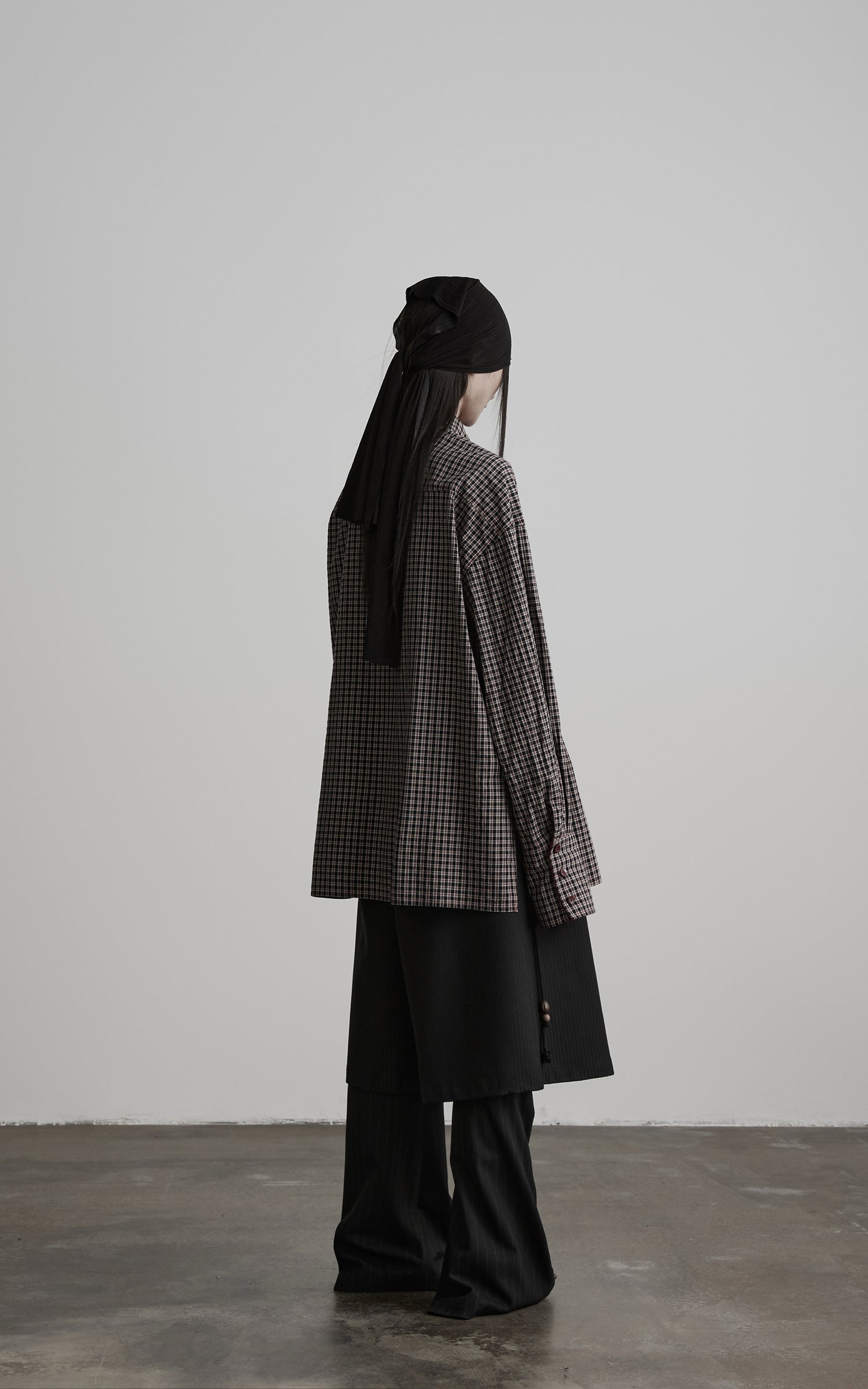 A relaxed silhouette cut from checked fabric, defined by elongated sleeves and softened structure, finished with sculptural rose details at the collar that introduce a subtle sense of tension, balancing restraint and expression in a quiet, avant-garde form.