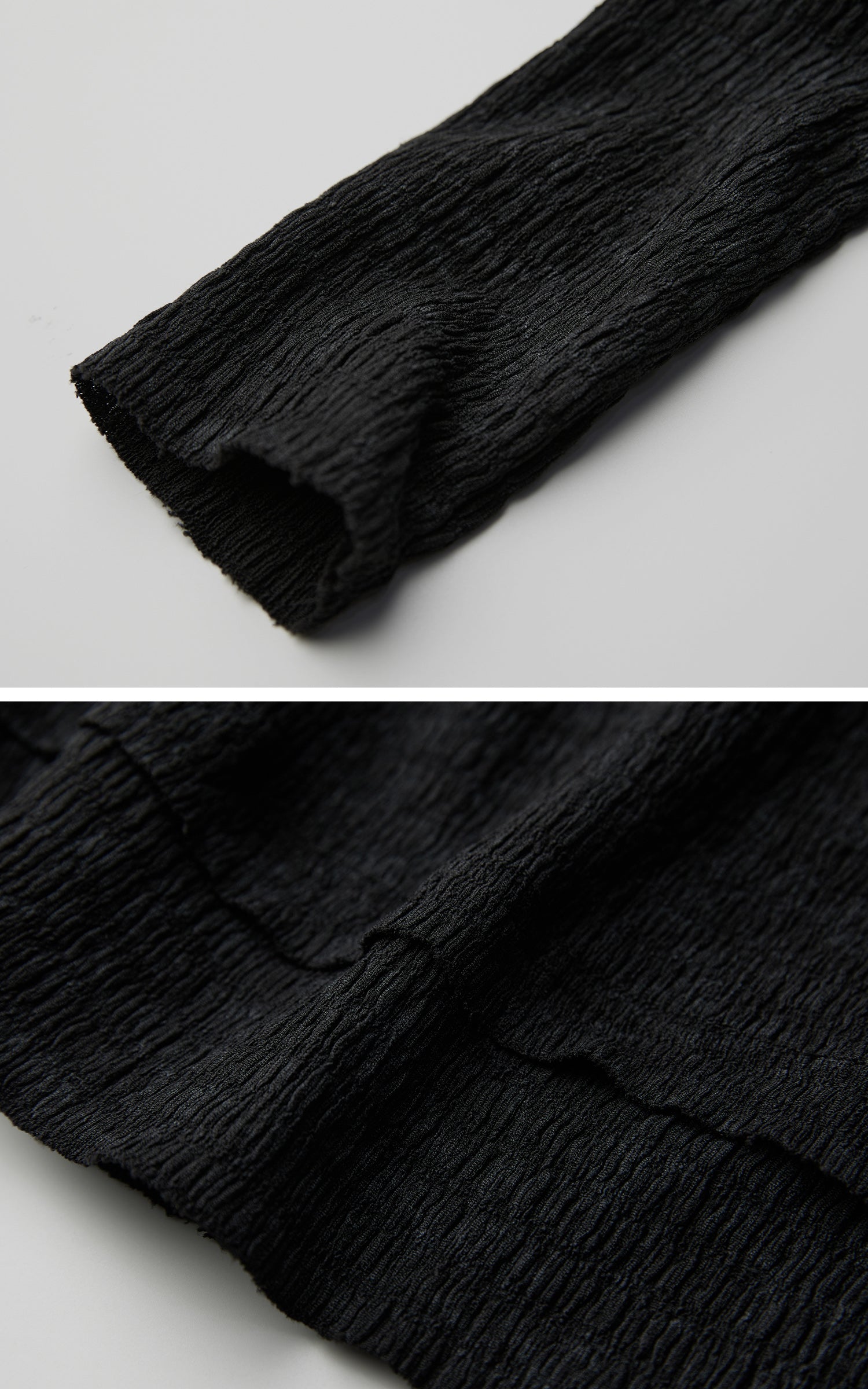 A deconstructed long sleeve top built with a tactile crinkle-textured fabric. The silhouette is slim and elongated, emphasizing vertical flow and shadow play. A bold contrast yoke with monochrome splatter print introduces a raw, painterly tension, disrupted further by asymmetric detail and sculptural button ornamentation. The high neck and extended sleeves frame the body with a stark severity, balancing fragility with weight. A piece designed for layering or worn alone, standing at the intersection of gothic minimalism and industrial elegance.