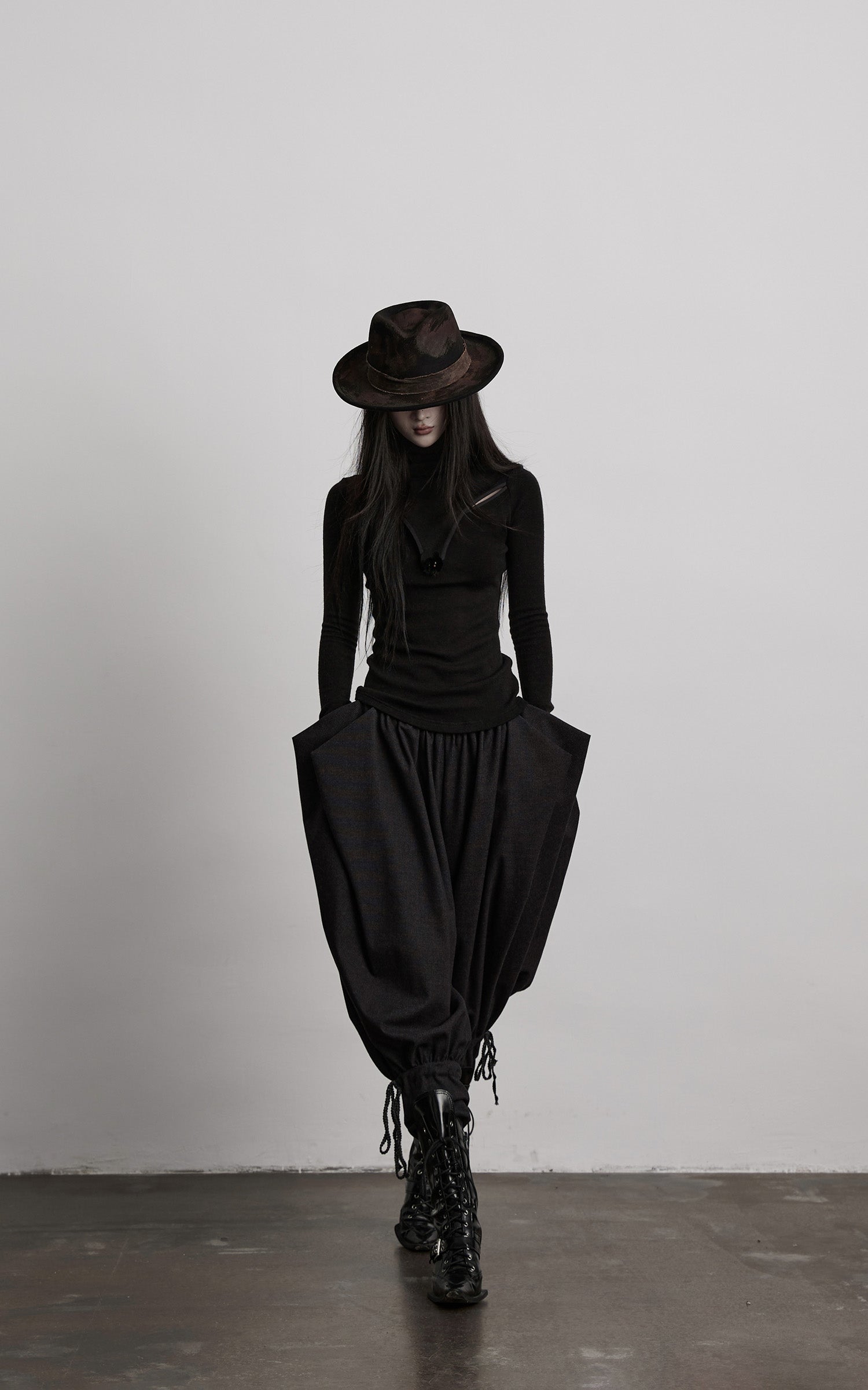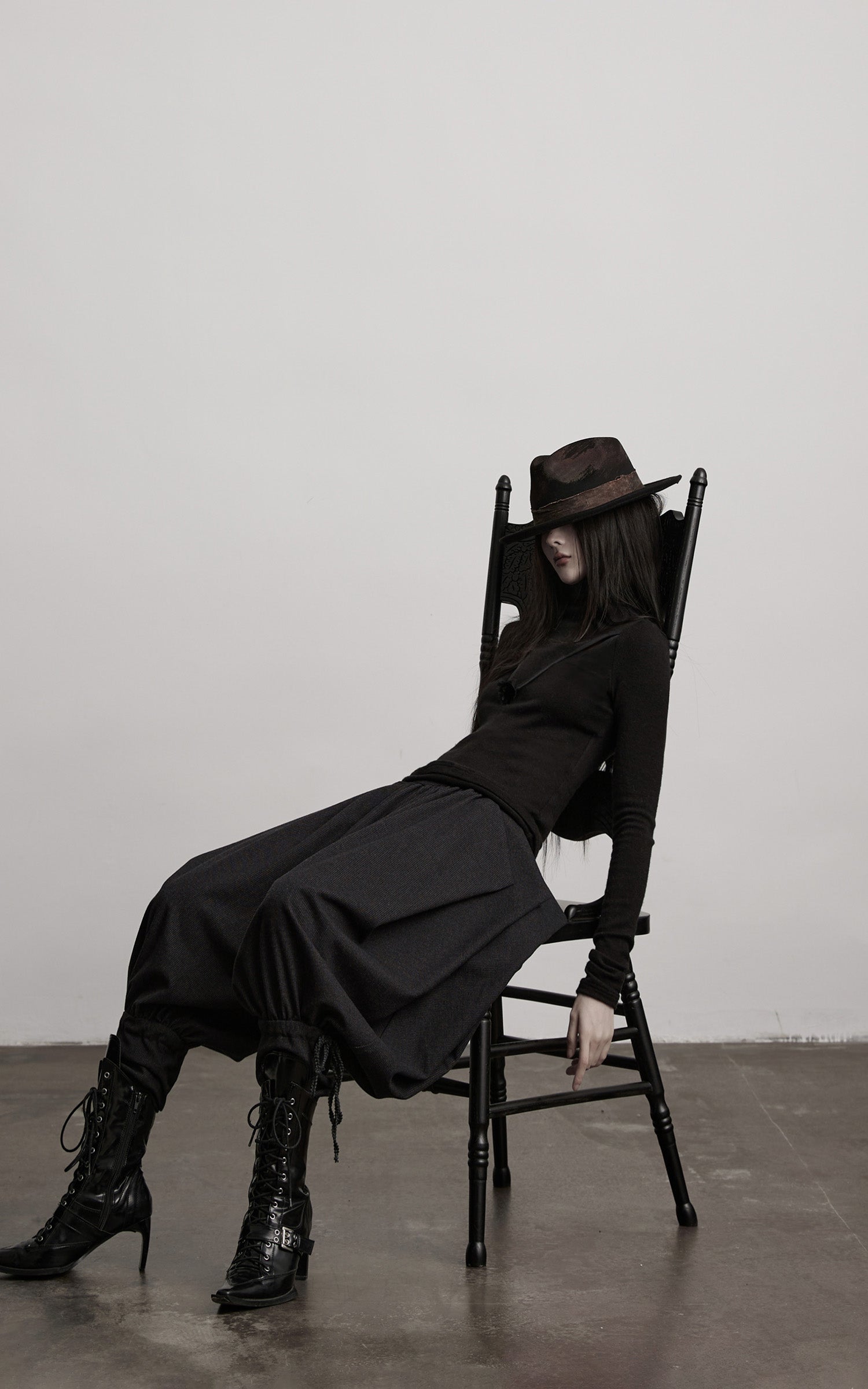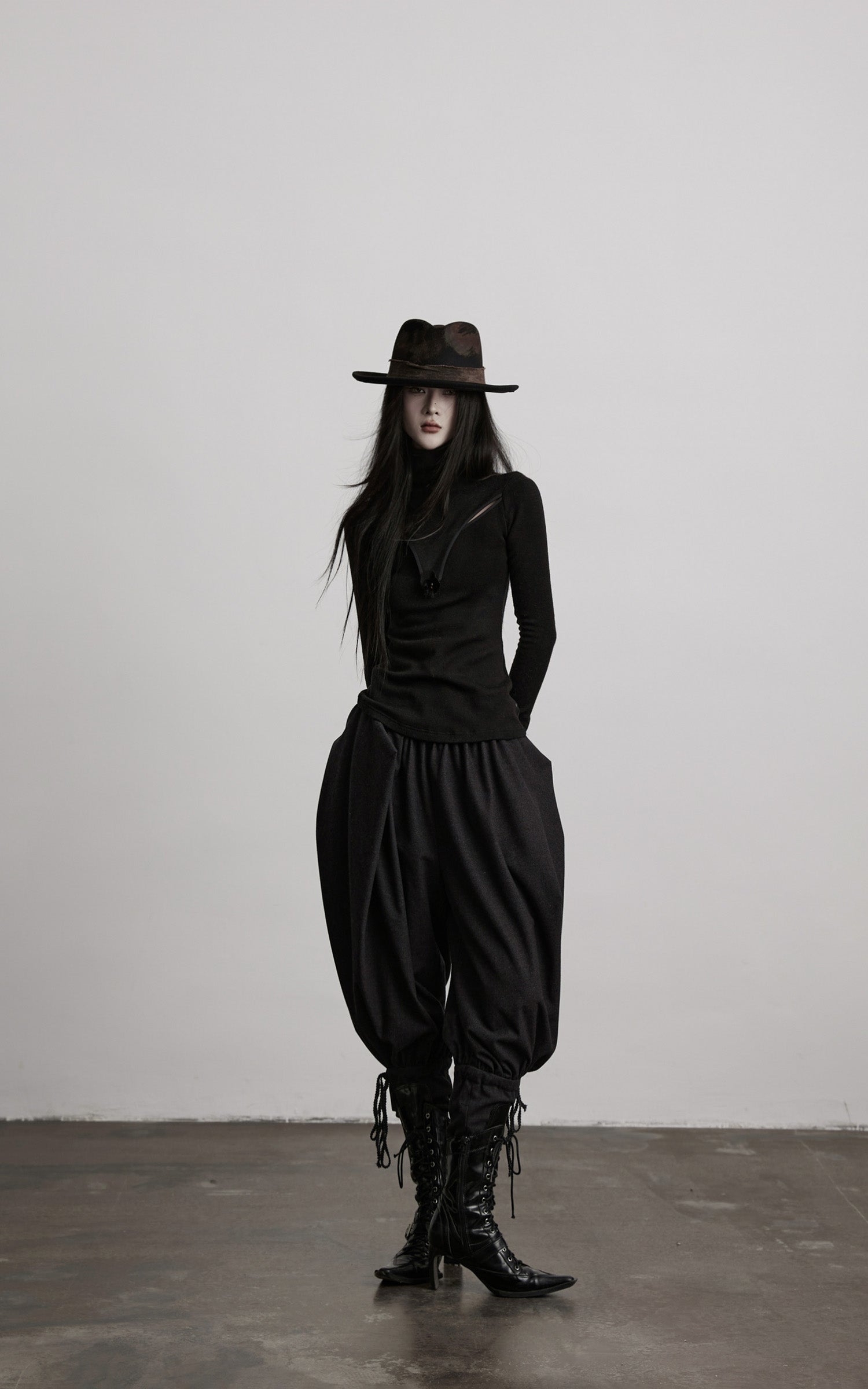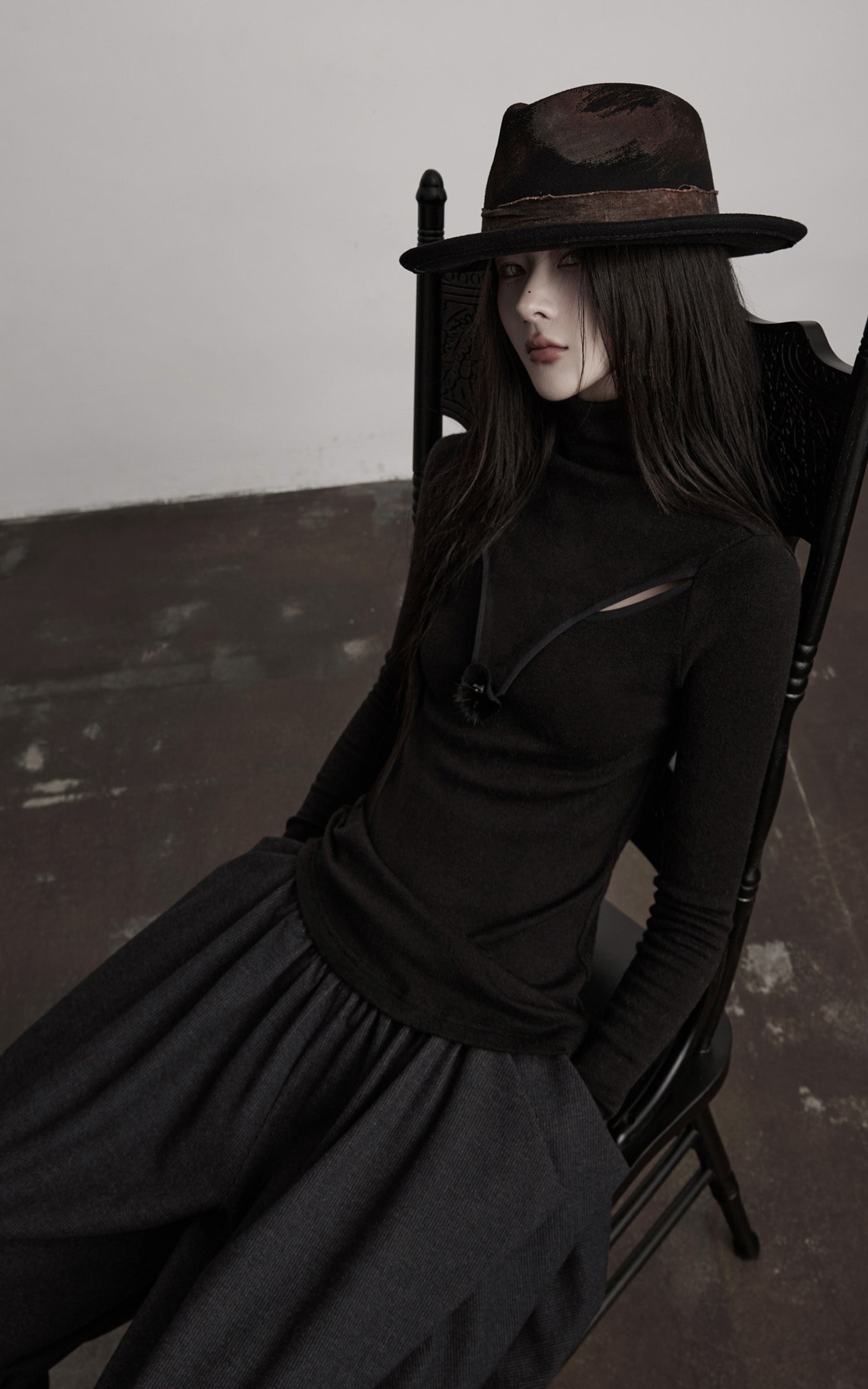 This knit top is shaped with a close, sculptural fit, defined by two sharp cutout lines sweeping across the chest like restrained incisions. A single cord descends to a small fur accent, adding a subtle point of tension to the clean, minimal surface. The high neck reinforces a sense of quiet structure, while the elastic knit offers smooth flexibility and a muted, shadowed texture. Designed to layer within an all-black silhouette, it carries an austere, avant-garde presence that feels both intimate and severe.