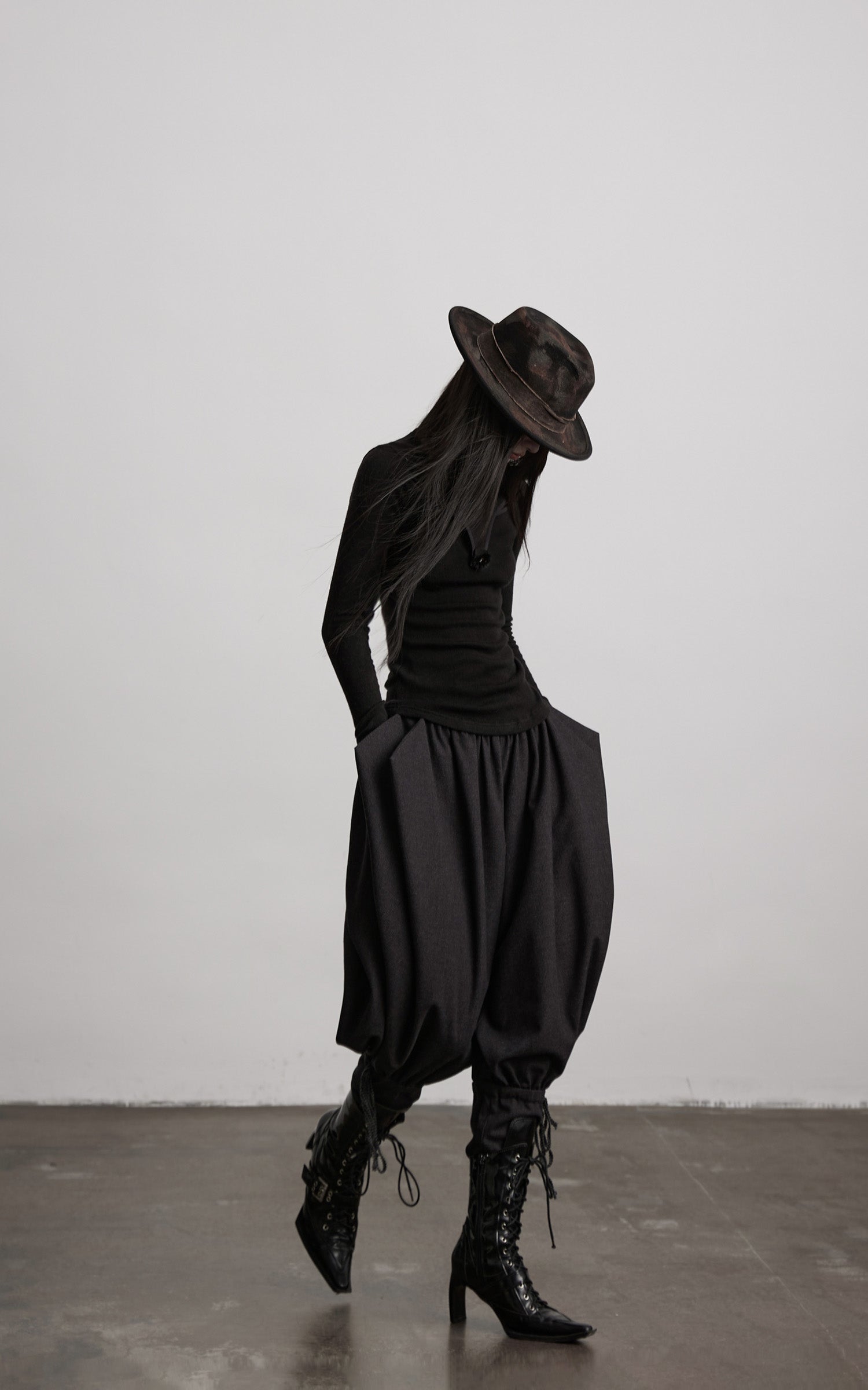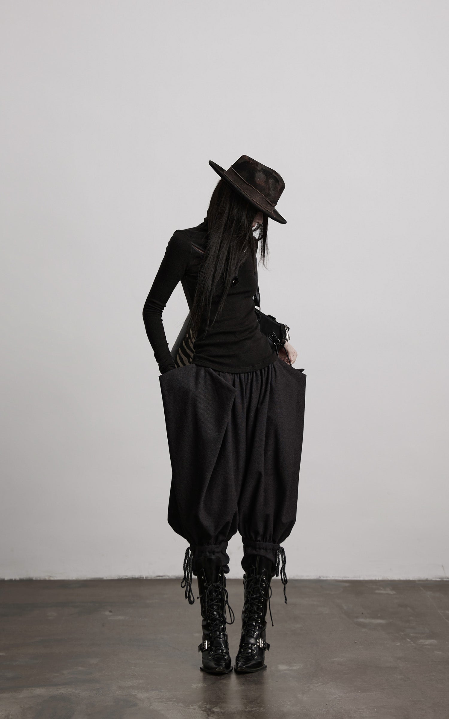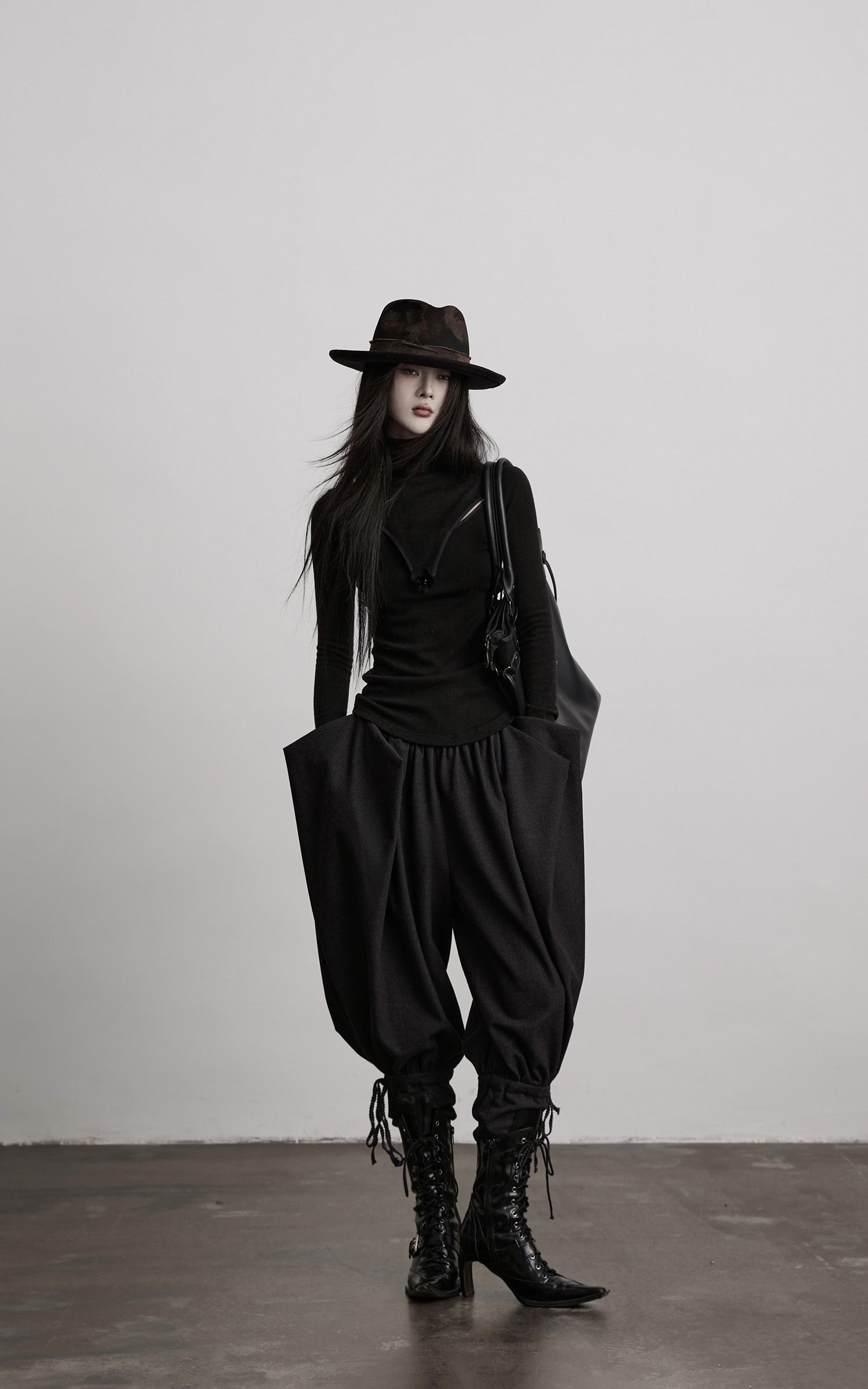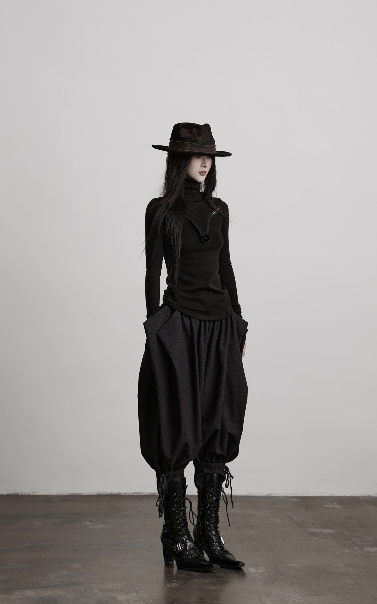 This knit top is shaped with a close, sculptural fit, defined by two sharp cutout lines sweeping across the chest like restrained incisions. A single cord descends to a small fur accent, adding a subtle point of tension to the clean, minimal surface. The high neck reinforces a sense of quiet structure, while the elastic knit offers smooth flexibility and a muted, shadowed texture. Designed to layer within an all-black silhouette, it carries an austere, avant-garde presence that feels both intimate and severe.