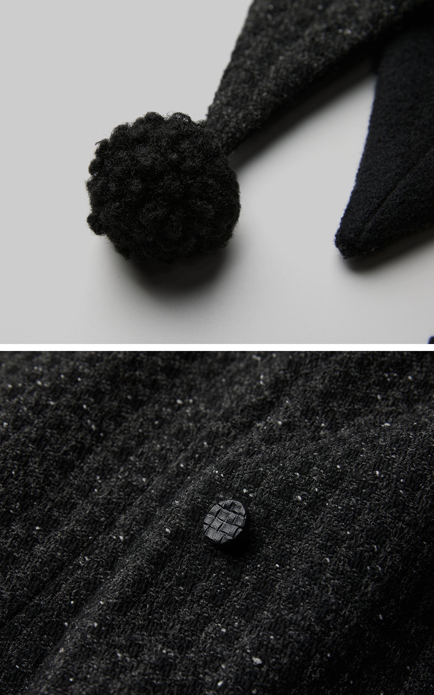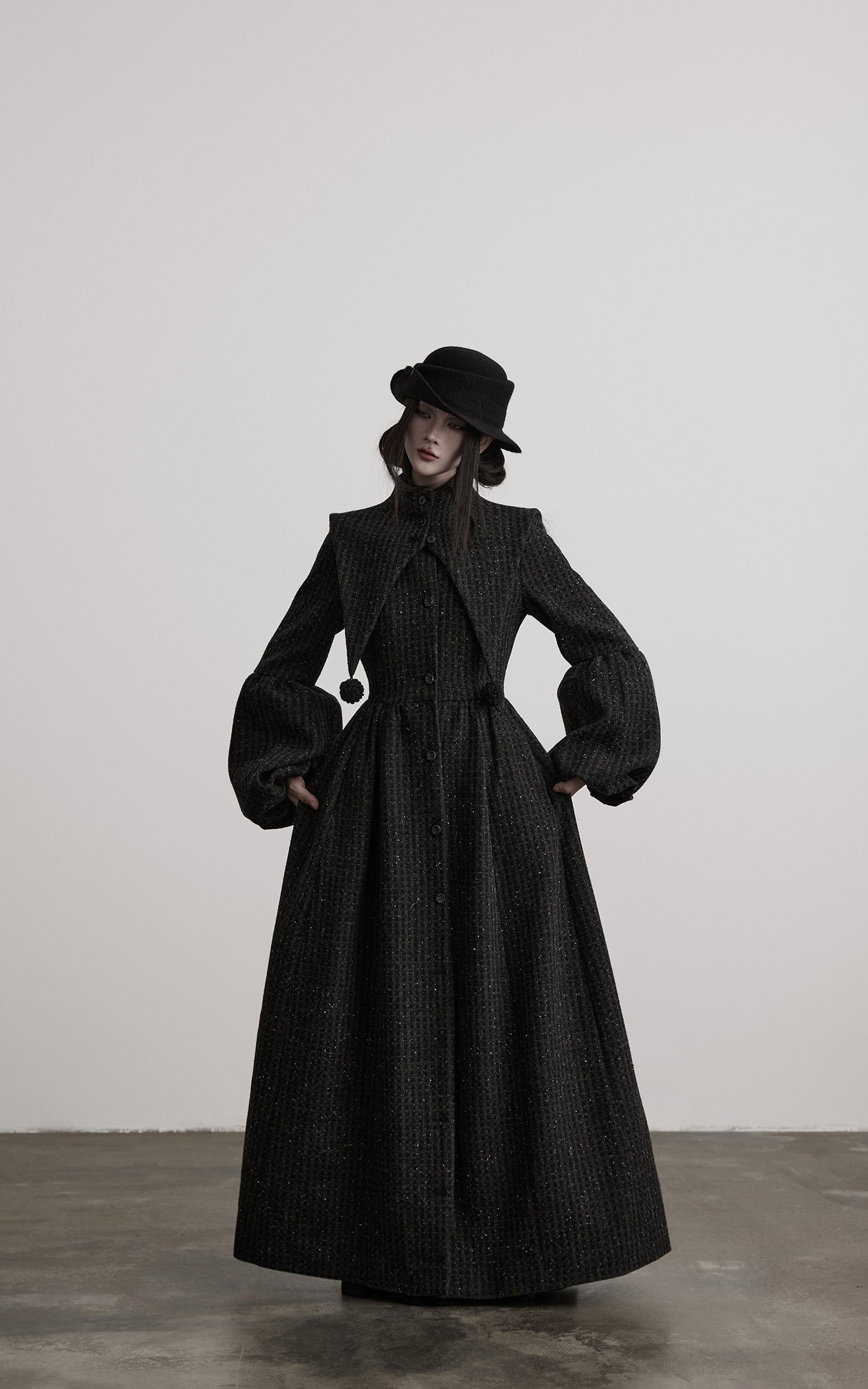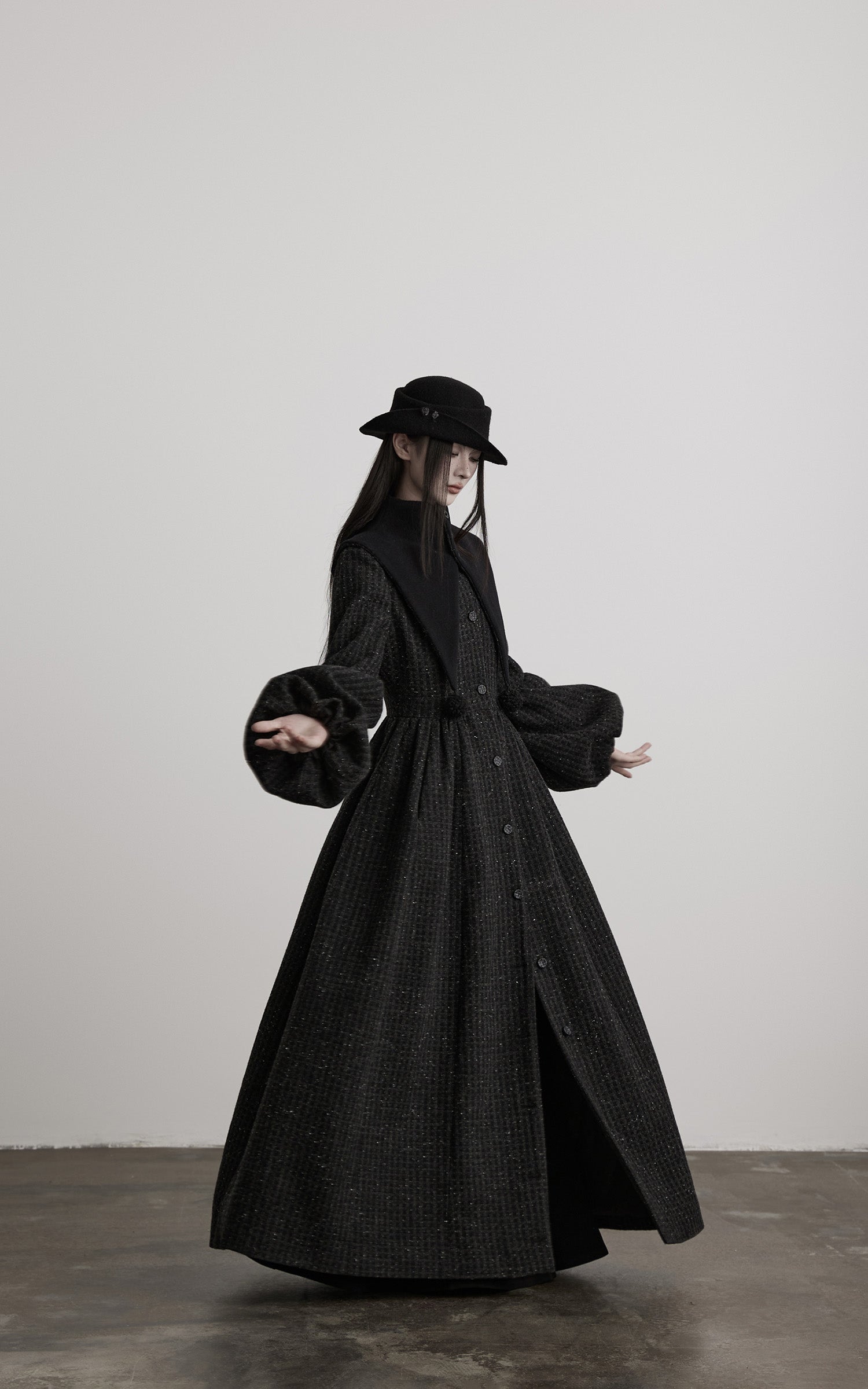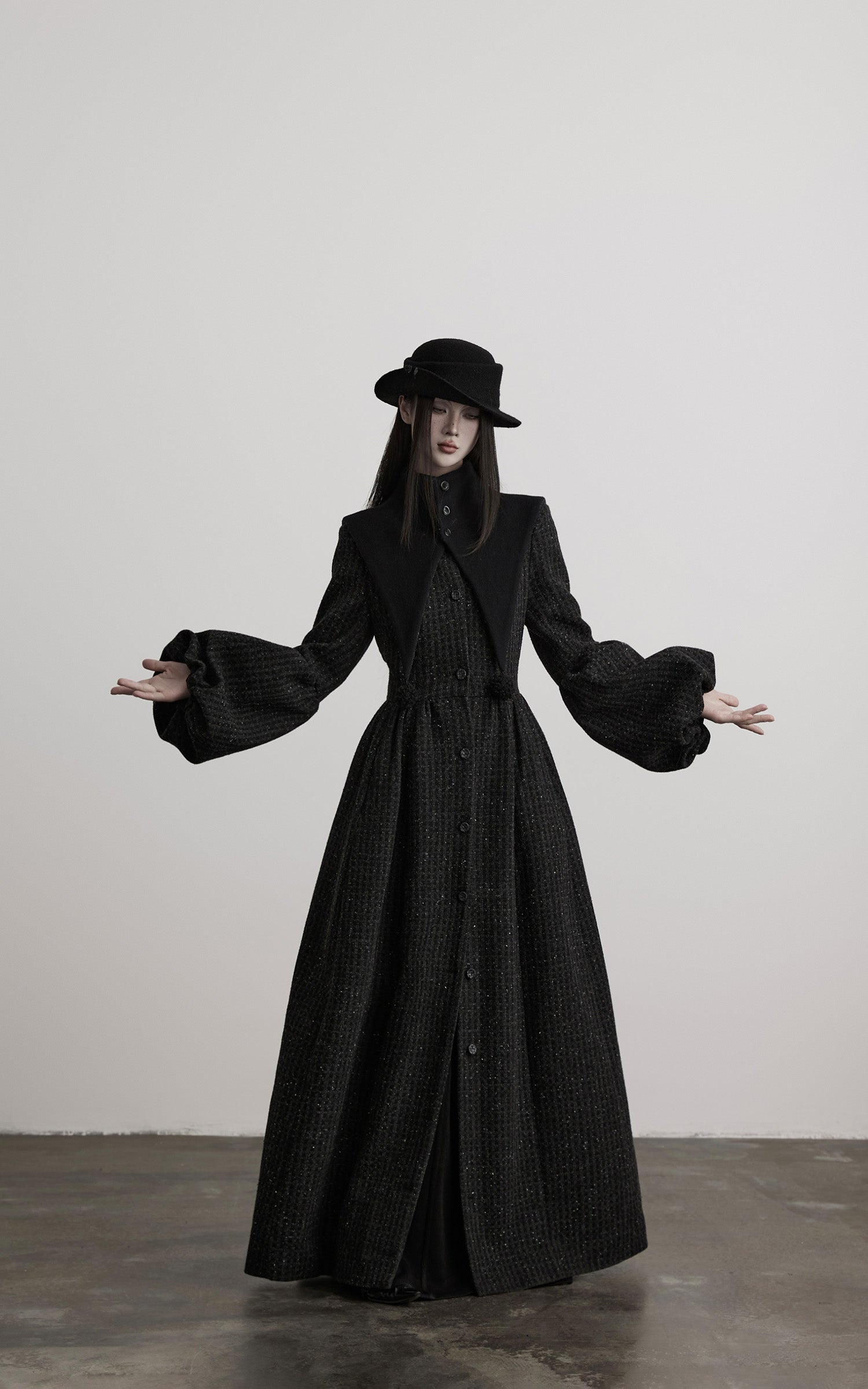This long coat is defined by a restrained deconstructed structure, where a high neck and asymmetric front panel create a sharp, sculptural silhouette. The shoulders remain controlled while the hem releases softly, elongating the body line. Voluminous balloon sleeves introduce measured tension through subtle movement. The textured wool-blend surface adds depth without excess, allowing the form to speak quietly yet decisively. A disciplined button closure anchors the design, balancing precision and fluidity in a composed, avant-garde expression.
