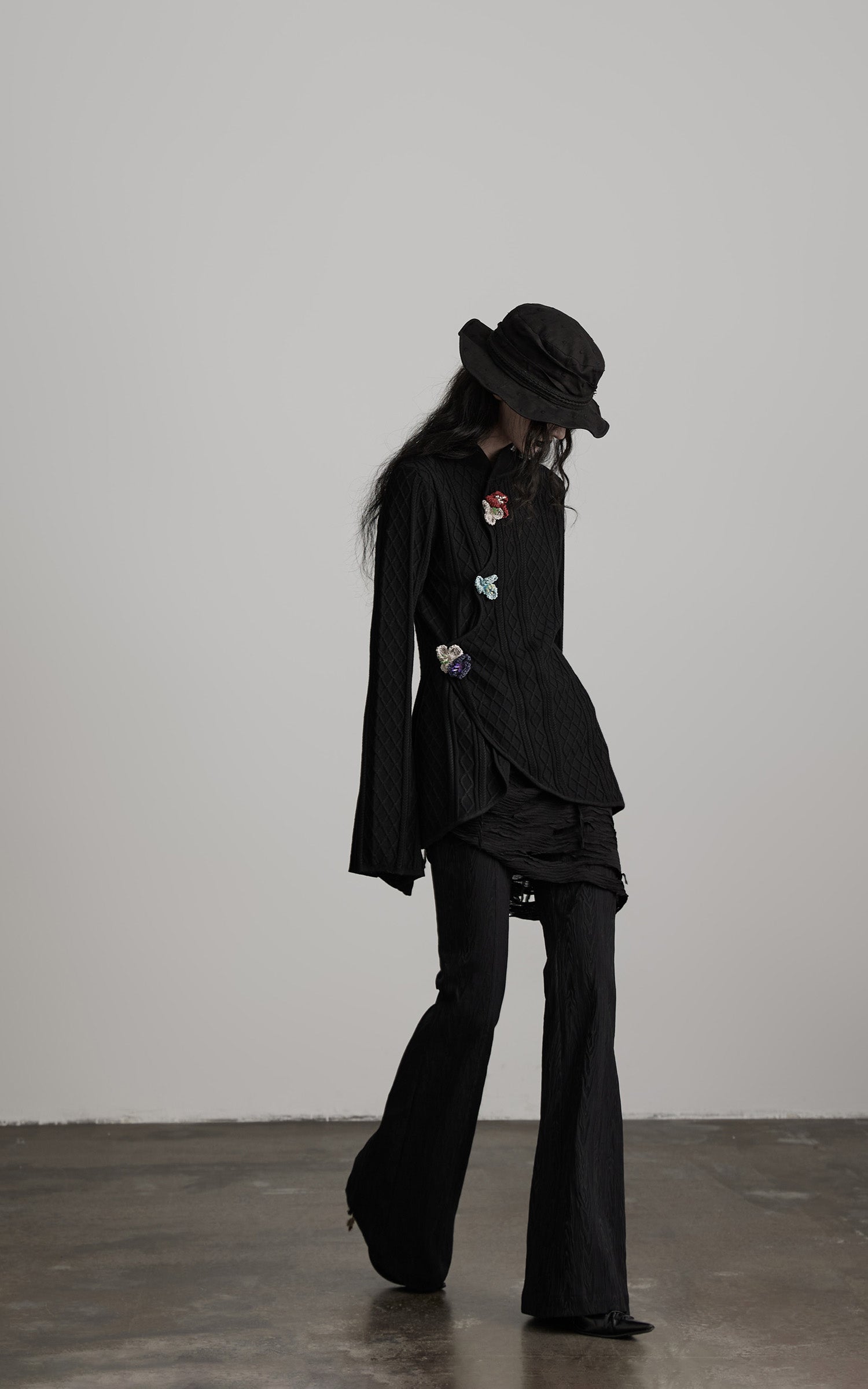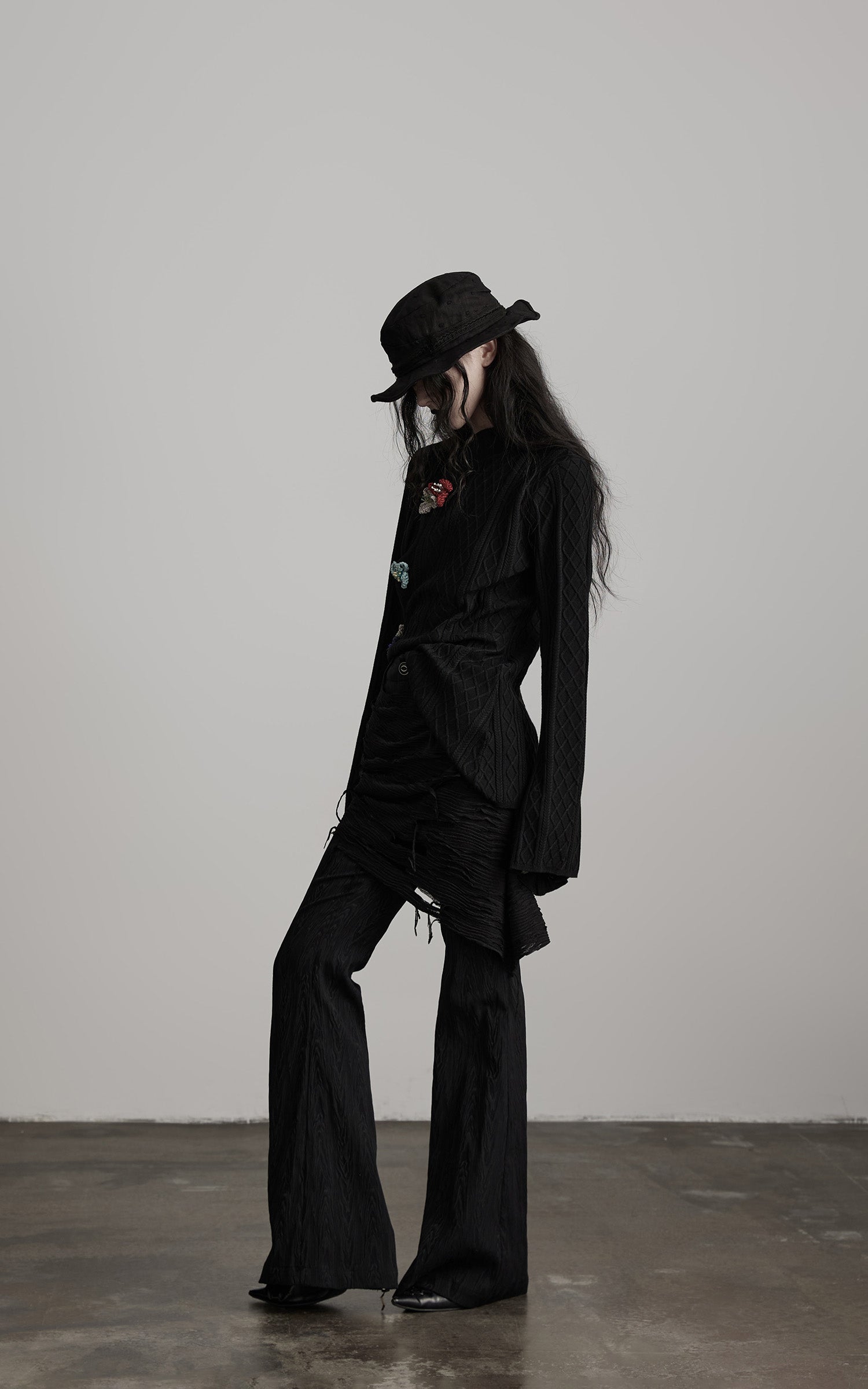 These pants reinterpret layered tailoring with a deconstructed sensibility. Textured crinkled fabric drapes asymmetrically, forming a skirt-like overlay that flows over wide legs. Raw edges and uneven folds evoke a sense of disorder refined into structure. The silhouette moves between softness and rigidity, creating an avant-garde yet wearable expression of sculptural minimalism.