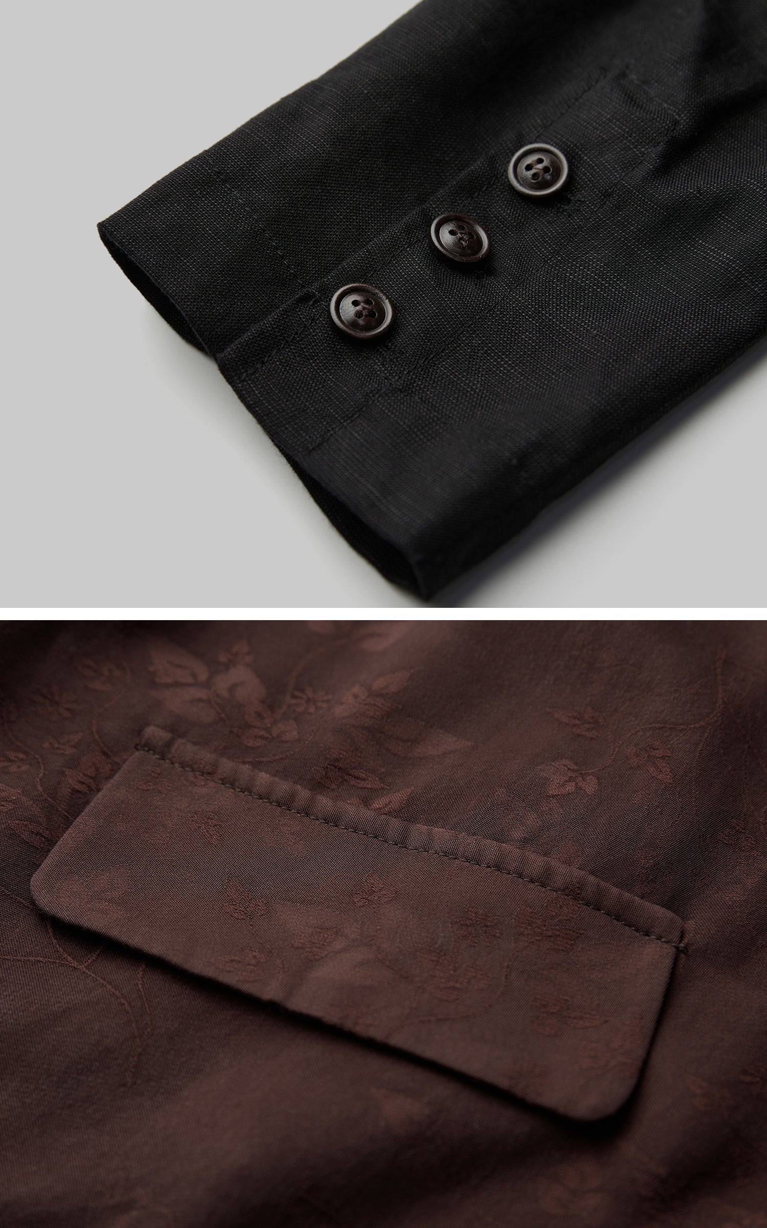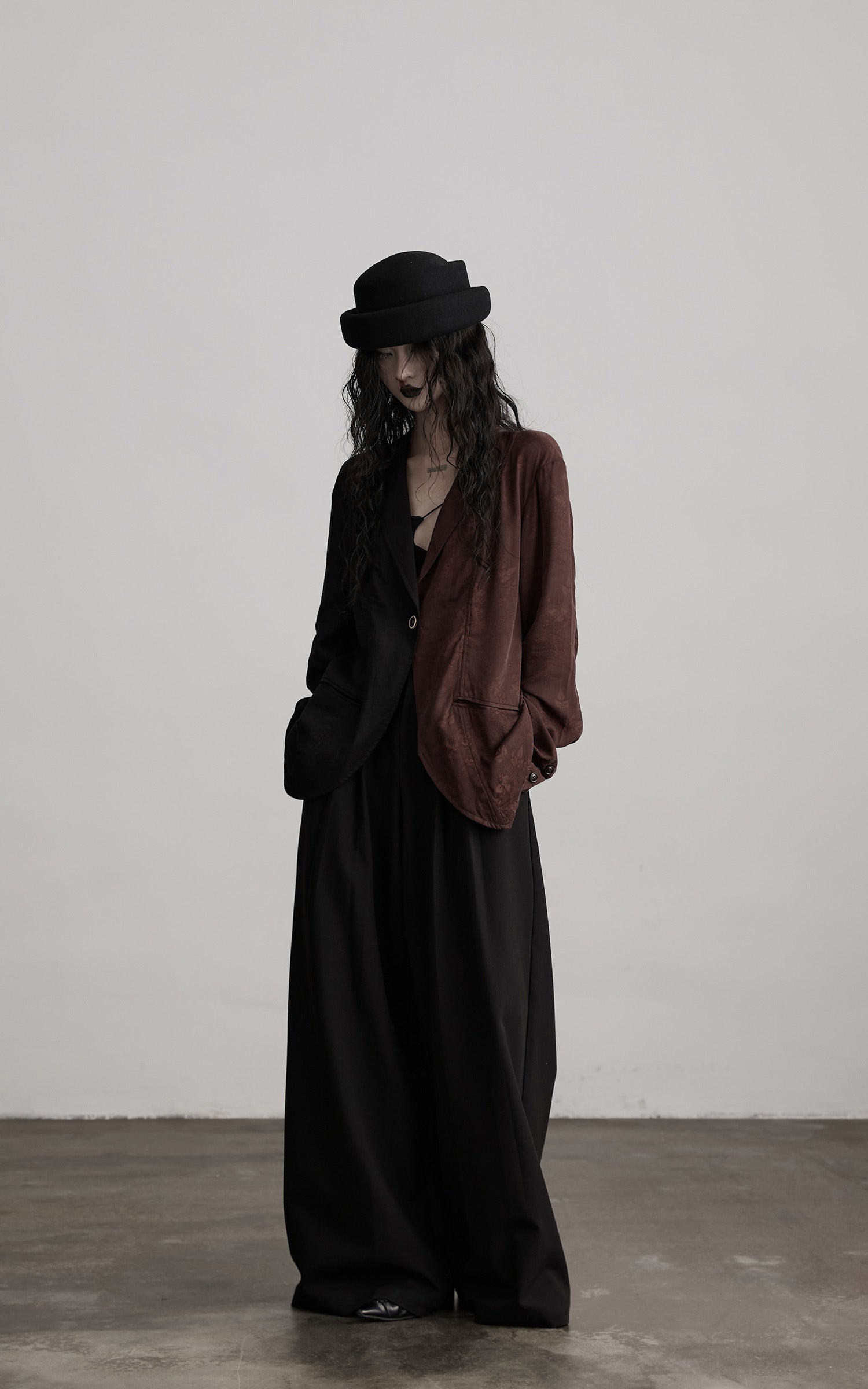 A study in asymmetry and tension. The blazer merges matte black with deep brown jacquard, disrupting traditional tailoring with raw precision. Structured panels contrast with fluid textures, creating a dialogue between restraint and disorder. The single-button closure and uneven drape emphasize a fractured silhouette, balancing austerity with quiet strength.
