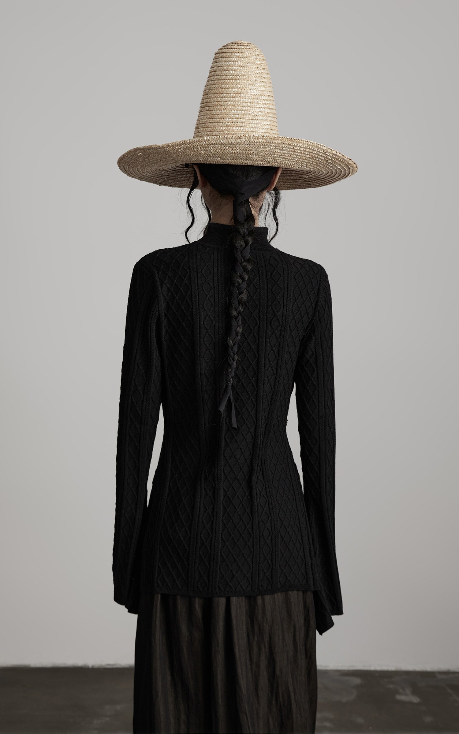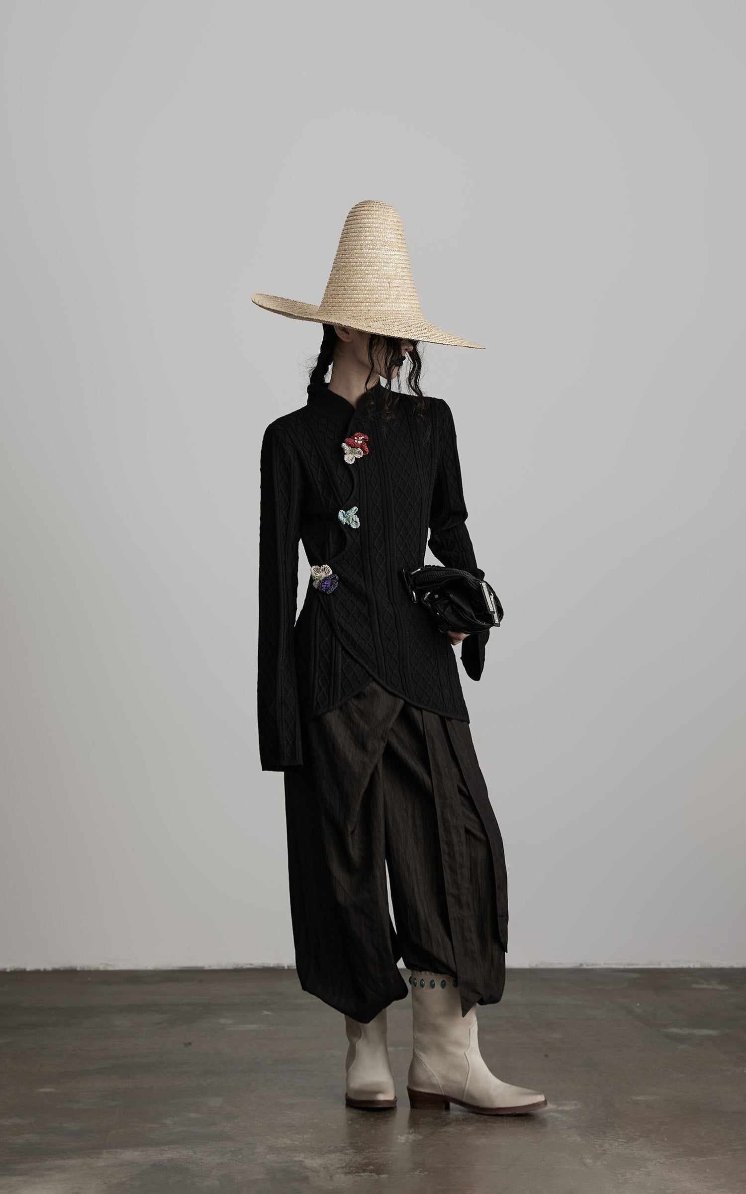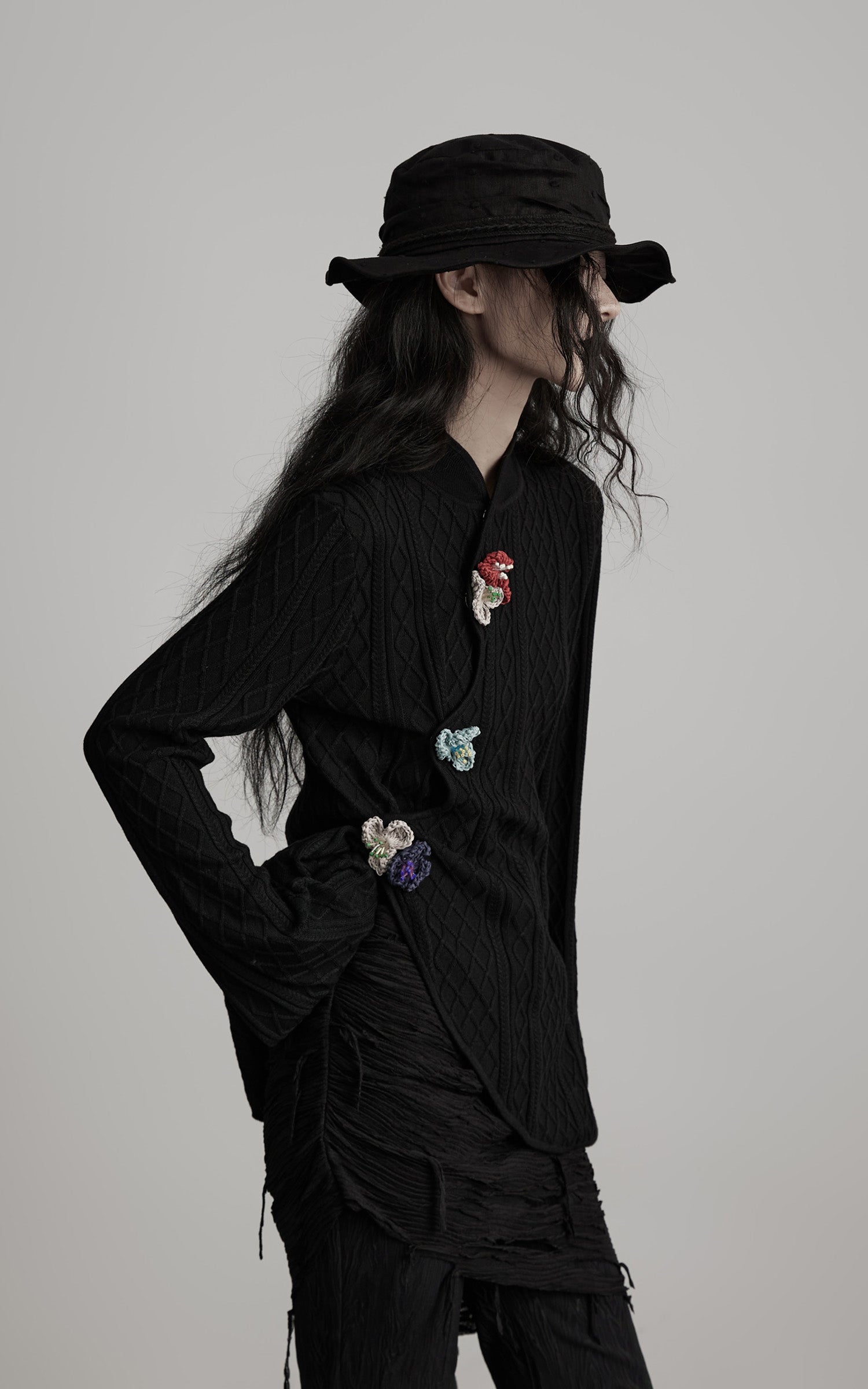 A sculptural knit top cut with quiet precision. The diamond-patterned texture molds softly around the frame, while the body folds diagonally into an asymmetric silhouette. Three hand-crocheted floral knots—each in contrasting hues—trace along the curve of the closure, balancing craft with control. The elongated sleeves extend past the wrist, amplifying its draped, monastic aura. Beneath the darkness of the knit lies a pulse of color, an understated rebellion against uniform stillness.