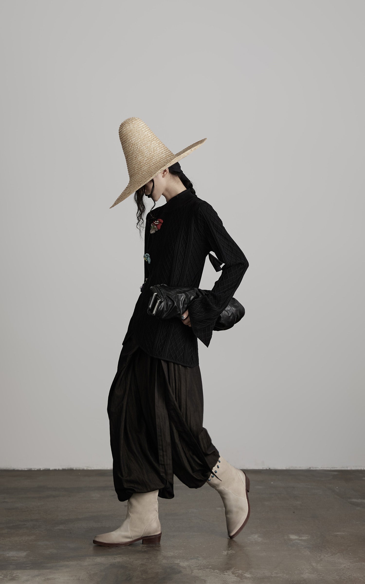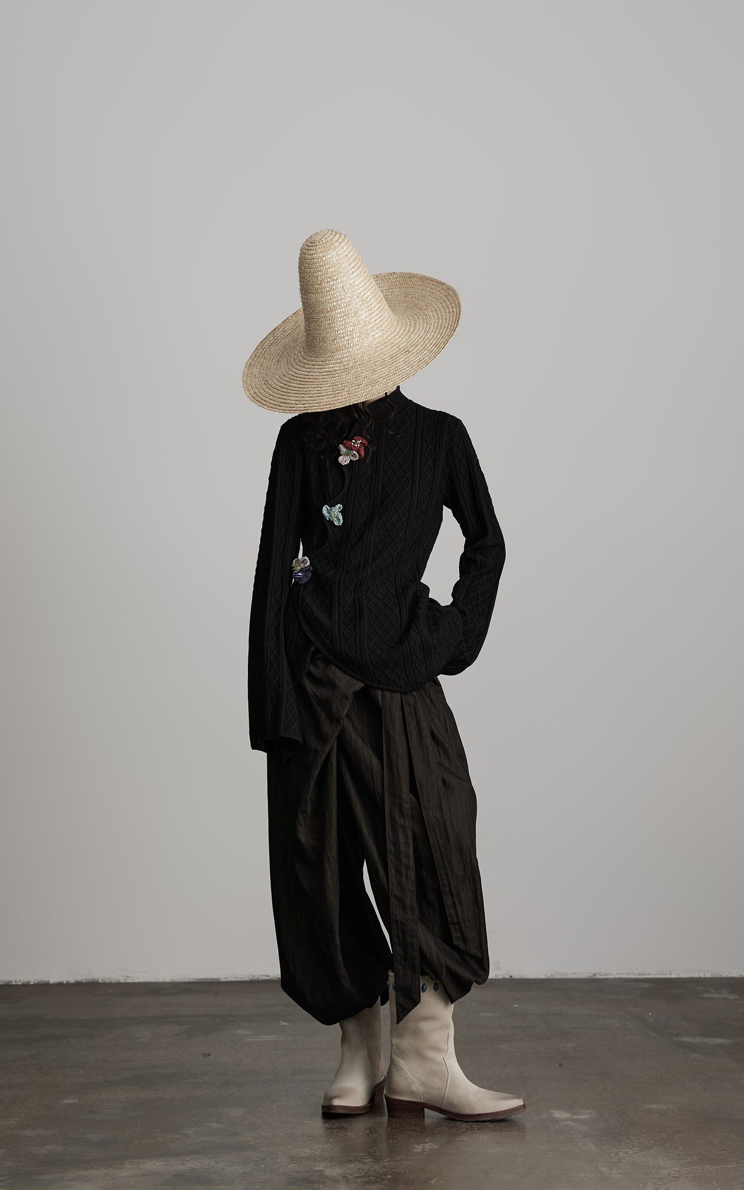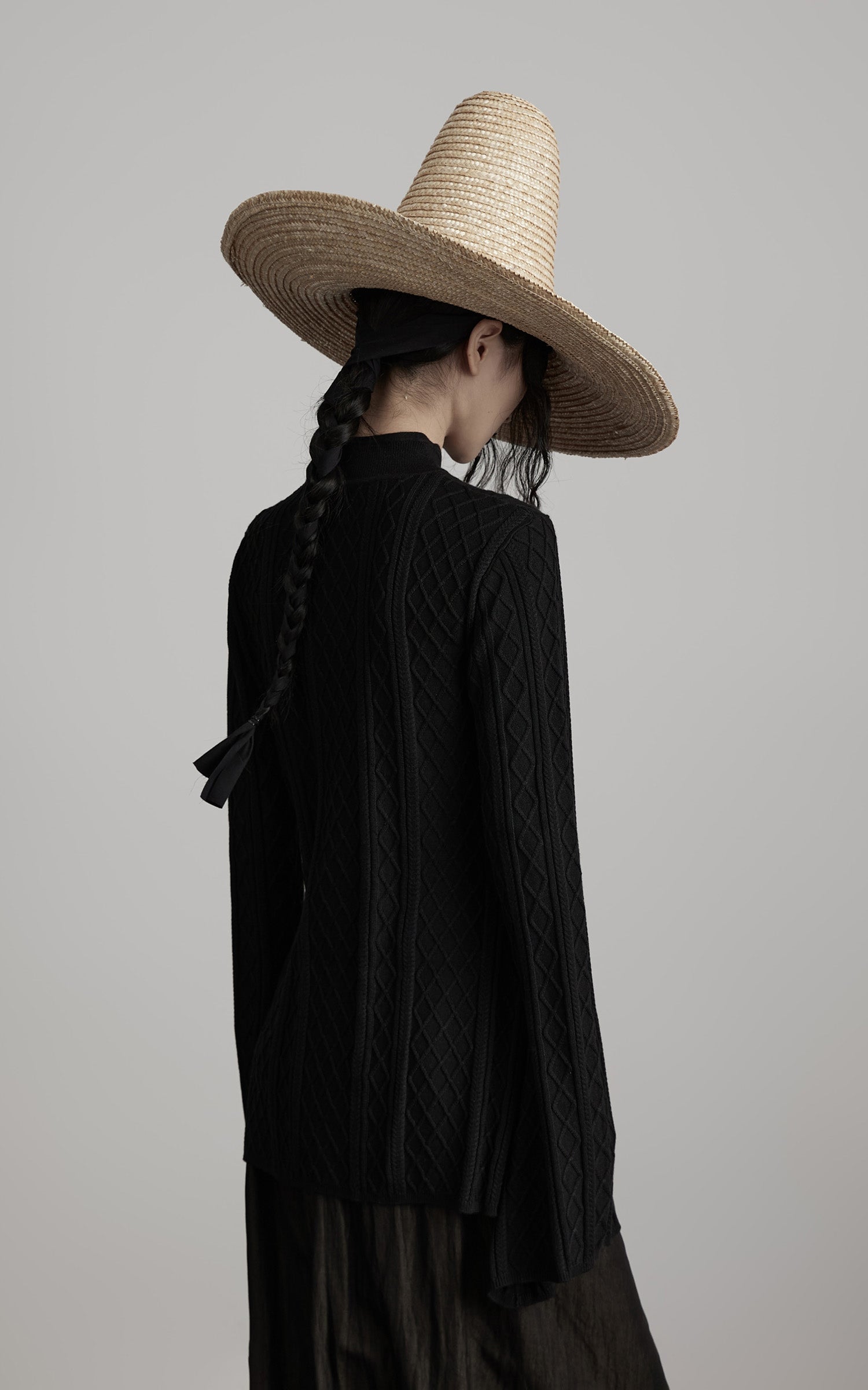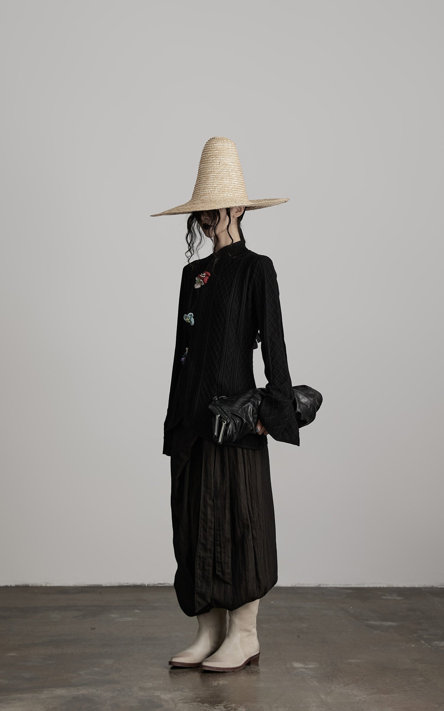 A sculptural knit top cut with quiet precision. The diamond-patterned texture molds softly around the frame, while the body folds diagonally into an asymmetric silhouette. Three hand-crocheted floral knots—each in contrasting hues—trace along the curve of the closure, balancing craft with control. The elongated sleeves extend past the wrist, amplifying its draped, monastic aura. Beneath the darkness of the knit lies a pulse of color, an understated rebellion against uniform stillness.