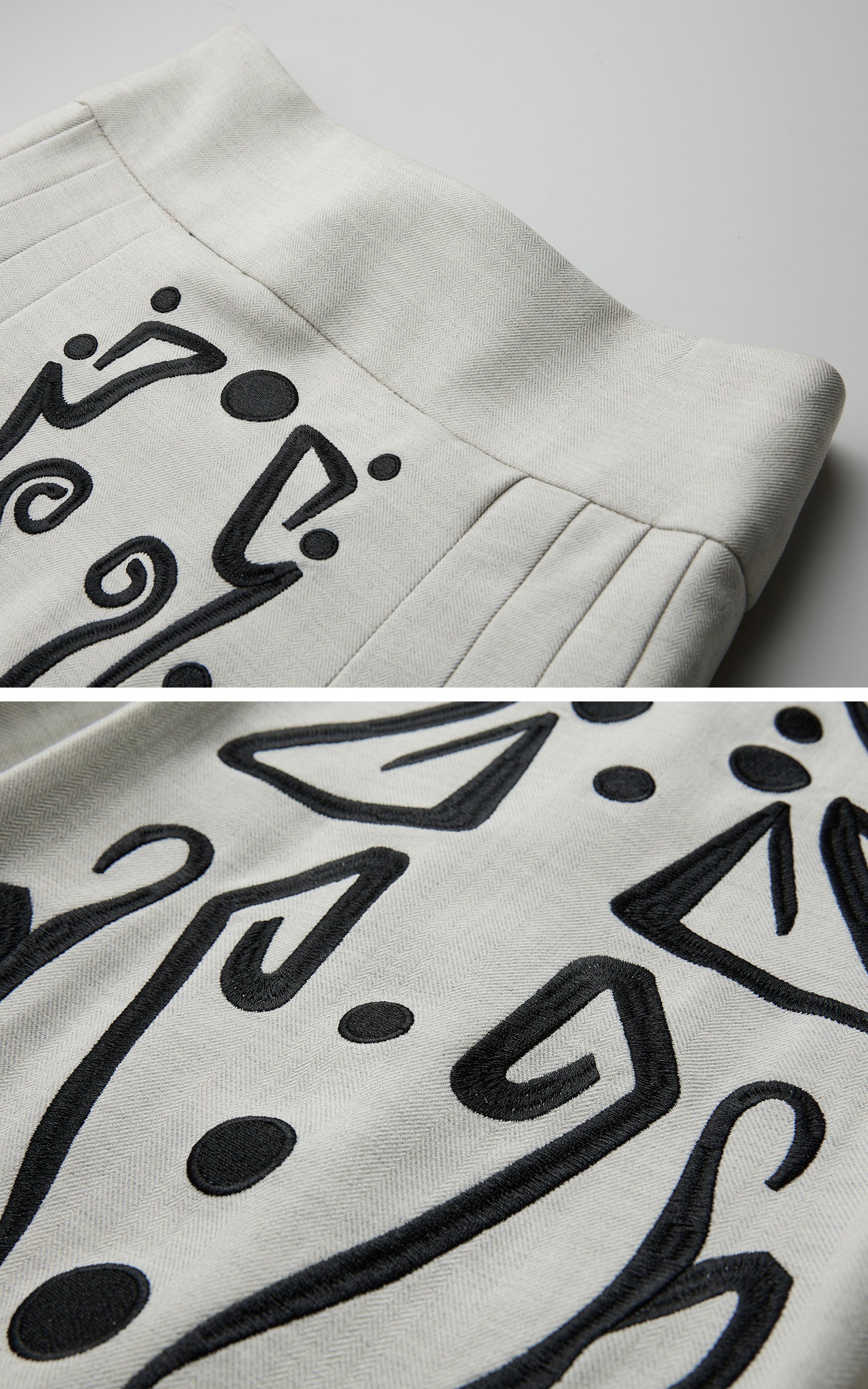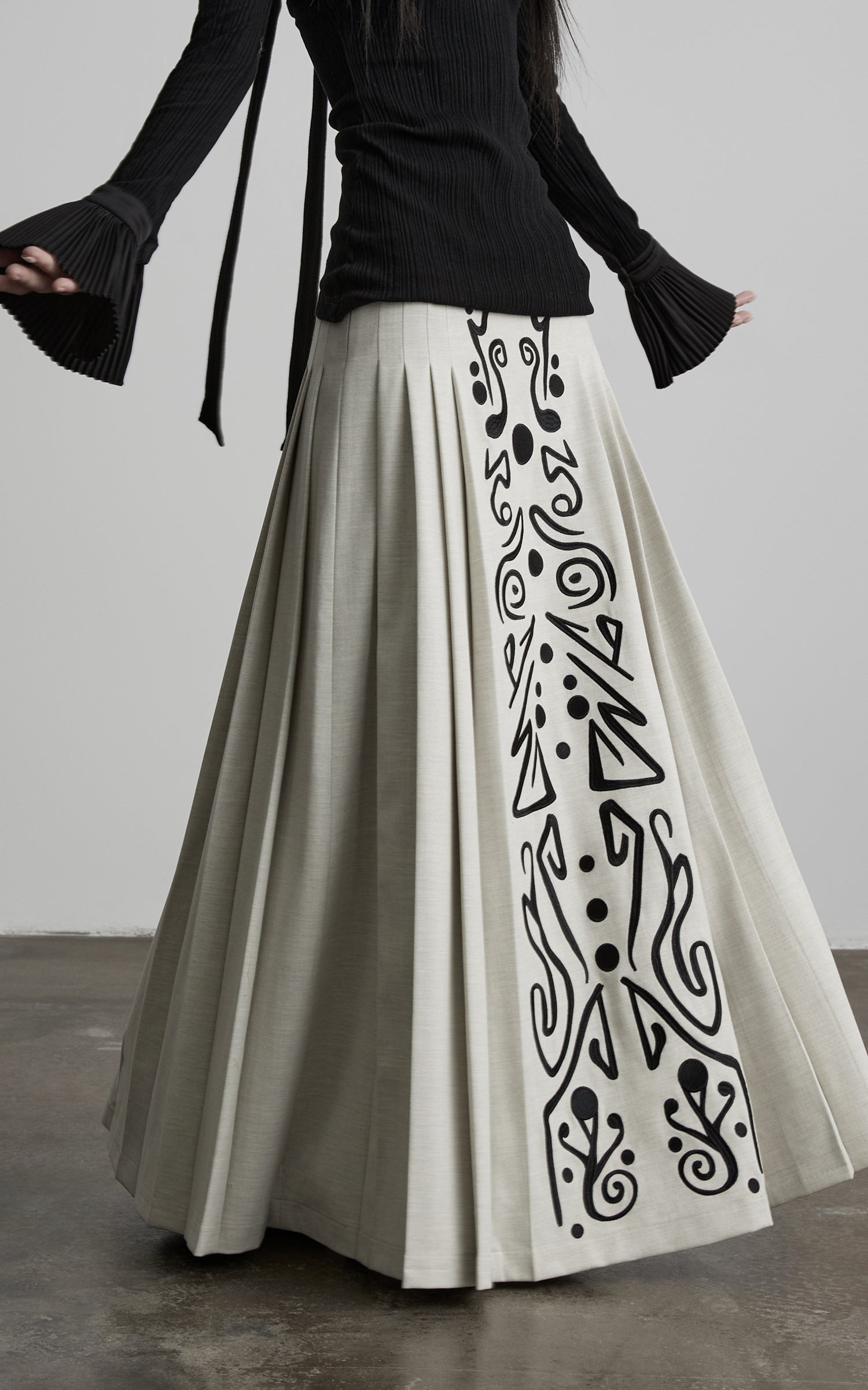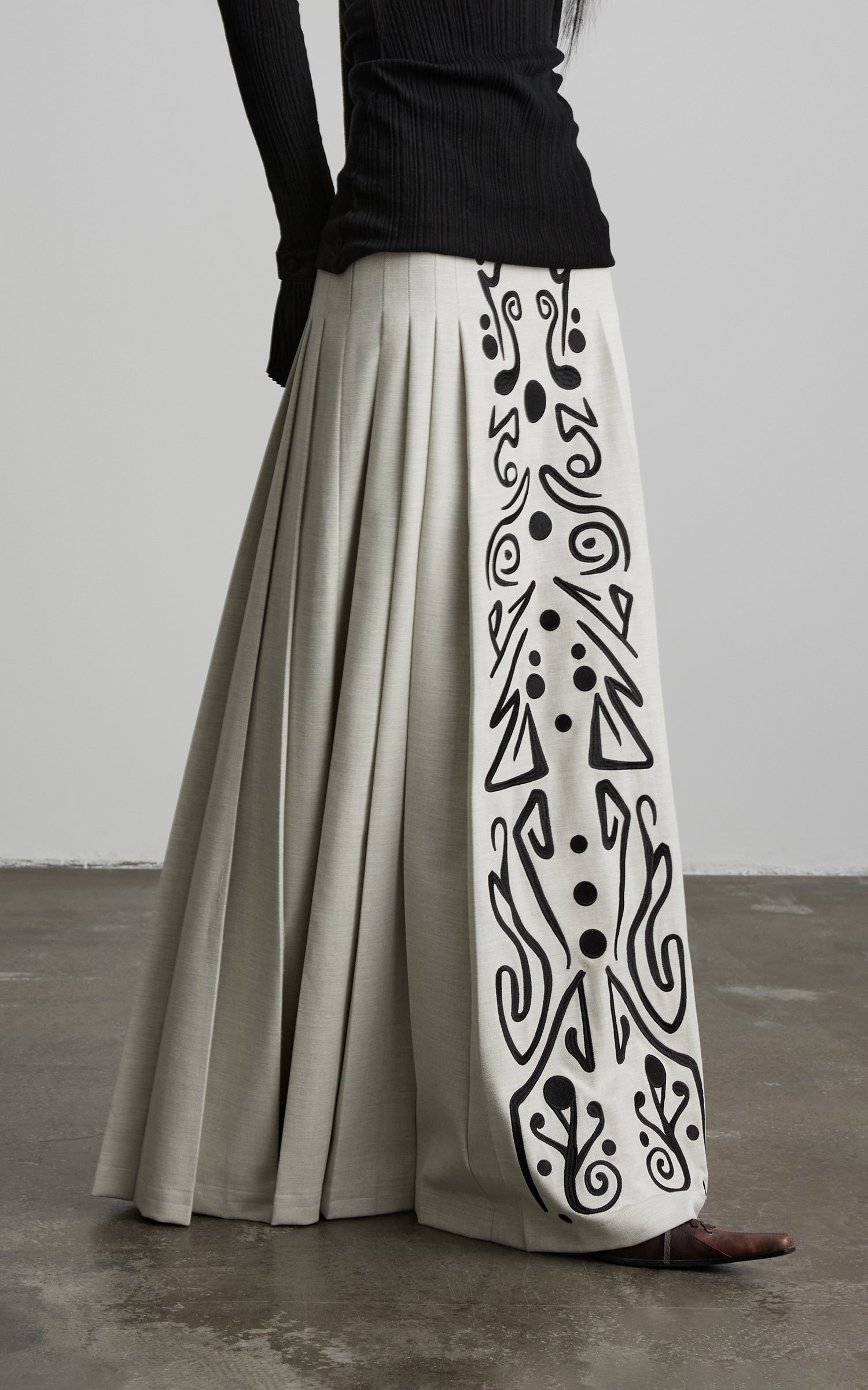 This maxi skirt is shaped with a high-waisted, elongated silhouette and soft vertical pleats that extend the body line while allowing fluid movement. A central embroidered panel runs along the front axis, combining symbolic motifs with graphic restraint to create a focused visual tension. The subtly textured fabric carries a gentle weight, keeping the structure grounded yet responsive, resulting in a composed, ritual-like piece that pairs naturally with fitted tops or architectural outer layers.
