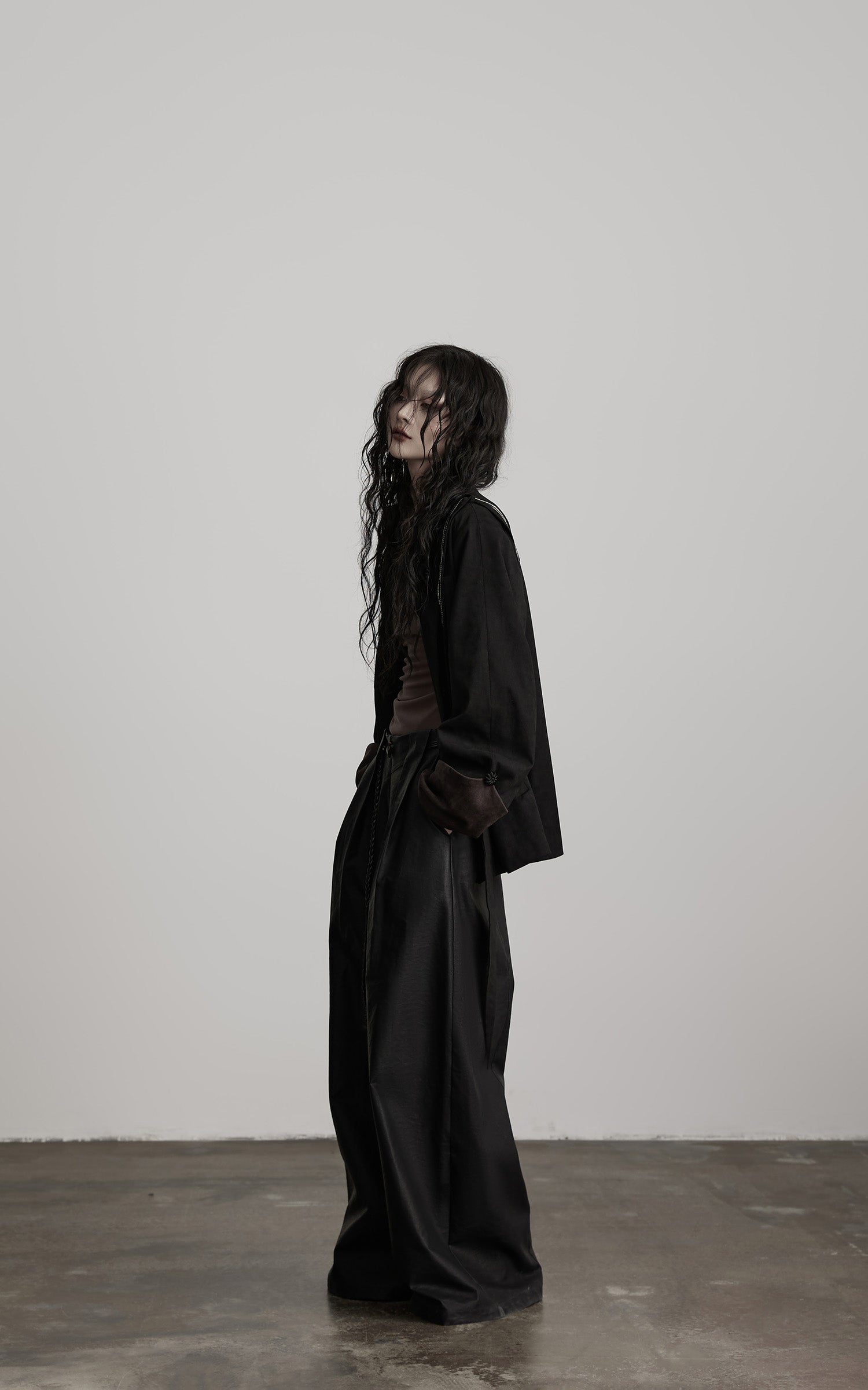 A jacket shaped by shadows and silence, structured with wide sleeves and a sharp collar. Embroidered straps fall along the body like fractured lines of tradition, intersecting with the fluid rhythm of modern drapery. Folded cuffs reveal muted contrast, while hand-crafted knot buttons seal the piece with quiet intricacy. Loose yet precise, it moves between formality and collapse, carrying a weight both ceremonial and undone.