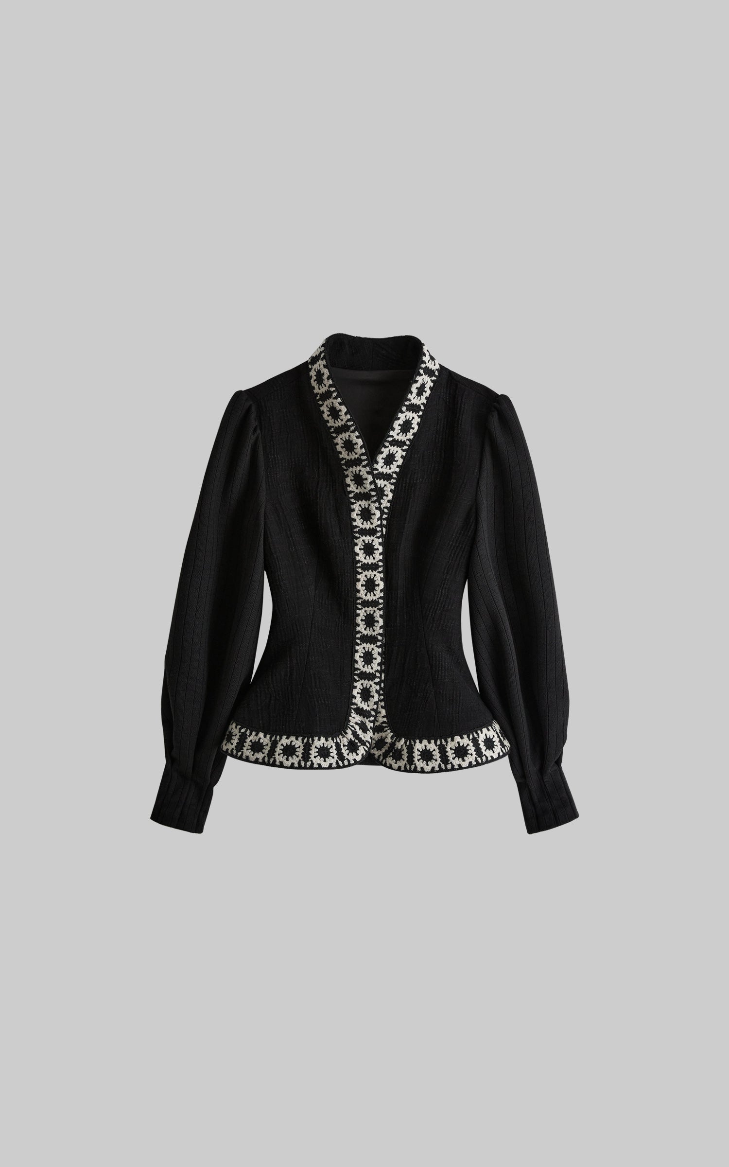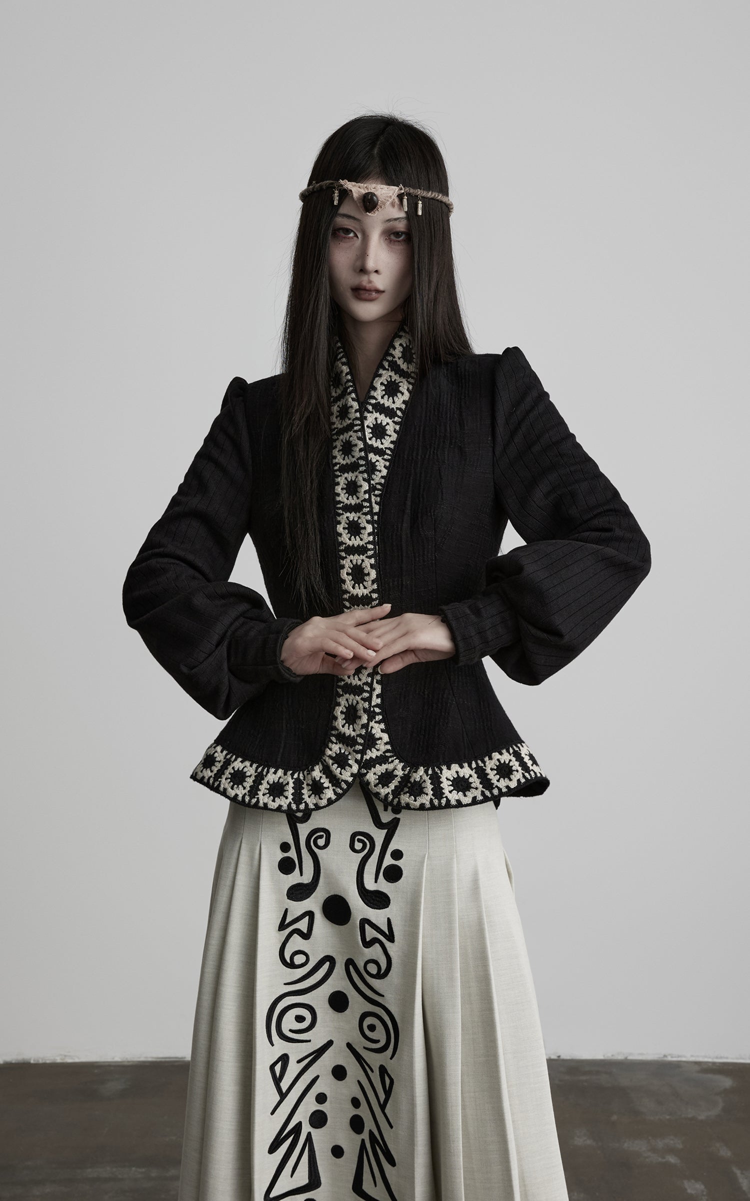 This jacket is defined by a sculpted, fitted silhouette shaped through precise vertical paneling and a gently cinched waist. Contrasting embroidered trims frame the front opening and hem, establishing a restrained yet graphic boundary. Soft volume is introduced through subtly gathered sleeves, creating a measured dialogue between structure and release. A symbolic embroidered motif is placed along the back center line, adding quiet narrative depth to the composition. The textured fabric carries a delicate surface variation, resulting in a composed, ritual-like outer layer with a dark, avant-garde presence, ideal for pairing with elongated skirts or architectural bottoms.