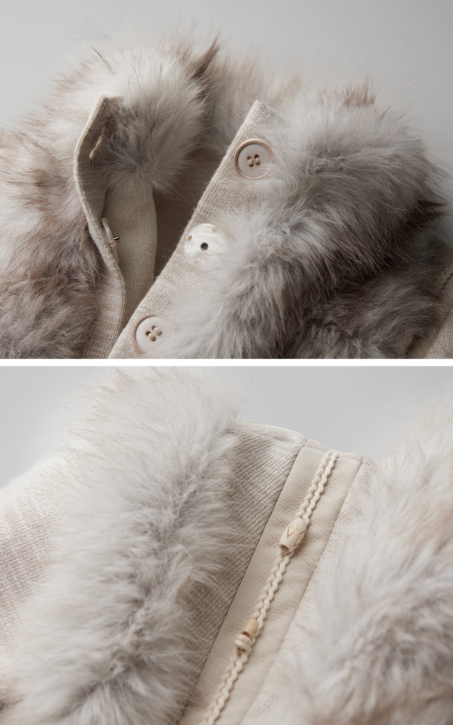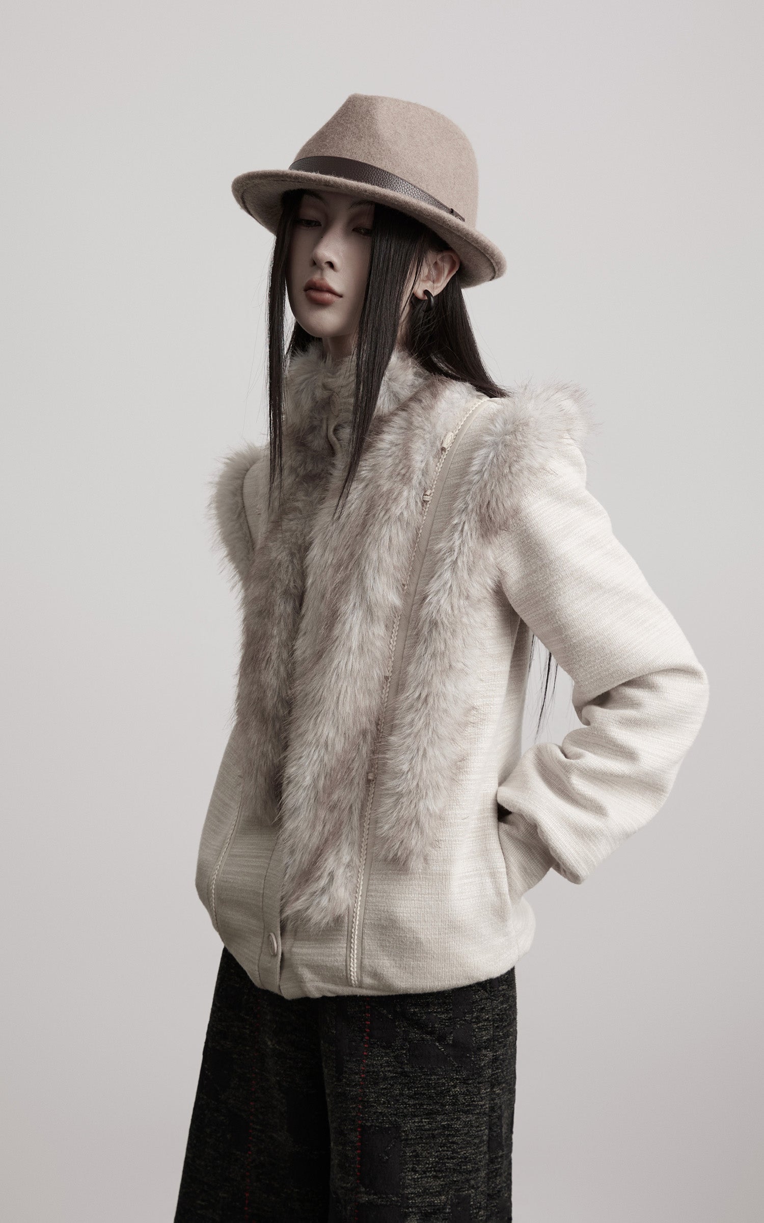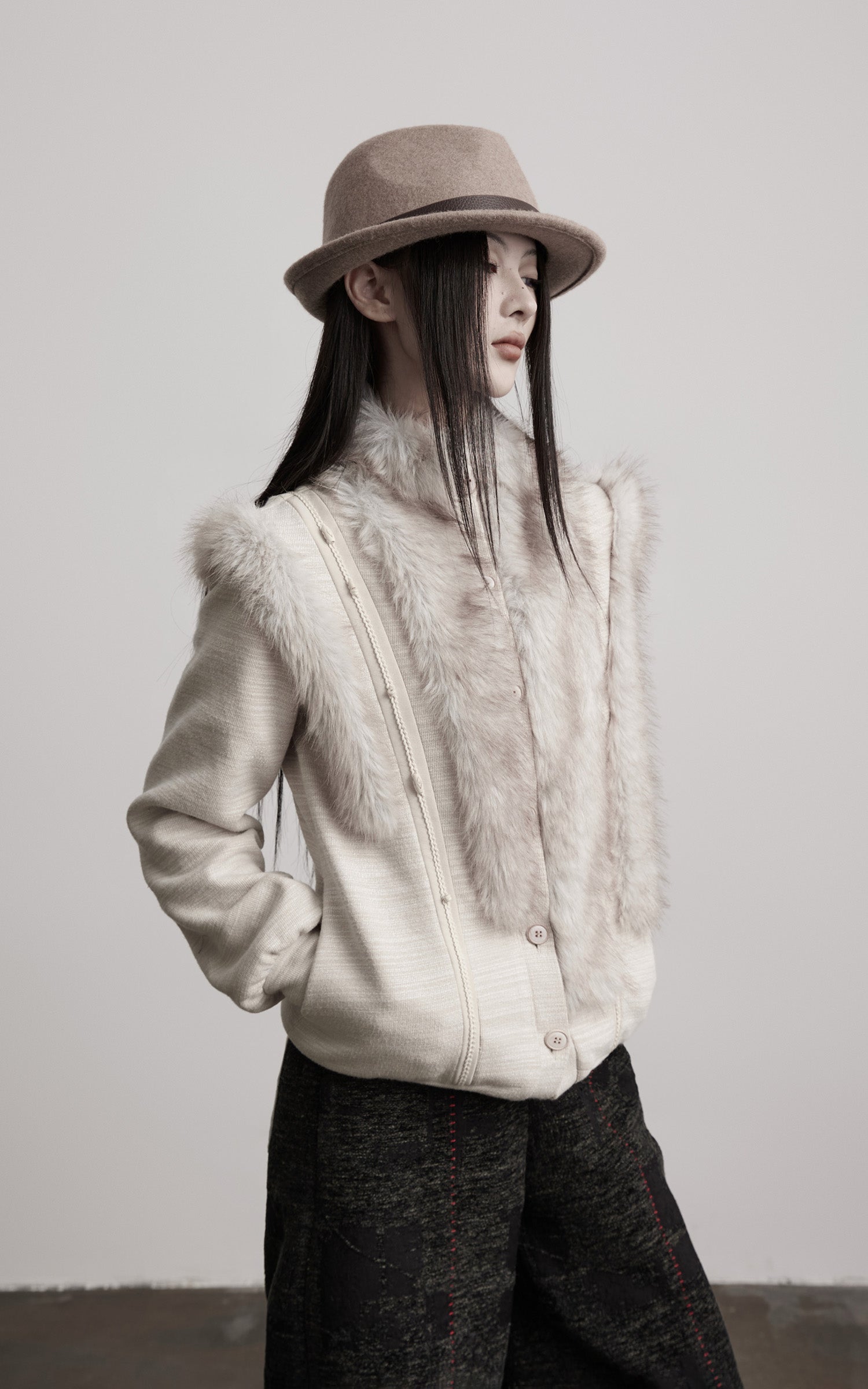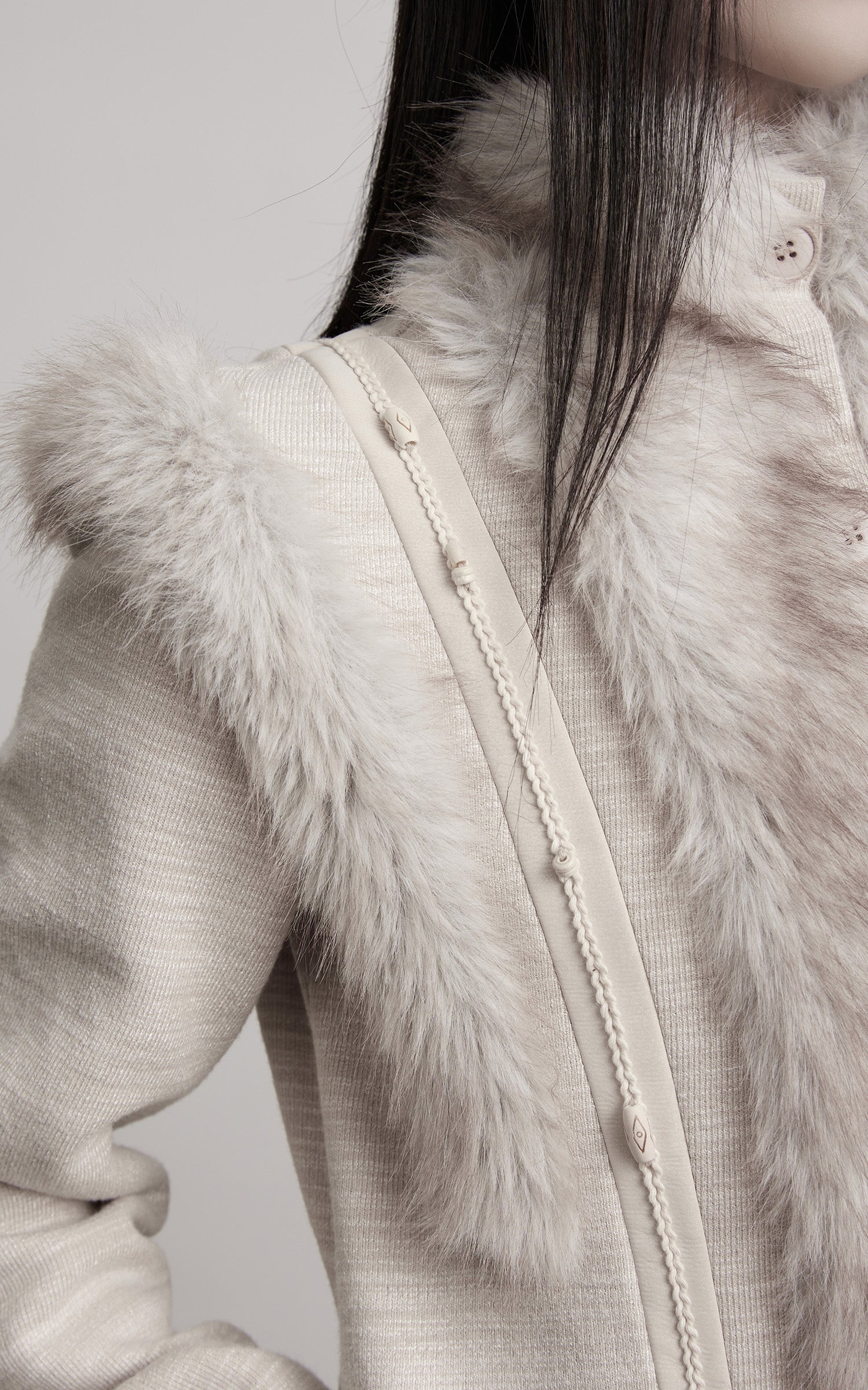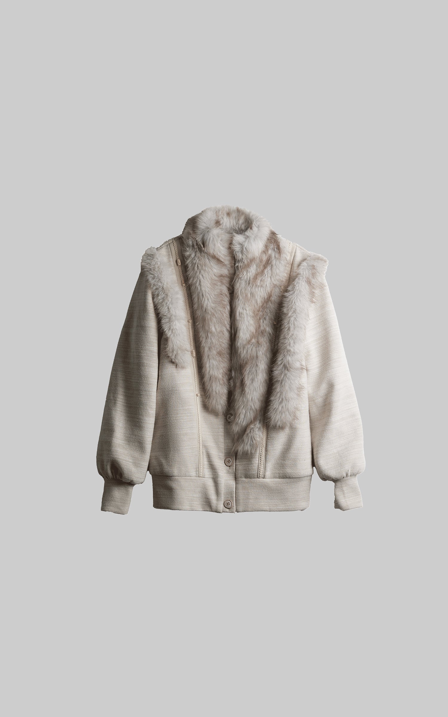 Softly sculpted with a muted presence, this jacket blends a textured knit surface with long faux-fur panels that fall along the front like quiet, tactile veils. Subtle braided details and carved buttons trace the edges, adding ritual-like refinement to the clean, rounded shape. The piece balances warmth and restraint — plush fur framing a structured body, creating a gentle contrast between softness and discipline. Designed for layered winter dressing, it embodies a serene, avant-garde sensibility.