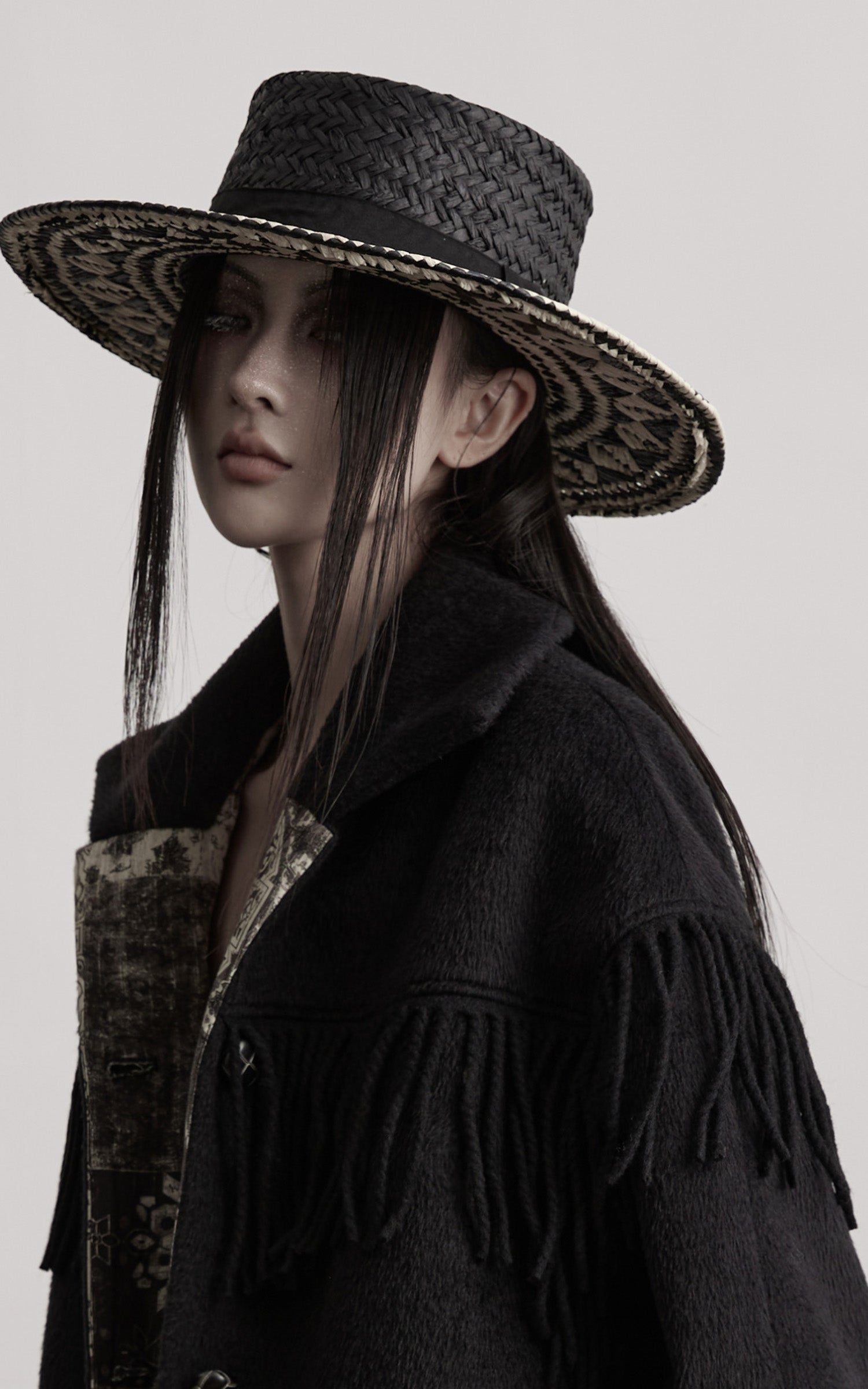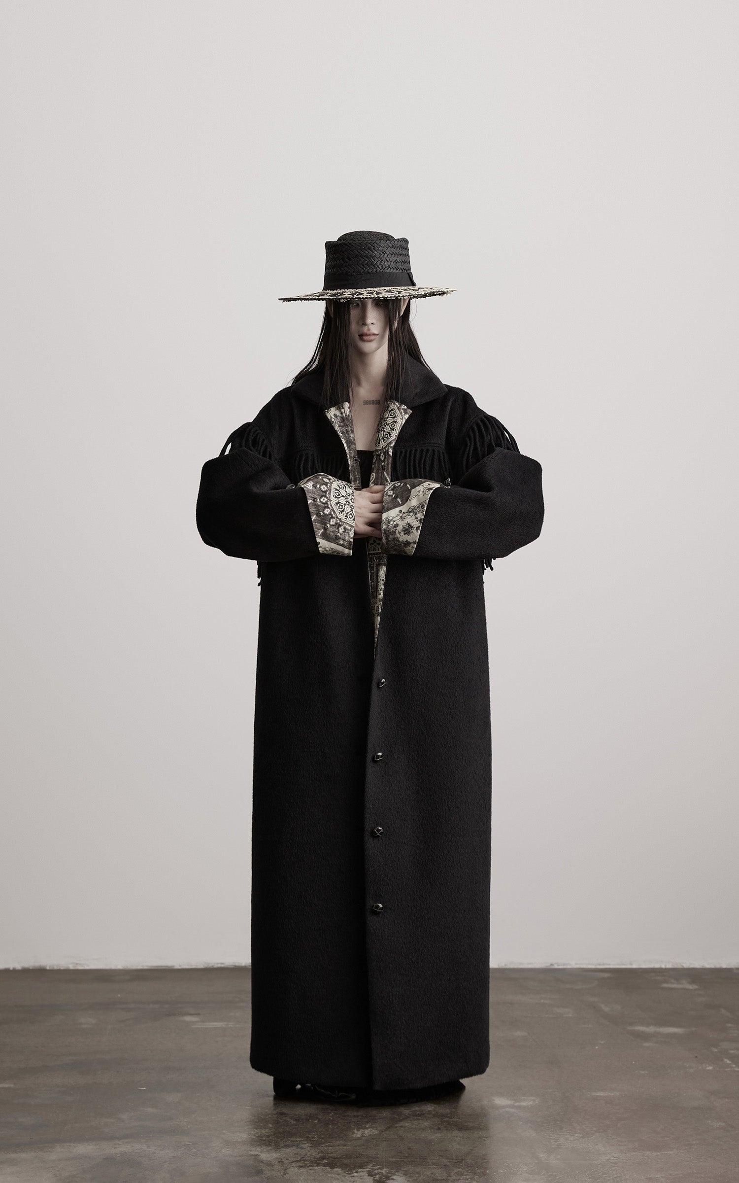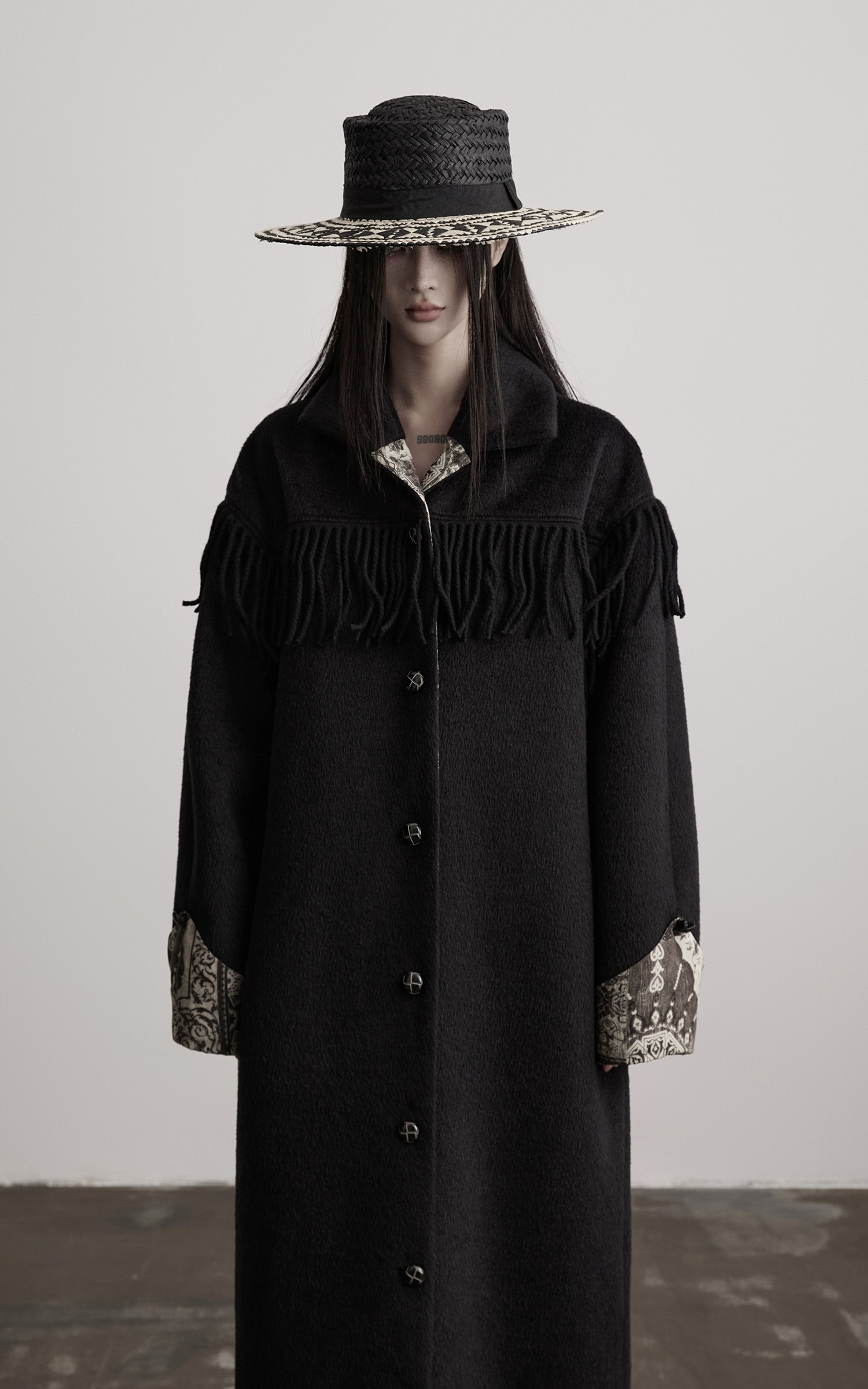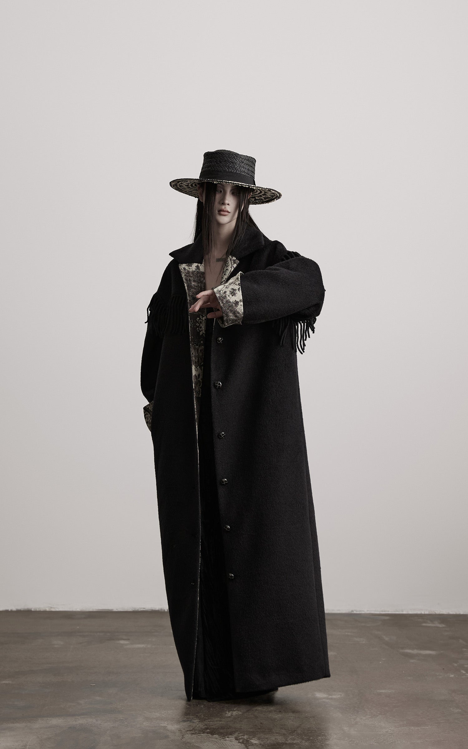 This long coat is built from a dense, shadowed wool fabric, shaped into an elongated silhouette with quiet weight. Fringe details trace the line across the shoulders, adding movement and a subtle sense of ritual. The contrasting patterned lining reveals itself at the cuffs and collar, interrupting the darkness with muted, ornate motifs. Finished with sculpted buttons and a structured collar, the coat carries a solemn presence—minimal yet adorned, austere yet expressive.