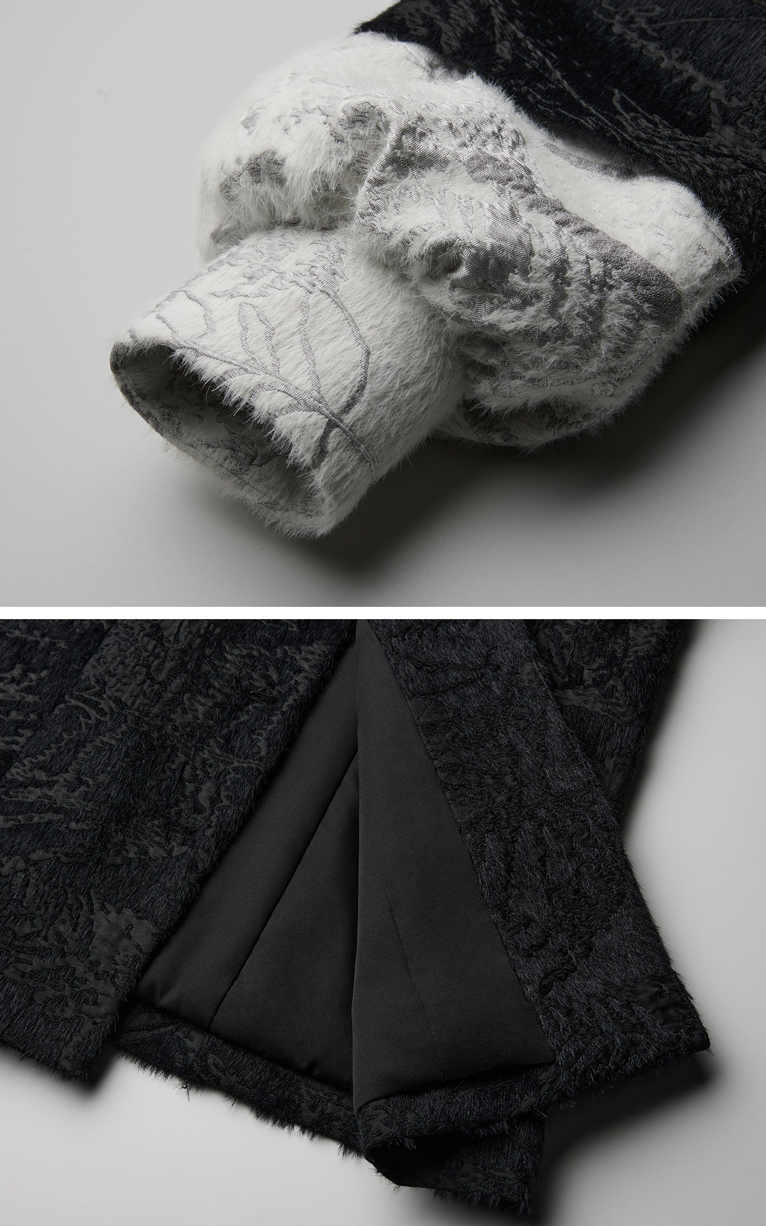 This jacket is shaped by a fitted silhouette and structured high neck, defined through precise paneling that sharpens the vertical line. The textured surface introduces subtle depth, contrasted by layered construction beneath. Crescent-shaped metal buttons run along the front axis, adding sculptural tension and a quiet sense of ritual. Sleeves are finished with contrasting cuff panels that reveal a softer texture when folded, balancing restraint with tactile contrast. The hem tapers naturally, resulting in a controlled, avant-garde outer layer designed to anchor a composed, directional look.