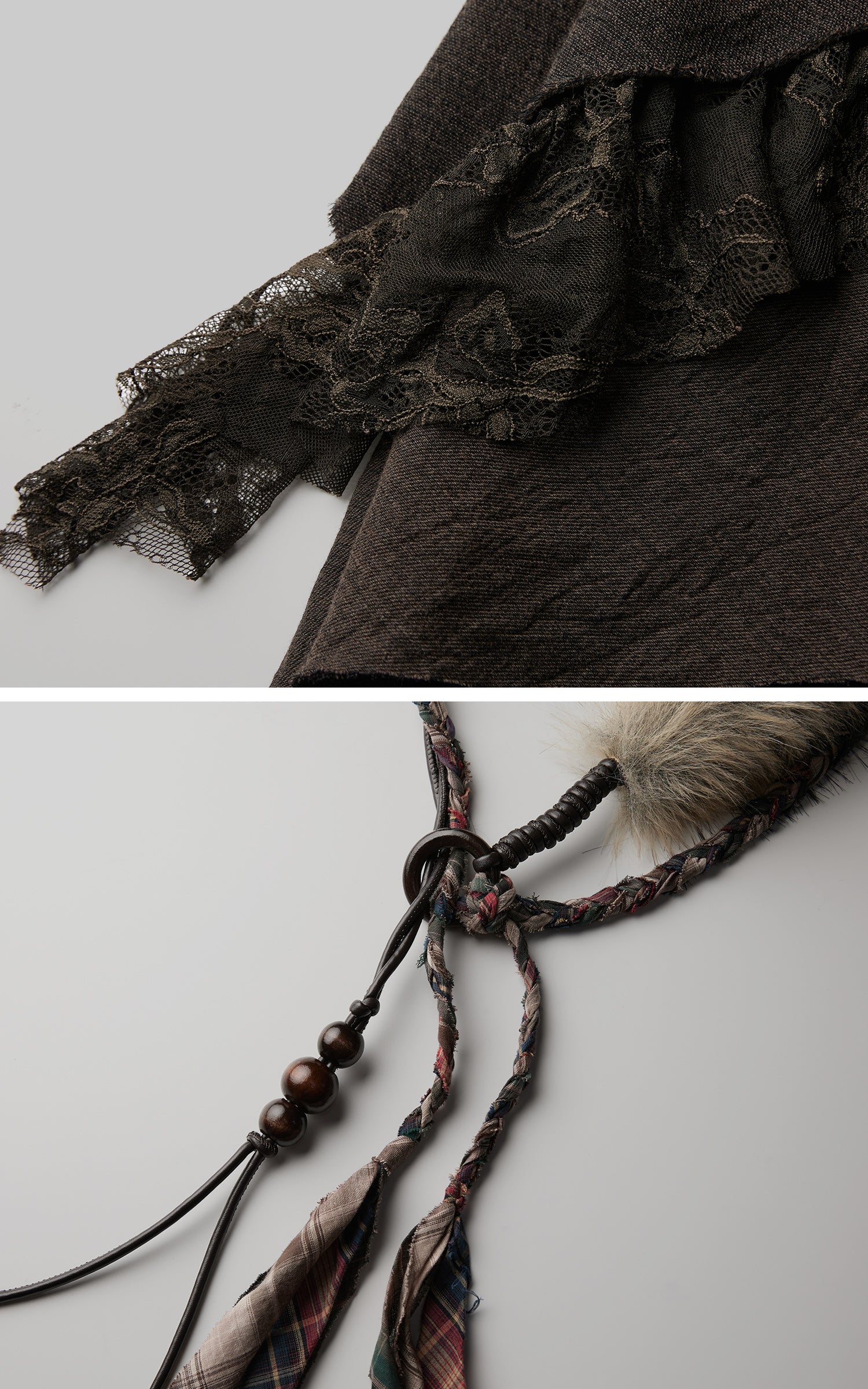 This skirt blends raw tactility with layered movement. Textured panels fall in shifting, uneven lengths, edged with dark lace that adds depth and shadow. At the waist, a braided belt of mixed fabrics winds through wooden beads and a soft fur accent, creating a ritual-like focal point. The silhouette is loose yet intentional, shaped for motion and asymmetry. Earthy tones, frayed edges, and nomadic details give the piece a grounded, atmospheric presence.