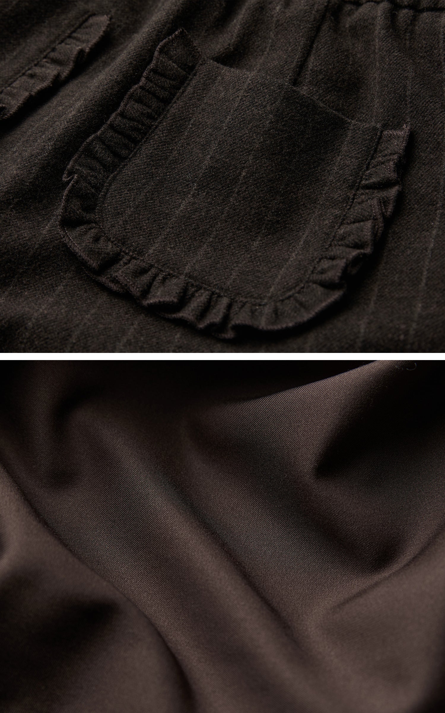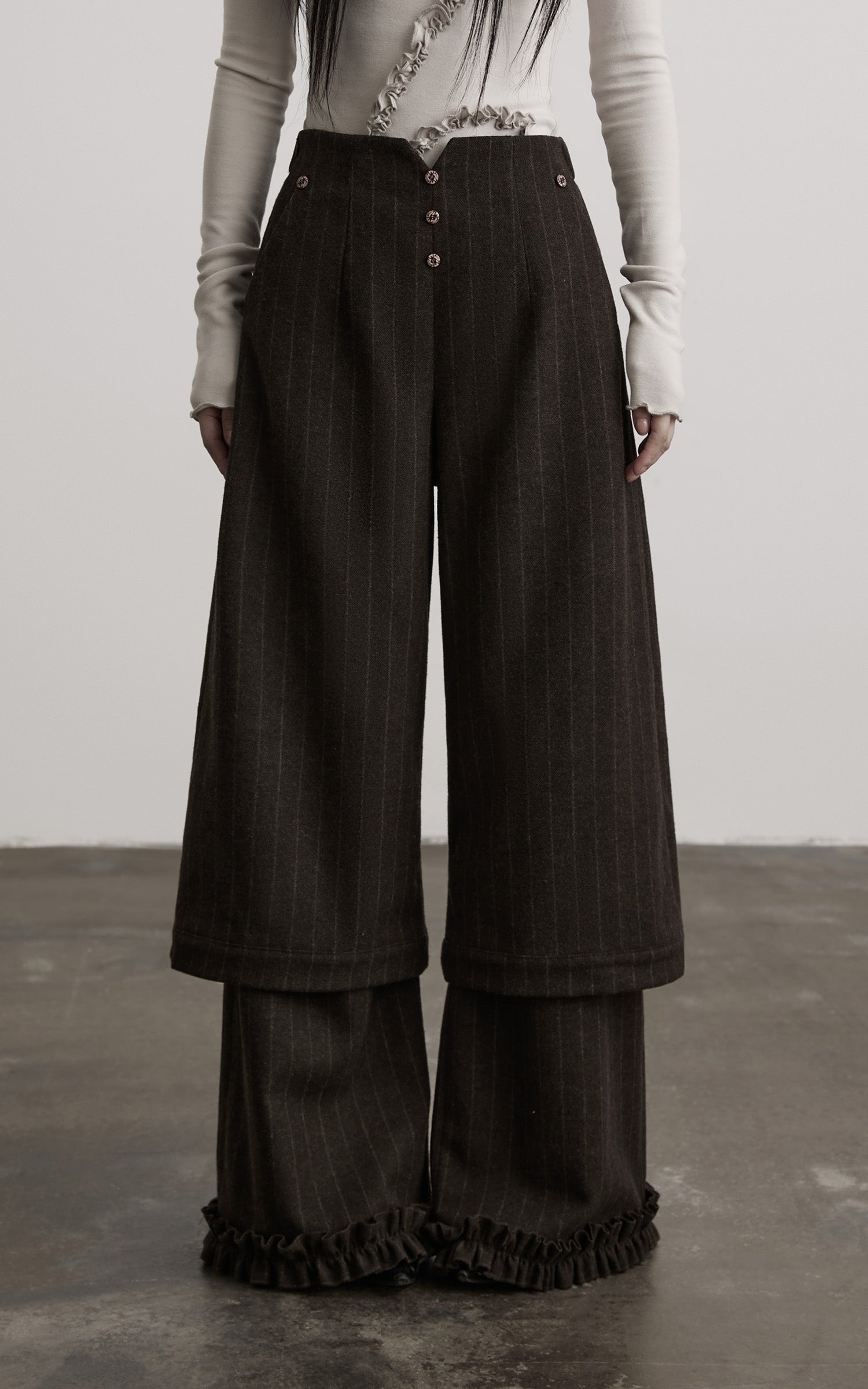 These high-waisted wide-leg trousers feature a layered construction with a cropped upper panel over a full-length base, creating subtle shifts in proportion and depth. Vertical pinstripes refine the silhouette while maintaining a relaxed volume, complemented by decorative front buttons that anchor the structure. An elasticated back waist enhances ease of wear, and the softly gathered hem adds a restrained sense of movement, resulting in a composed yet expressive piece suited for pairing with fitted or deconstructed tops.
