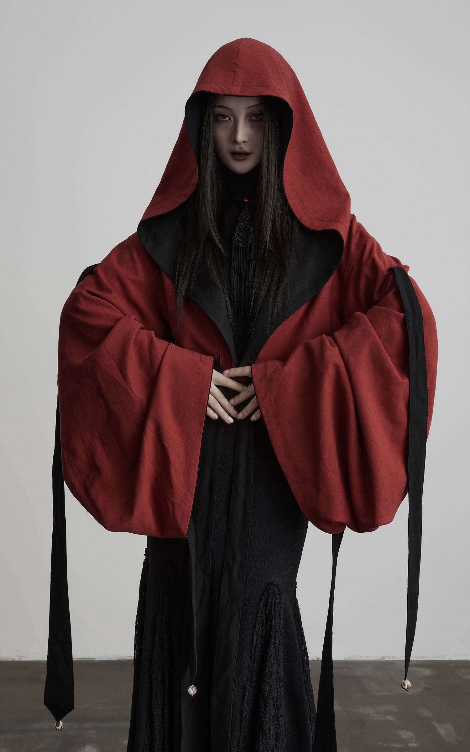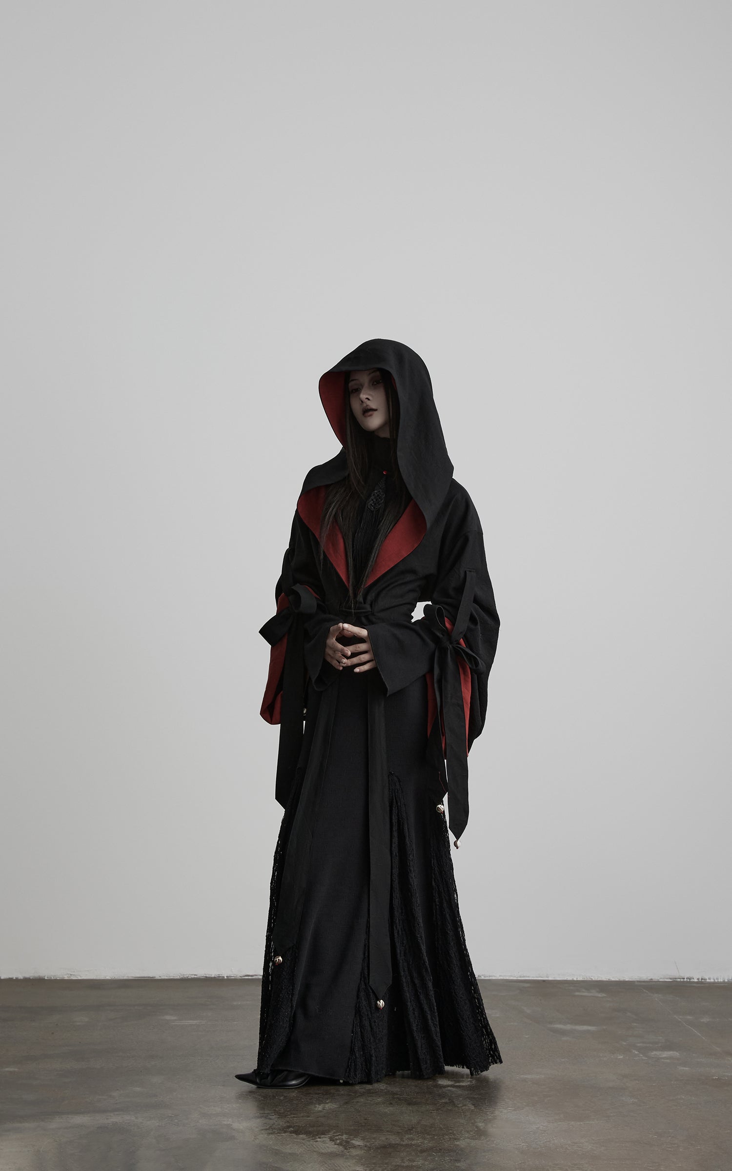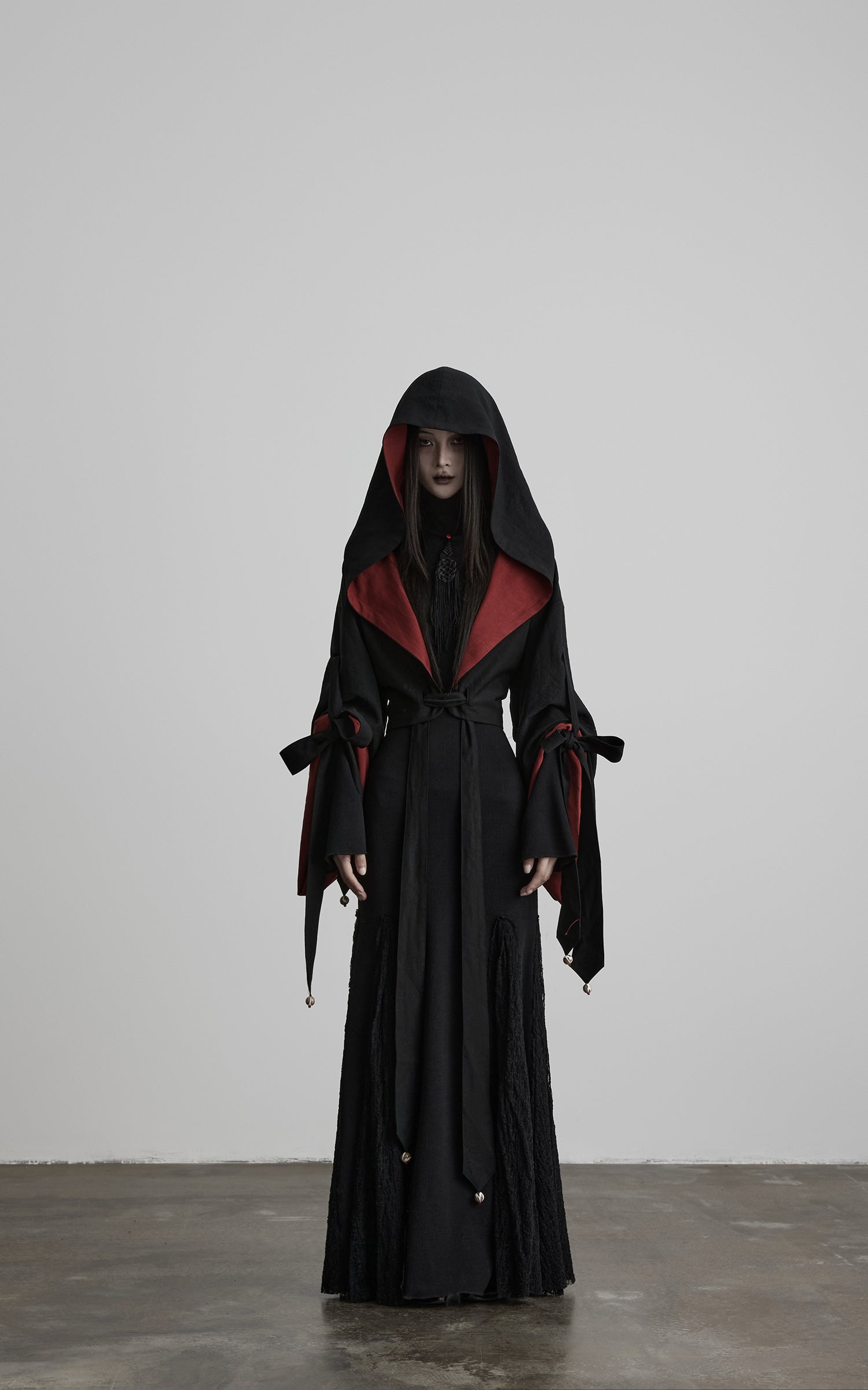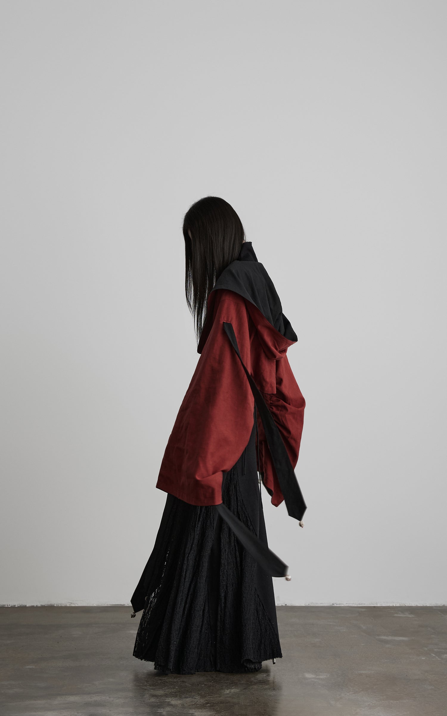 This jacket is designed with a fully reversible construction, defined by contrasting tonal panels that create a restrained yet striking visual depth. A fluid hooded silhouette extends seamlessly into voluminous sleeves, softening the shoulder line and forming an enveloping shape. Multiple tie details along the sleeves and waist fall freely, finished with subtle ornaments that introduce movement with each step. The fabric surface carries a naturally crinkled texture, allowing light and shadow to shift across the form. Balancing ritual-like presence with structural freedom, the piece functions as a commanding outer layer or an expressive statement within layered, avant-garde styling.