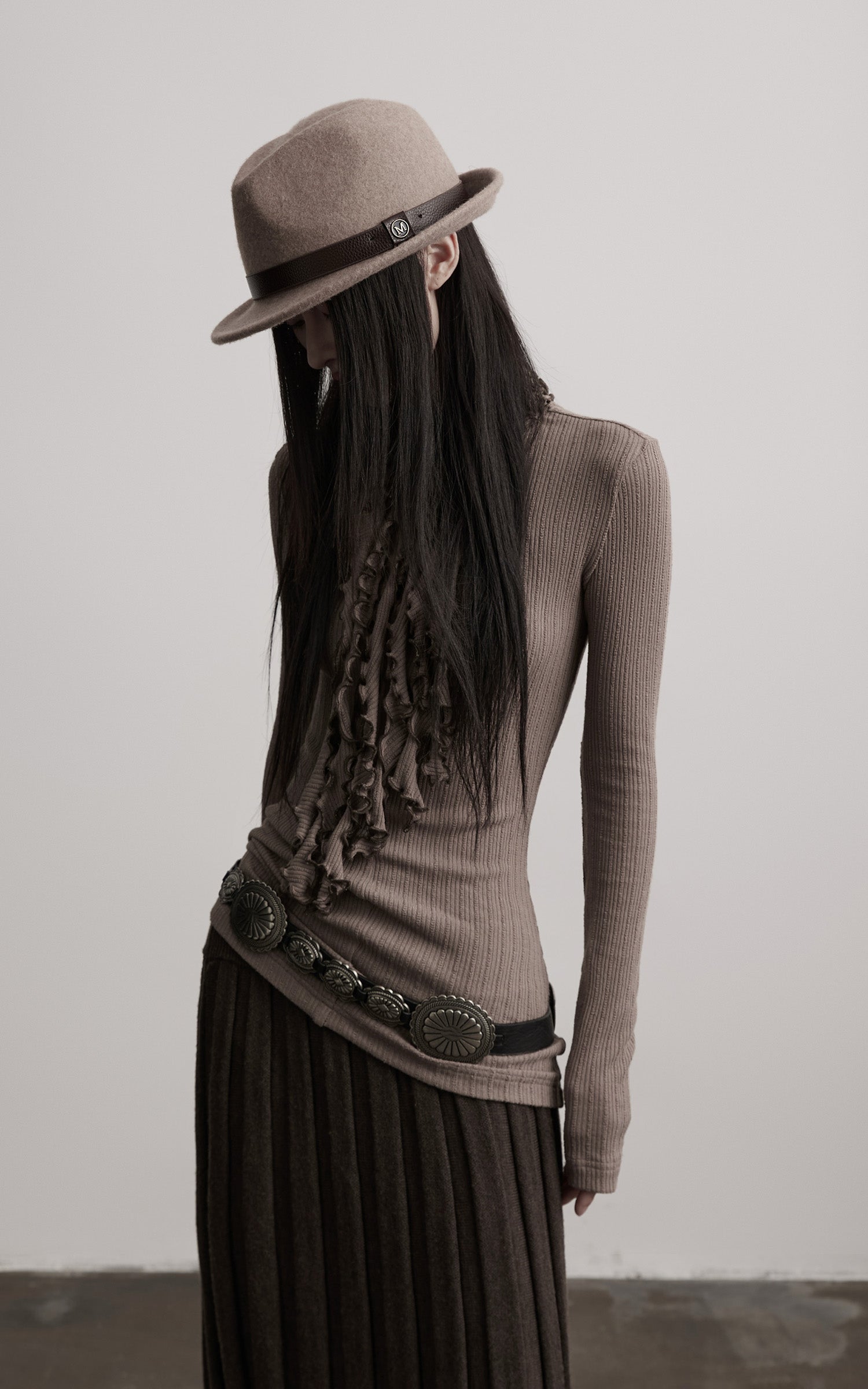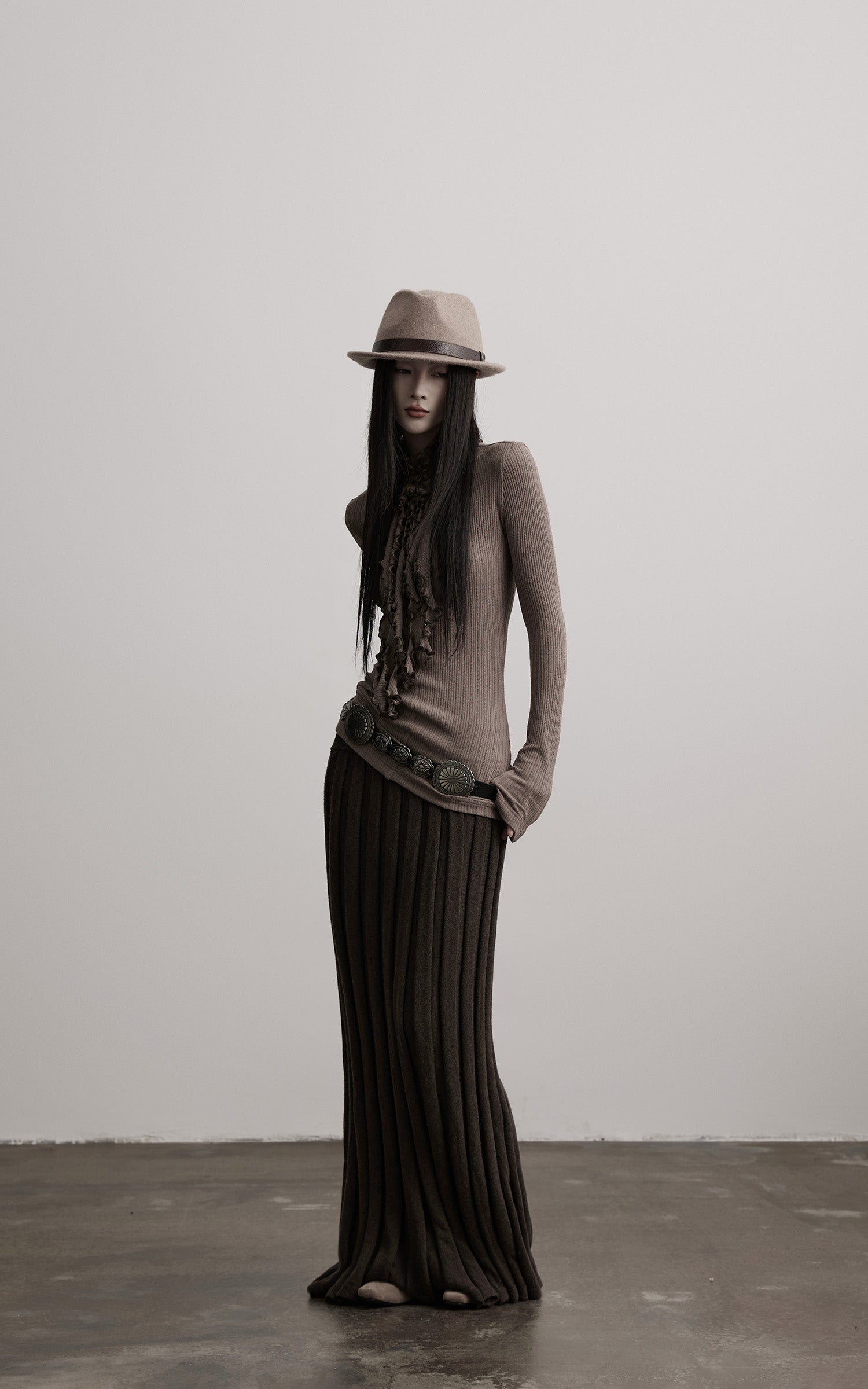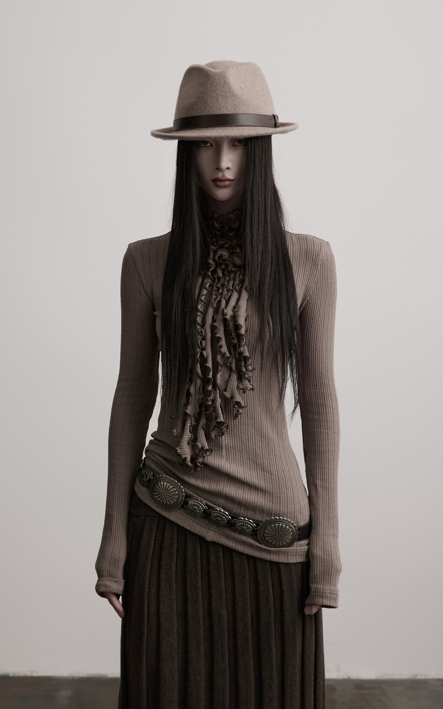 A fitted rib-knit top built with quiet tension and fluid structure. The high neck is gathered into cascading ruched folds, creating a sculptural line that extends down the chest. The textured ribs follow the body with subtle irregularity, offering both stretch and a sense of restraint. Long sleeves extend elegantly past the wrist for an elongated silhouette. A piece that balances softness and severity, ideal for layering within monochrome, earth-toned, or deconstructed ensembles.