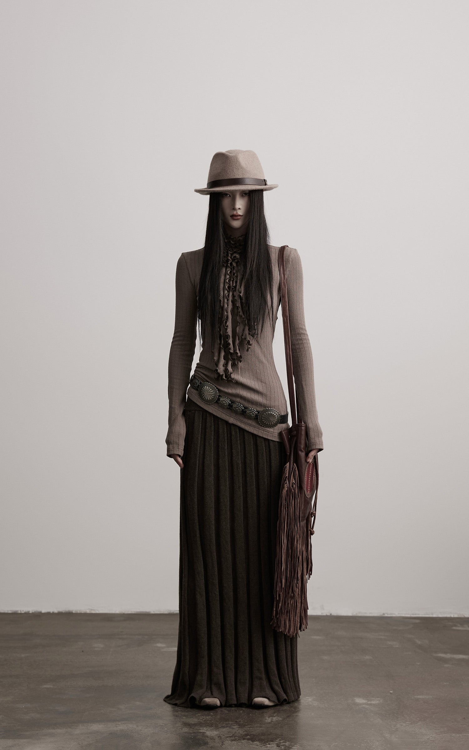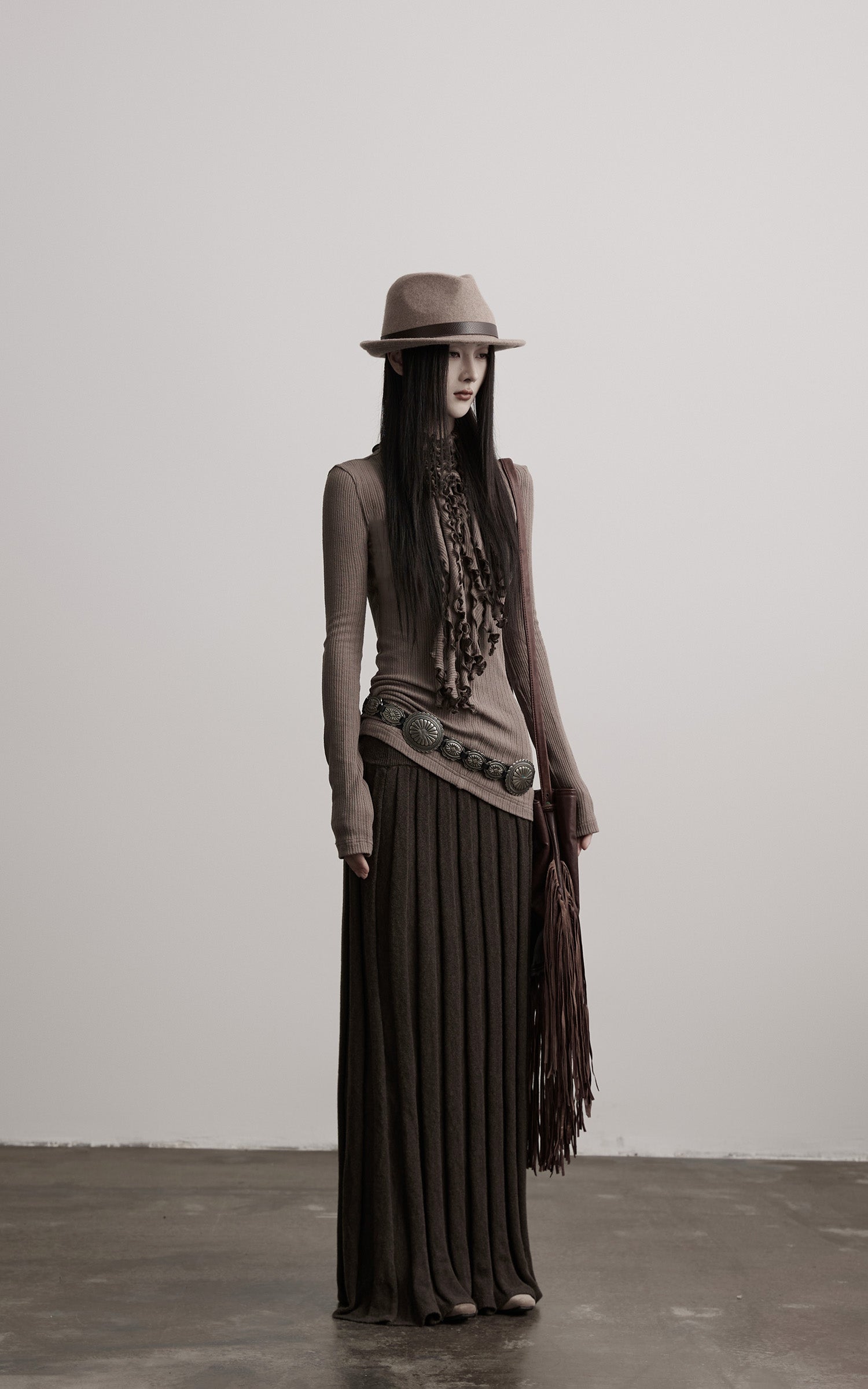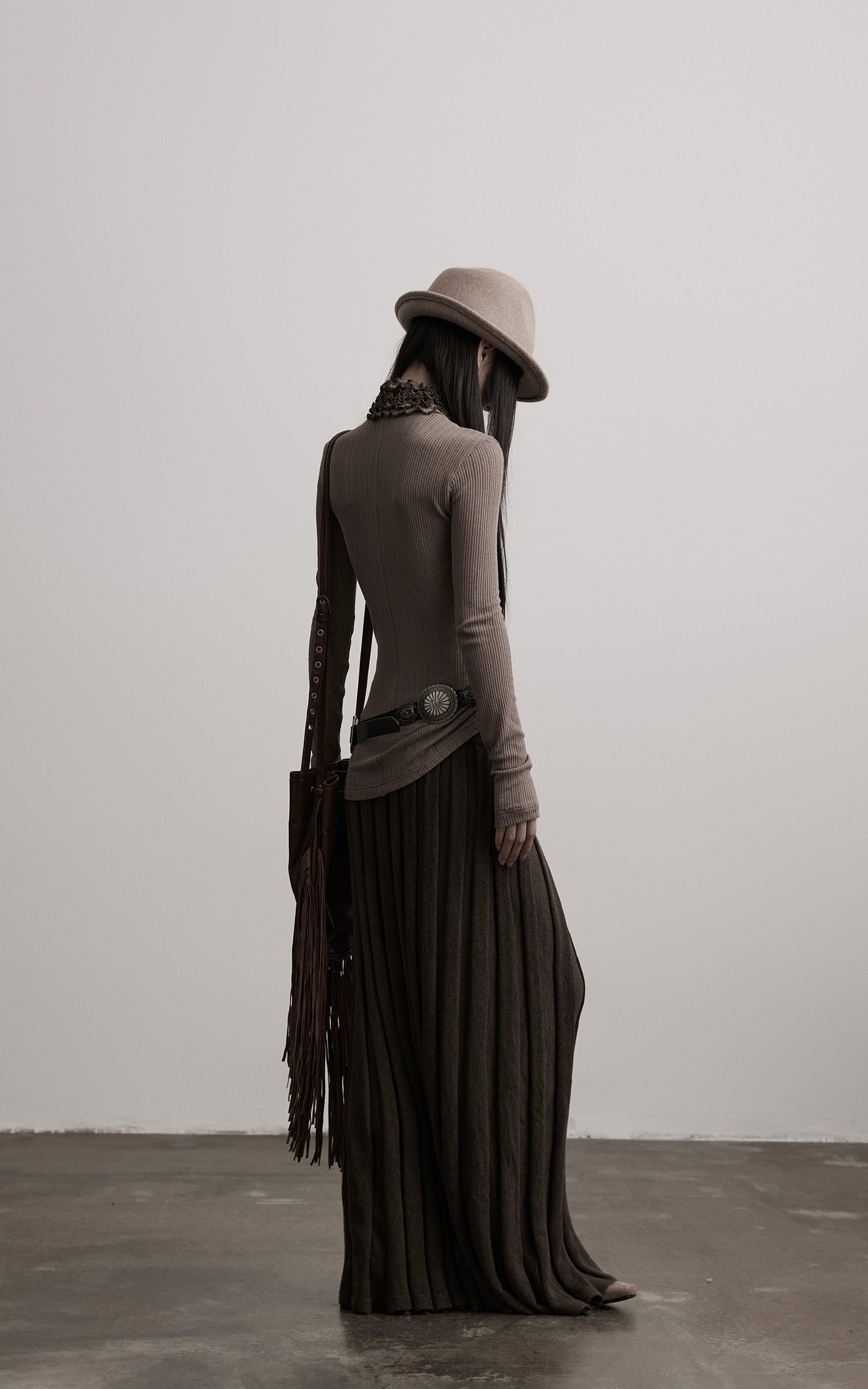 A fitted rib-knit top built with quiet tension and fluid structure. The high neck is gathered into cascading ruched folds, creating a sculptural line that extends down the chest. The textured ribs follow the body with subtle irregularity, offering both stretch and a sense of restraint. Long sleeves extend elegantly past the wrist for an elongated silhouette. A piece that balances softness and severity, ideal for layering within monochrome, earth-toned, or deconstructed ensembles.