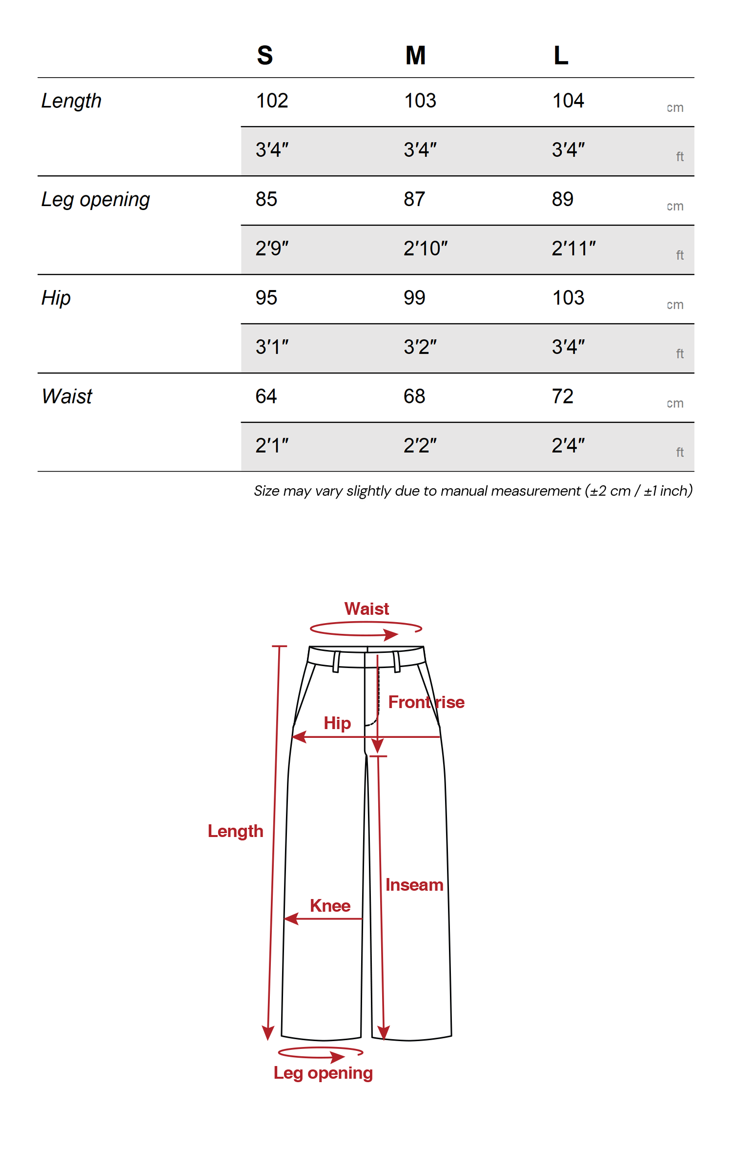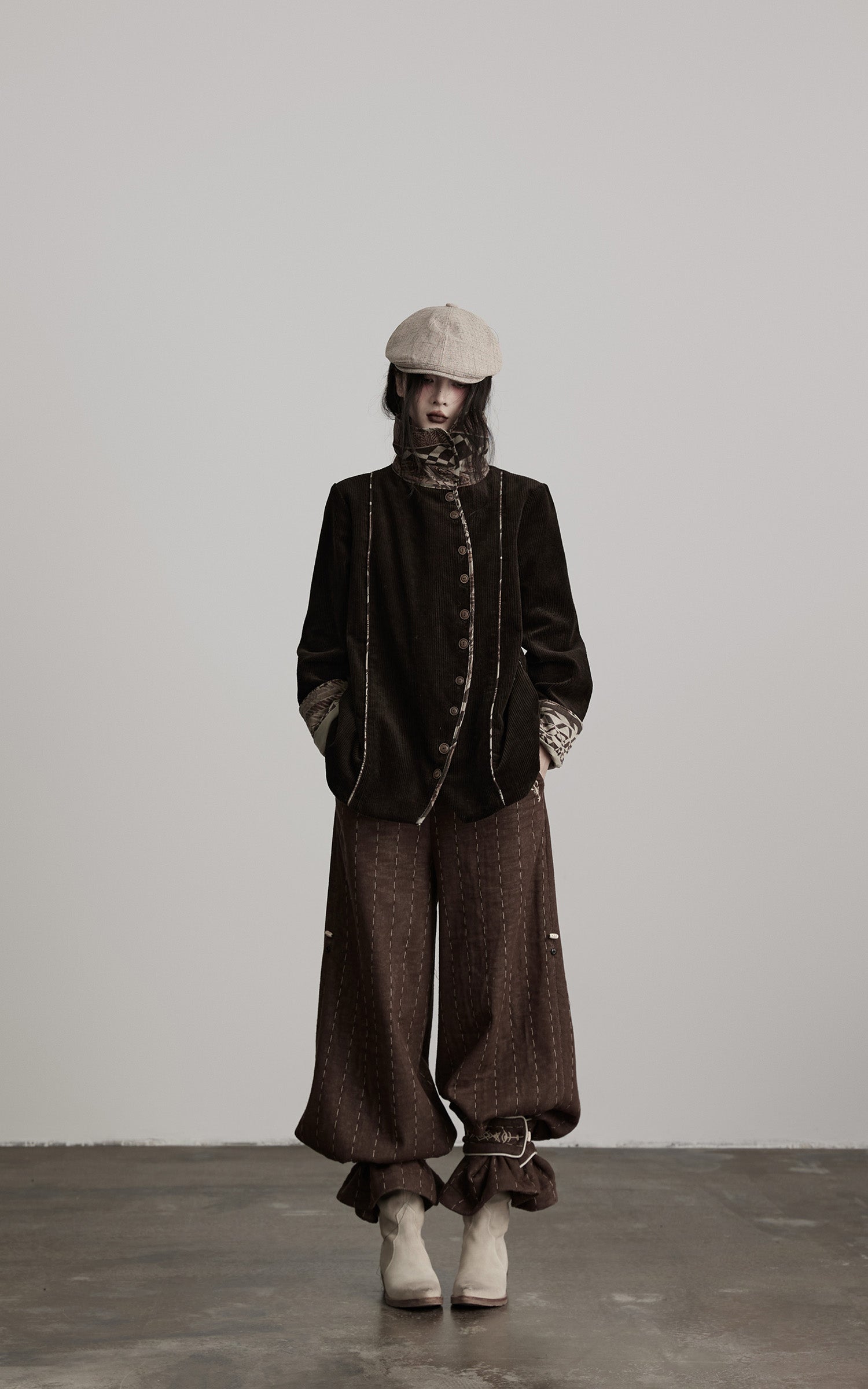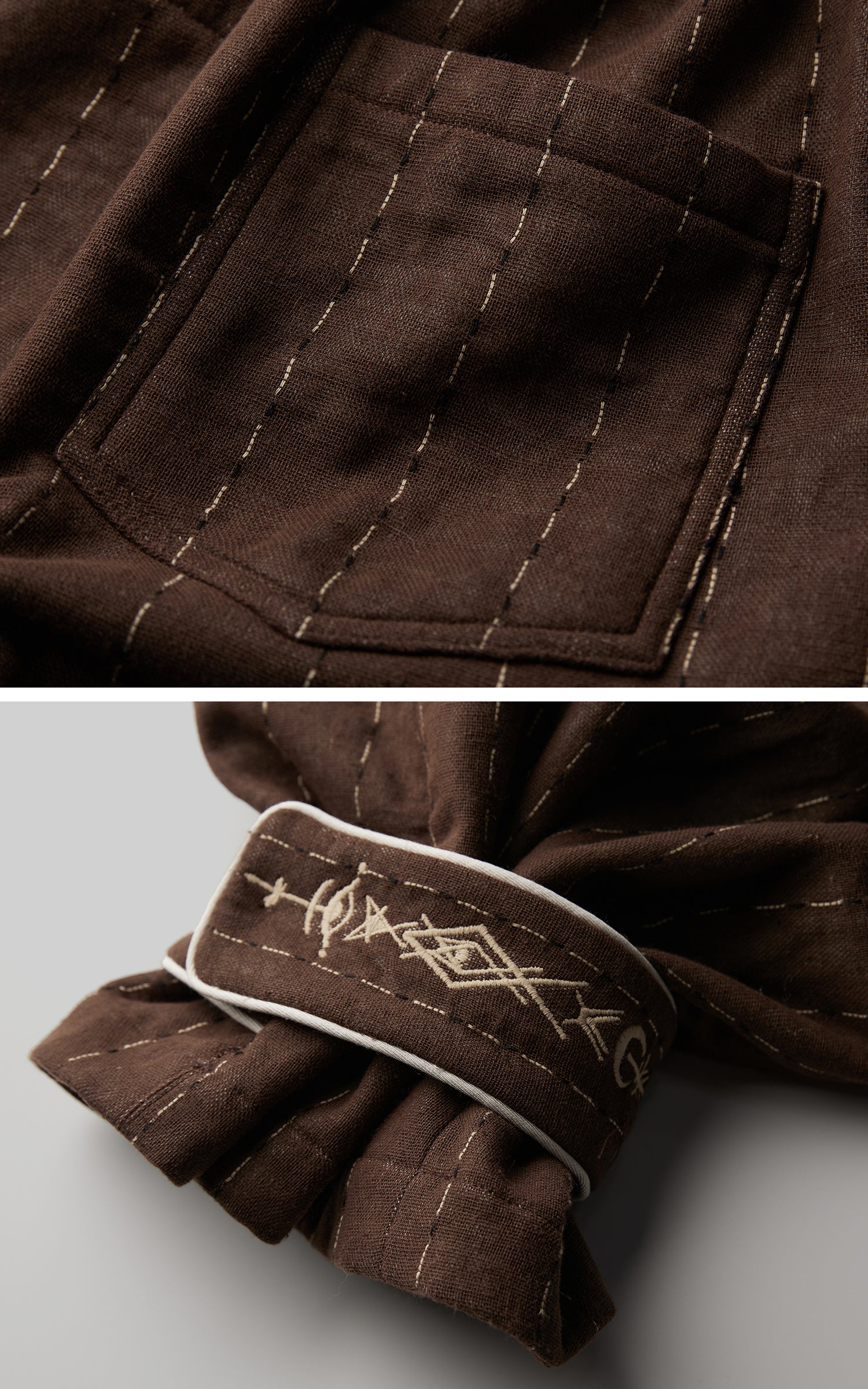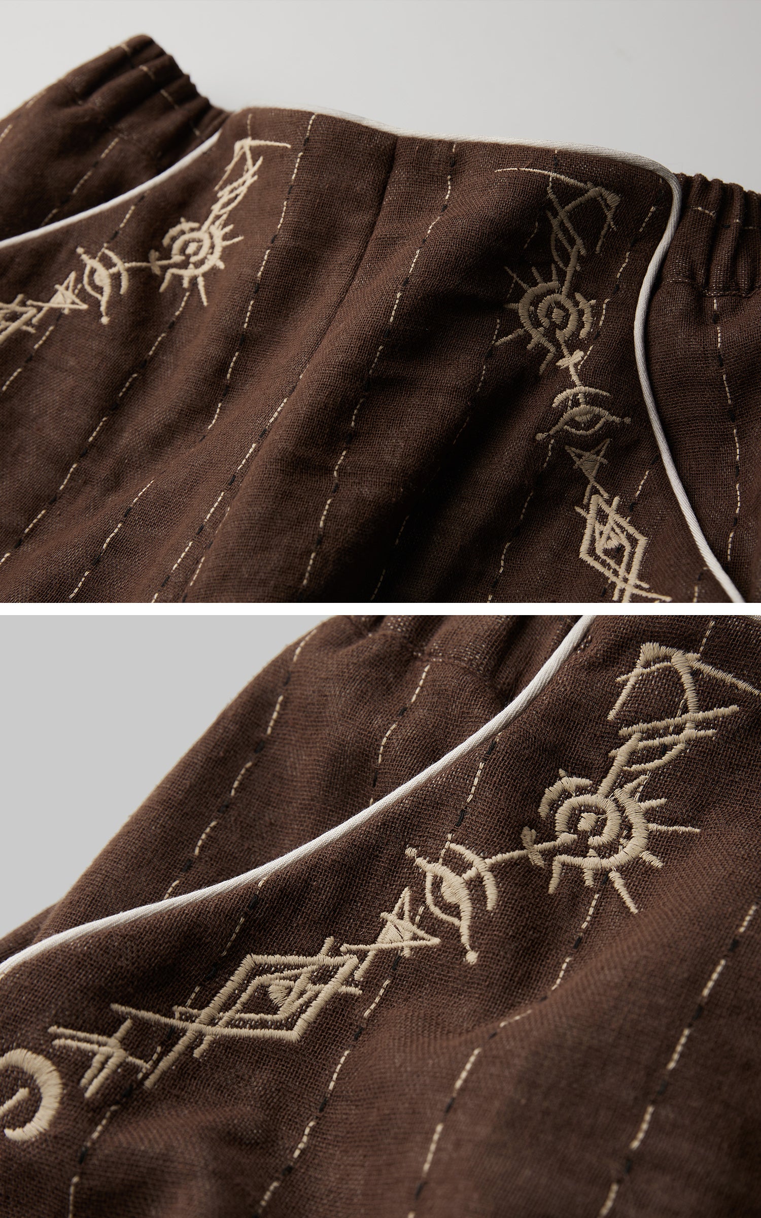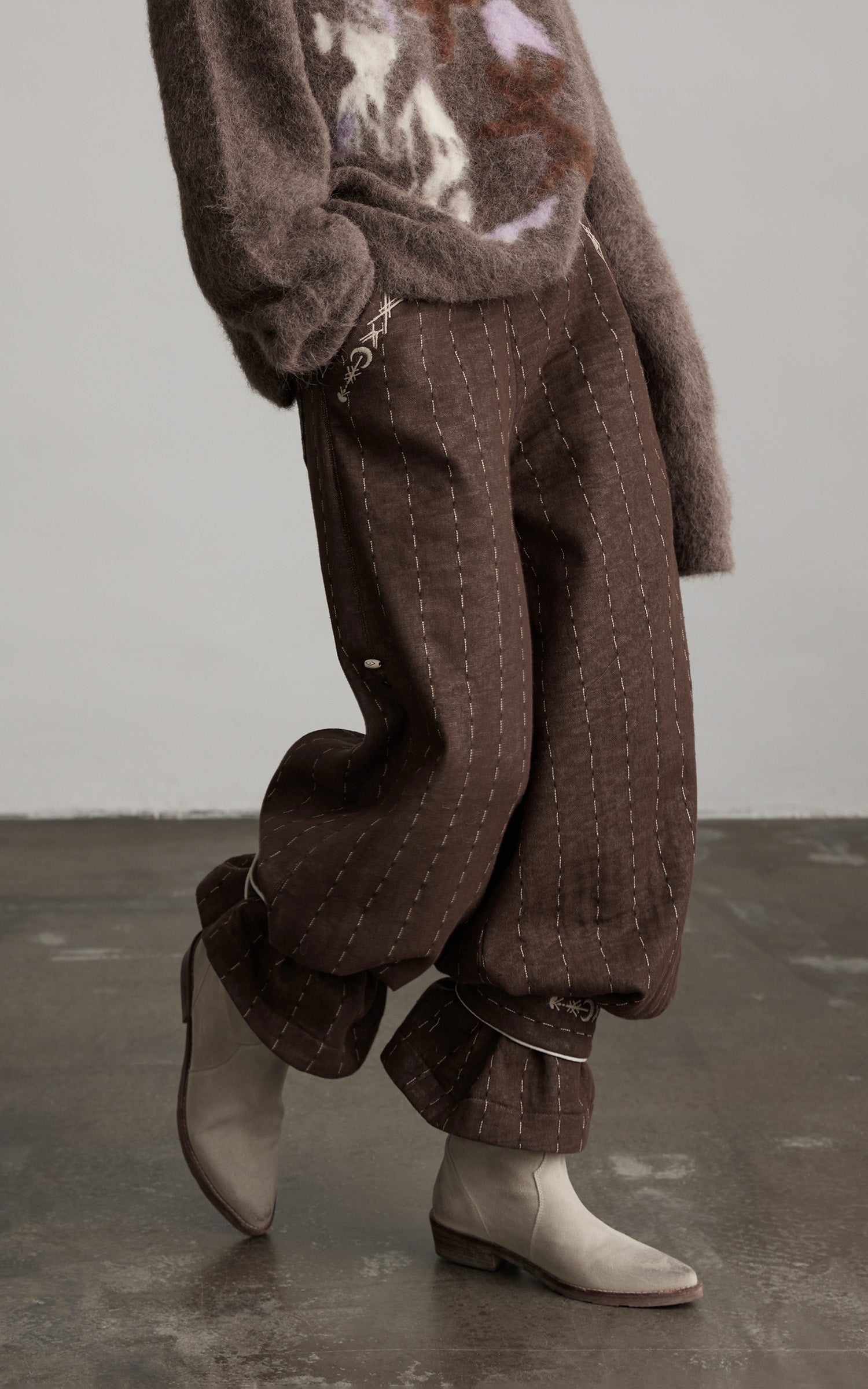 A wide, sculptural silhouette defines these trousers, shaped by vertical embroidered lines that evoke a ritualistic, hand-crafted order. The soft fabric drapes with weight and movement, while adjustable gathered hems create controlled volume at the ankles. Intricate symbolic embroidery frames the waist and side panels, offering a precise yet atmospheric balance between structure and fluidity. Designed for layered, monochrome styling with a quiet, grounded presence.