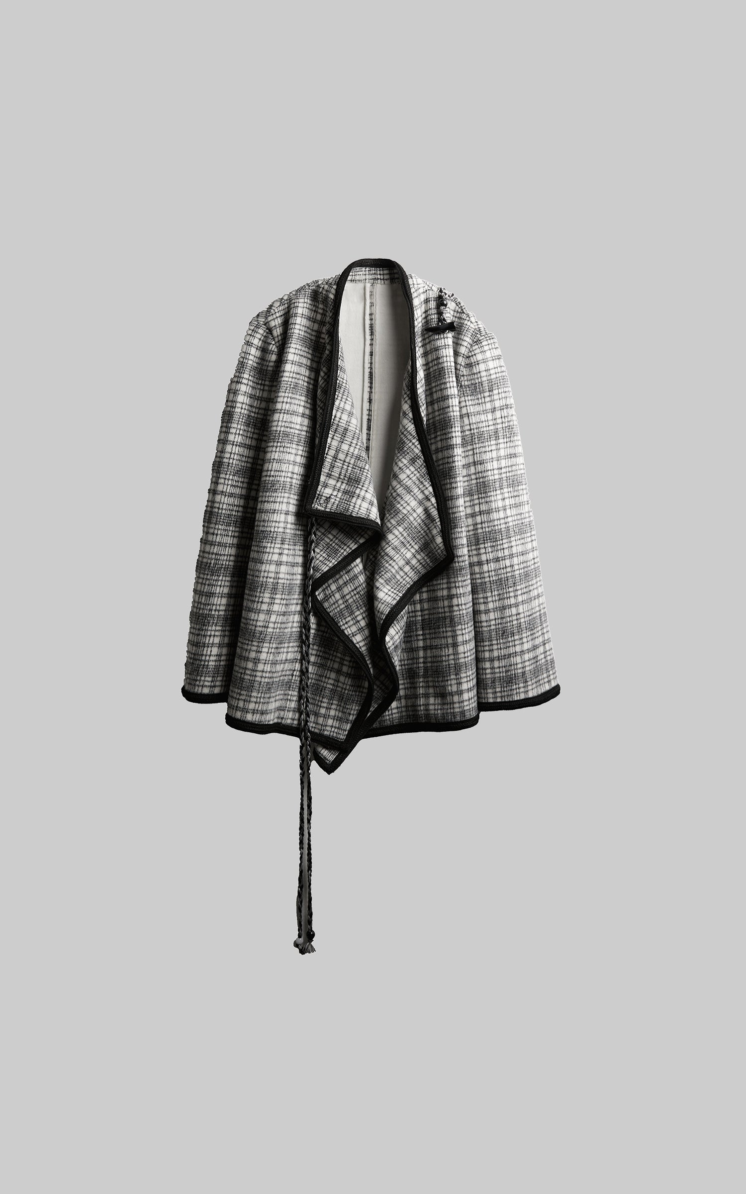 A sculpted plaid jacket built around weight and presence, shaped with an asymmetric front fold that drapes like armor. The dense fleece lining adds a muted warmth, grounding the piece in winter heaviness, while the braided closure traces a sharp diagonal across the body. Edges are framed with contrasting trims, creating a hardened silhouette that moves between structure and collapse. Designed for layered, atmospheric dressing.