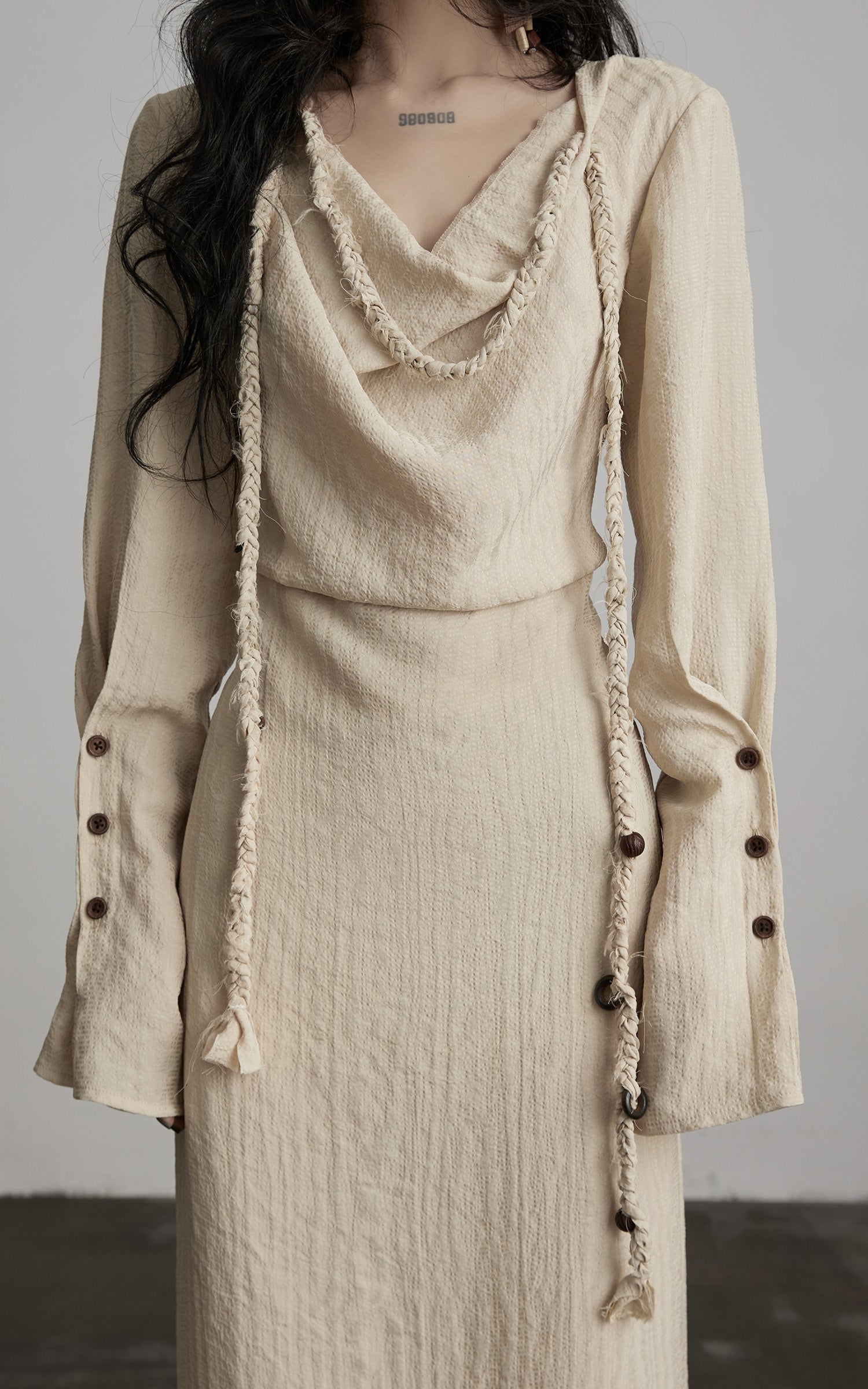 A study in tactility and restraint, this dress combines the weightless flow of textured cotton with a sculptural draped neckline. The hand-braided cords trace along the edges, embellished with wooden beads that resonate with primitive craft. Elongated cuffs close with tonal buttons, and the fabric’s uneven weave creates a lived-in, organic surface. The silhouette follows the body lightly, evoking quiet ritualistic poise—an echo of fragility, permanence, and time-worn grace.