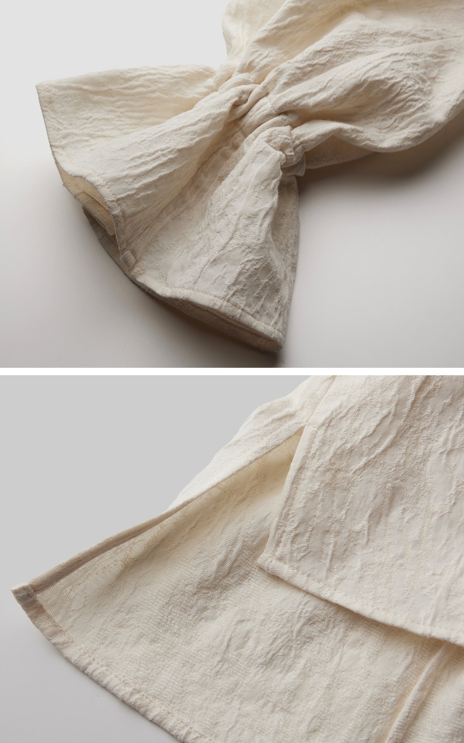 This blouse is shaped from a textured, crinkled fabric that carries a quiet, organic irregularity. The high ruffled collar frames the neckline with subtle elevation, while the gathered sleeves extend into soft, flared cuffs tightened by delicate drawstrings. Wooden-inspired buttons and corded ties add a raw, handcrafted tension to the otherwise gentle volume. The silhouette drapes with calm looseness, shifting between pastoral softness and restrained avant-garde structure. Designed to layer into muted, winter tones, it brings a quiet presence with sculpted lightness.