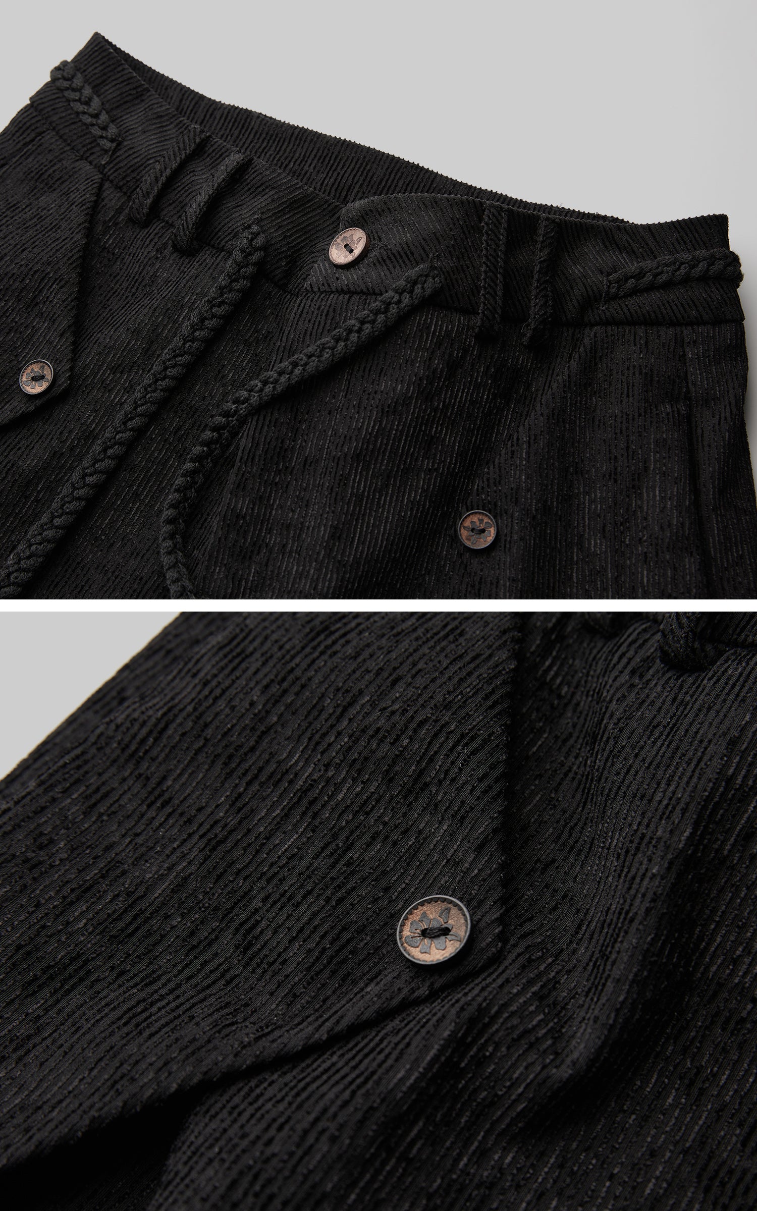A pair of wide-leg trousers shaped with fluid draped panels, cut from a textured fabric that shifts subtly with motion. The silhouette feels grounded yet weightless, anchored by braided rope accents and low-set buttons that trace the structure. Soft folds build a quiet volume, creating a shadowed architecture around the legs. Designed for layered expression and atmospheric movement, it carries a sense of restraint and dark romanticism.